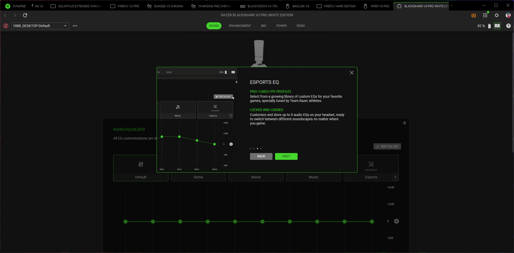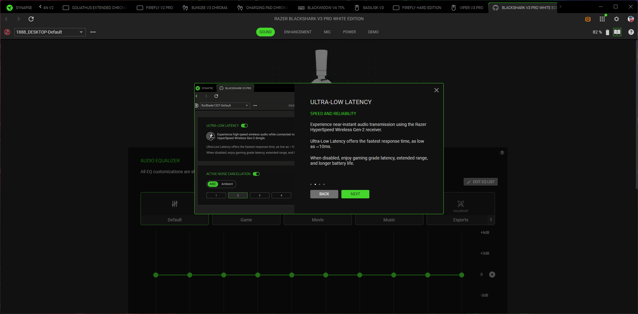 Приложение Razer Synapse 4 остается мощным компонентом экосистемы Razer. Для BlackShark V3 Pro программа раскрывает весь потенциал гарнитуры, предоставляя доступ к глубоким настройкам звука, микрофона и дополнительных функций. Интерфейс интуитивный с четкими вкладками для различных категорий настроек. А начинается все с подсказок по самым интересным особенностям модели:
