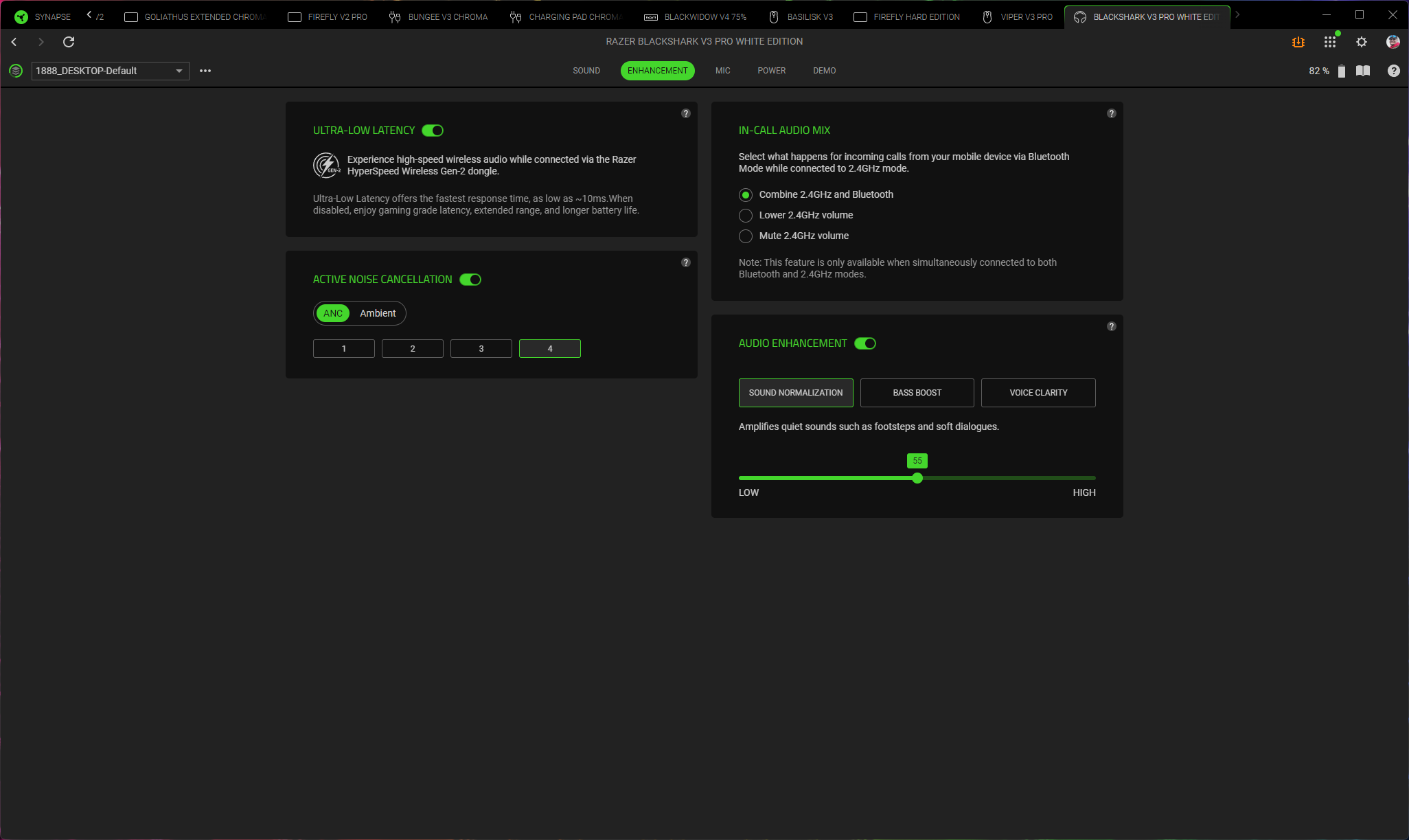 Раздел Enhancement включает включение функции ультранизкой задержки через HyperSpeed Wireless Gen‑2, настройки поведения принятия звонков через Bluetooth и три ключевые функции усиления звука. Sound Normalization выравнивает громкость различных источников, предотвращая резкие скачки при переключении между приложениями. Bass Boost добавляет мощности низким частотам для любителей более насыщенного звука, хотя это может повредить позиционной точности в соревновательных играх. Voice Clarity улучшает разборчивость диалогов и командного чата, поднимая средние частоты. Также здесь присутствует секция Active Noise Cancellation, предлагающая четыре уровня интенсивности шумоподавления плюс «прозрачный» режим Ambient.