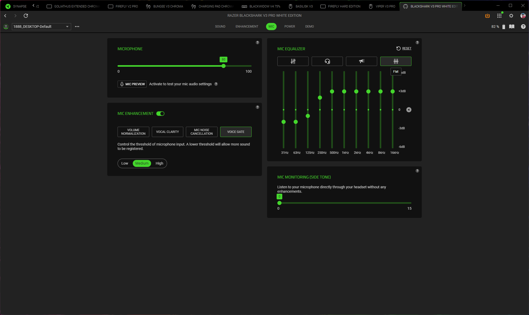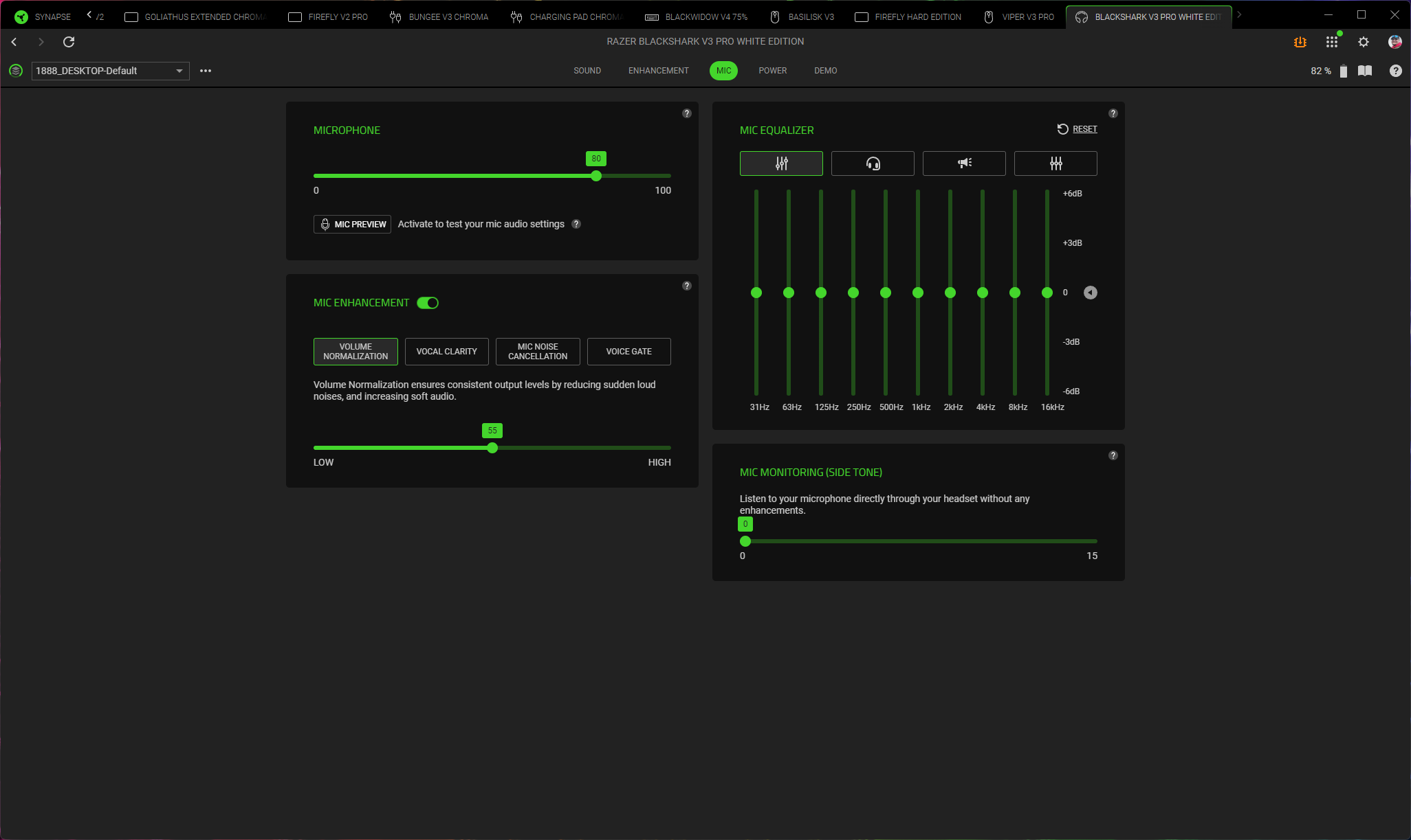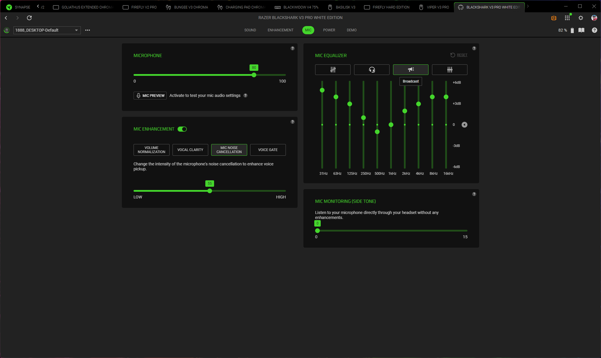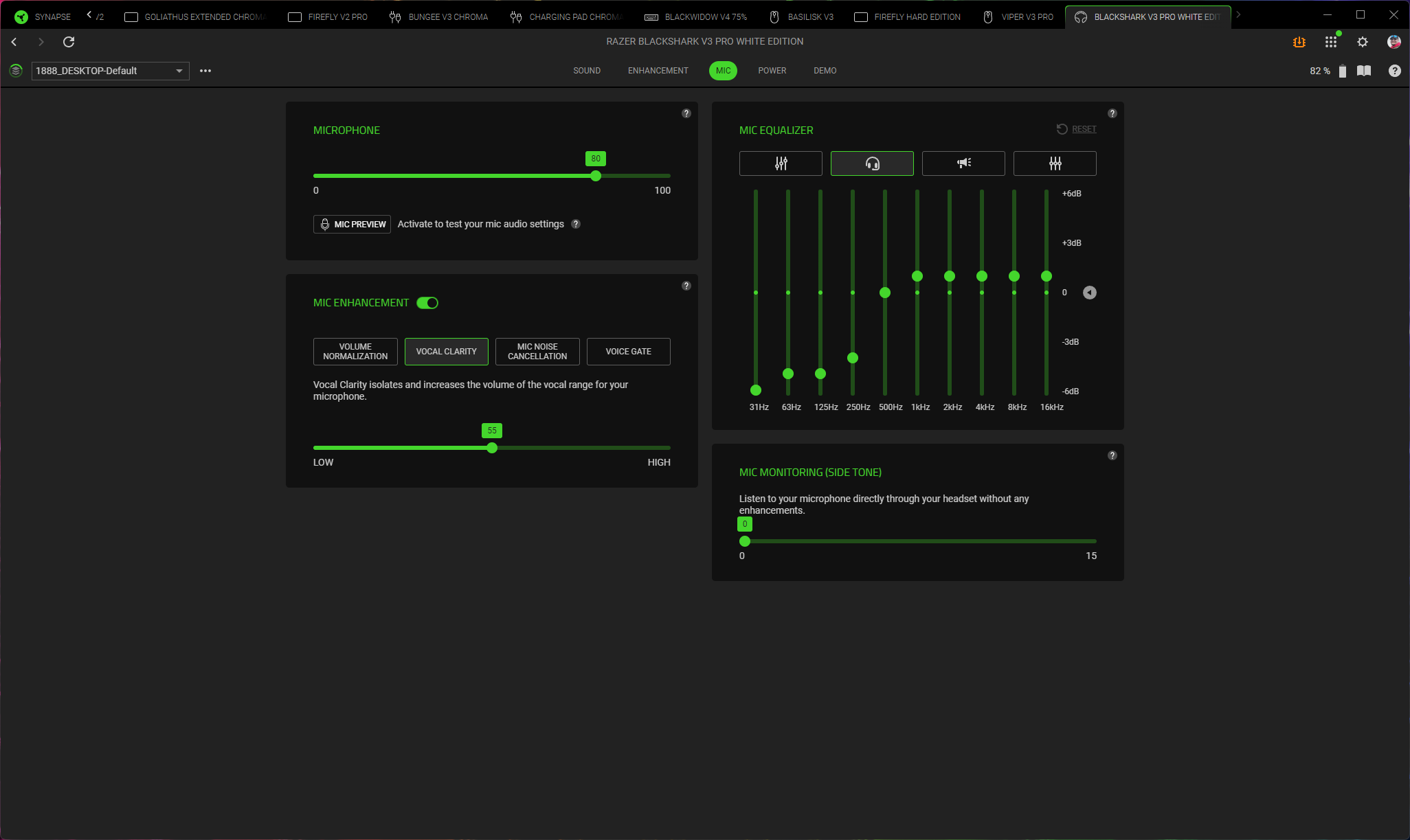 Раскрытие потенциала микрофона требует погружения в настройки Synapse. Программа предлагает отдельный 10-полосный эквалайзер для микрофона с пресетами Broadcaster и Esports. После правильной настройки, обычно путем поднятия частот в диапазоне 2–8 кГц и снижения нижних средних частот, микрофон начинает выдавать четкий, насыщенный голос с естественным тембром. Качество после настройки действительно впечатляет, конкурируя с отдельными USB-микрофонами начального уровня. Отсутствие аппаратного шумоподавления микрофона компенсируется программными фильтрами в Synapse, включая Volume Normalization, Vocal Clarity, Voice Gate и Mic Noise Cancellation. Эти функции работают с разной эффективностью, причем Voice Gate лучше всего справляется с фоновым шумом, полностью выключая передачу звука при отсутствии речи. Однако в шумной среде микрофон все еще может улавливать звуки механической клавиатуры или клики мыши во время разговора.