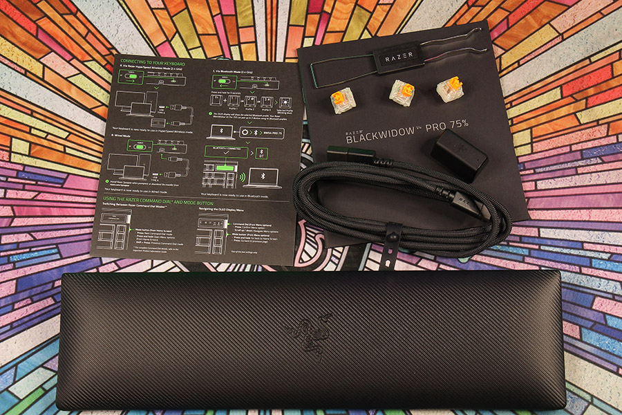 Главная техническая особенность Razer Blackwidow V4 Pro 75% это не экранчик, а поддержка трех типов подключения: проводного через USB (для чего в комплекте есть кабель USB-C/USB-A), Bluetooth 5.1 (с памятью на три устройства) и радиоинтерфейсом 2,4 ГГц с отдельным адаптером Razer Hyperpolling Wireless, что обеспечивает «геймерскую» частоту опроса в 4000 Гц.