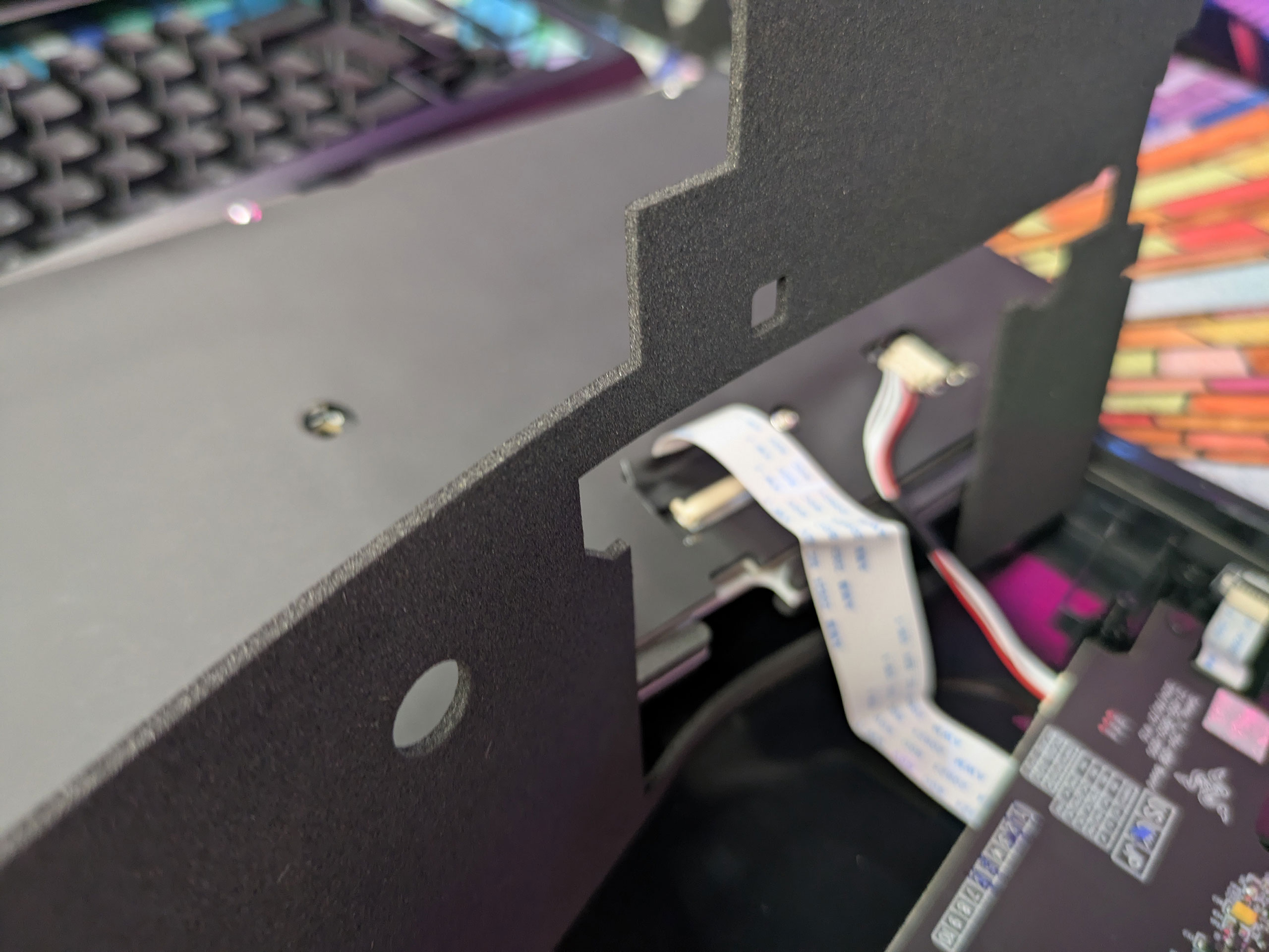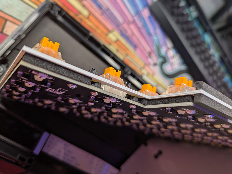 После снятия верхней рамки открывается вид на внутренности. В первую очередь, стоит отметить метод крепления gasket-mount, при котором сэндвич компонентов держится в корпусе через мягкие прокладки по периметру и, таким образом, смягчает ощущения и звук при тайпинге. Во вторую очередь, интересно также, что Razer покрасила плейт из материала FR4 в белый цвет, чтобы усилить эффект от подсветки. Даже винтики, которые держат плату и плейт вместе, окрашены в белый.