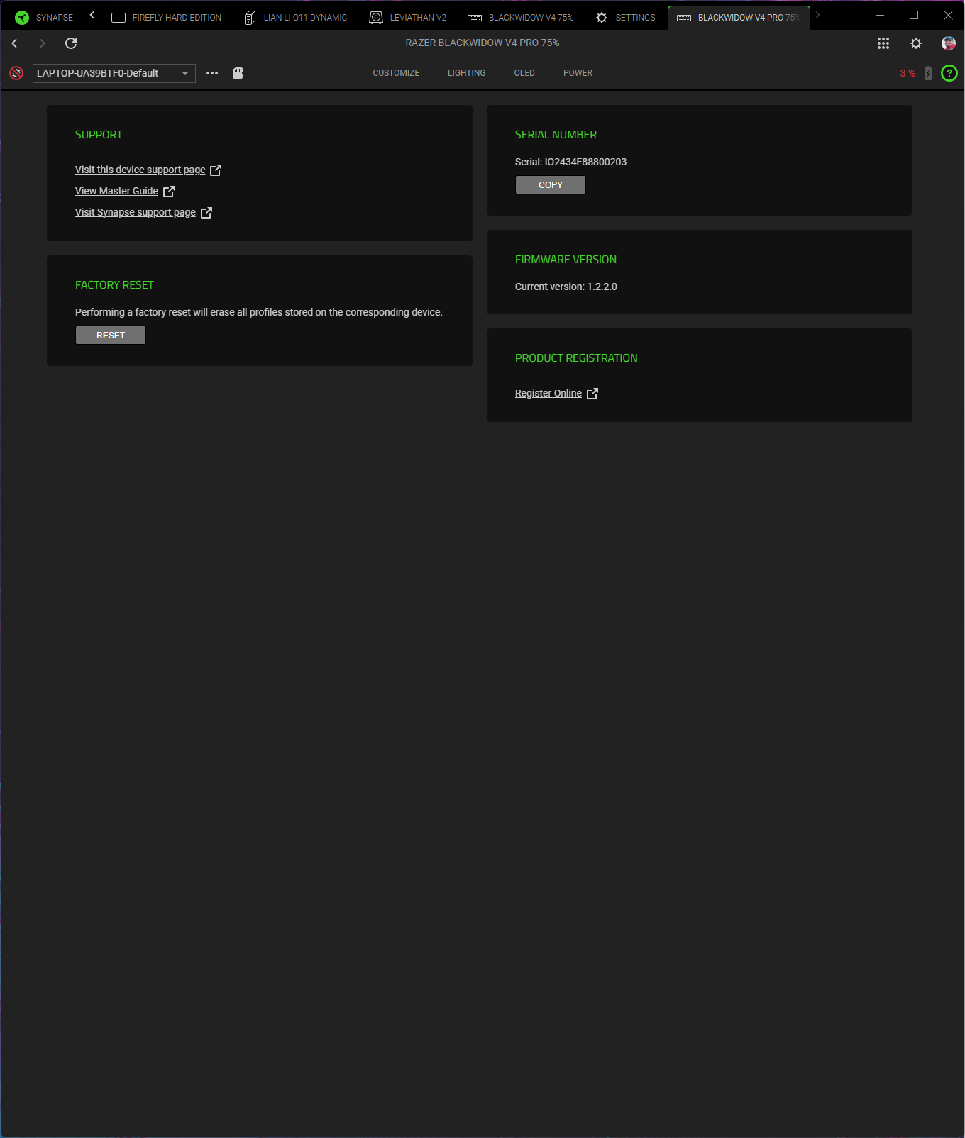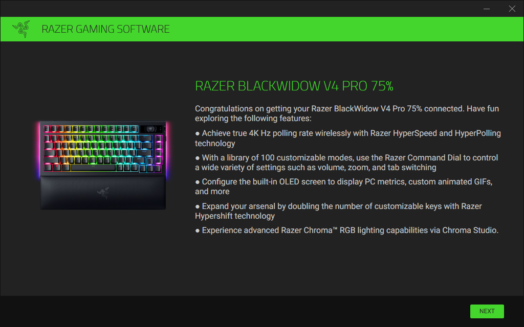 Razer Synapse 4 позволяет хранить до пяти отдельных профилей в собственной памяти клавиатуры и переключаться между ними независимо от наличия самого приложения — это очень полезно, если Blackwidow V4 Pro 75% используется с несколькими устройствами, например, ПК и консолью. Также, Synapse позволяет привязать профили к конкретным играм в библиотеке пользователя для автоматического переключения.