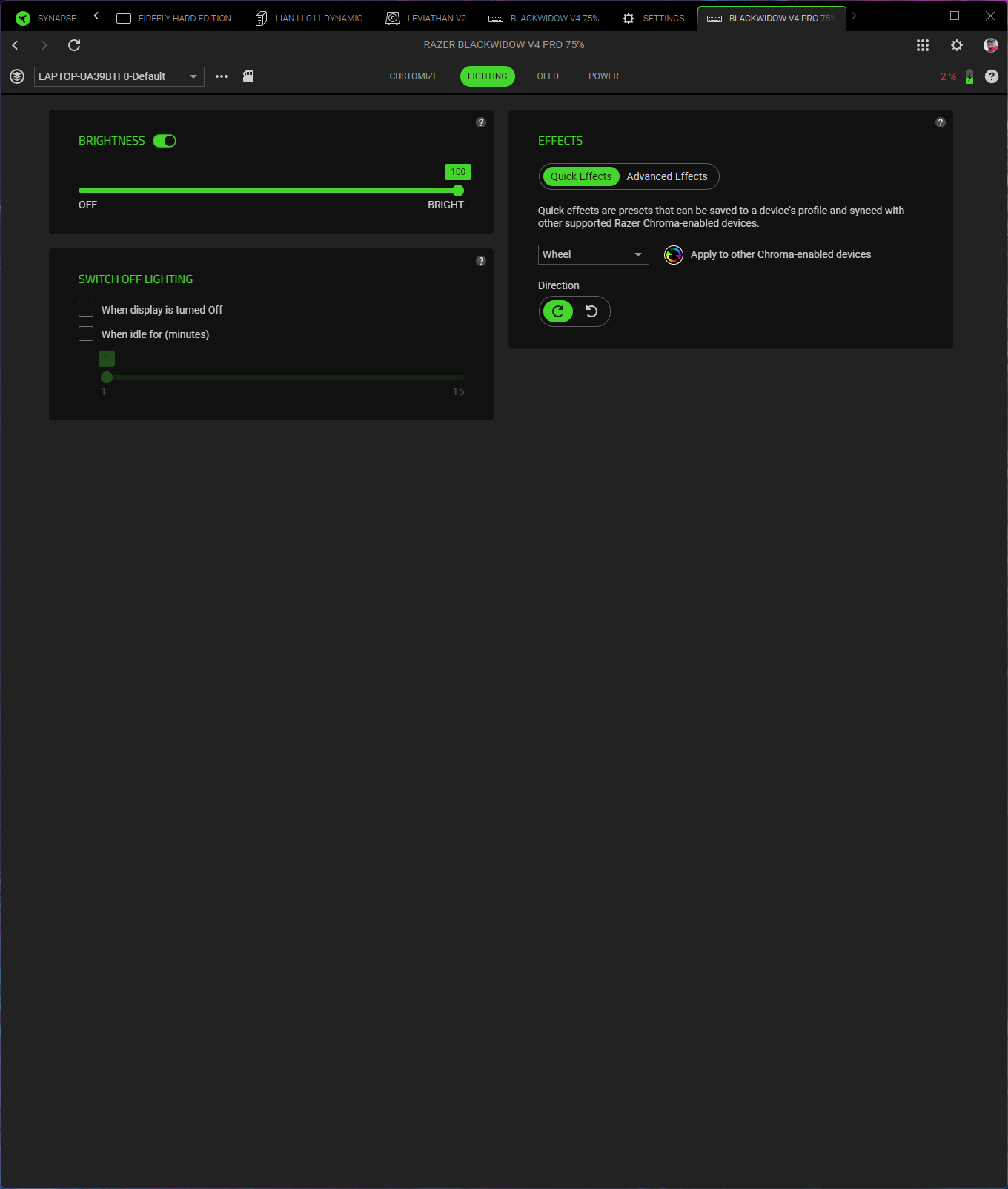 Закладка Lighting предлагает настроить яркость, правила выключения (полезно для сохранения заряда батареи), и выбрать между более чем десятком эффектов Chroma — при этом сложные настройки происходят через Chroma Studio.