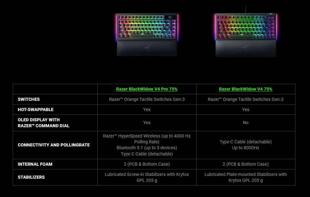 Перед тем, как перейти к впечатлениям о, собственно, новой клавиатуре, стоит окончательно снять вопрос сравнения с Blackwidow V4 75%. Уже официальная иллюстрация на сайте производителя дает ответ:
