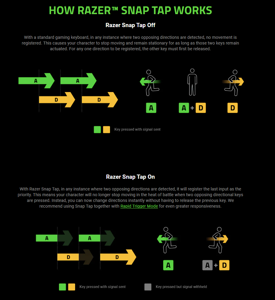 Интересно было также проверить новую функцию Razer Snap Tap. В отличие от других производителей, Razer удалось сделать это программно в Synapse 4, поэтому это не является эксклюзивной функцией именно с аппаратной точки зрения. Работает очень интересно и, действительно, такая мгновенная реакция на нажатие другой клавиши нужна в шутерах для резких стрейфов вправо-влево (то есть, когда при еще нажатой клавише «A» нажимается клавиша «D» и игрок начинает мгновенно двигаться в противоположную сторону). Впрочем, для многопользовательских игр стоит отслеживать, как разработчики относятся к snap tap и не приравнивают ли к читерству.