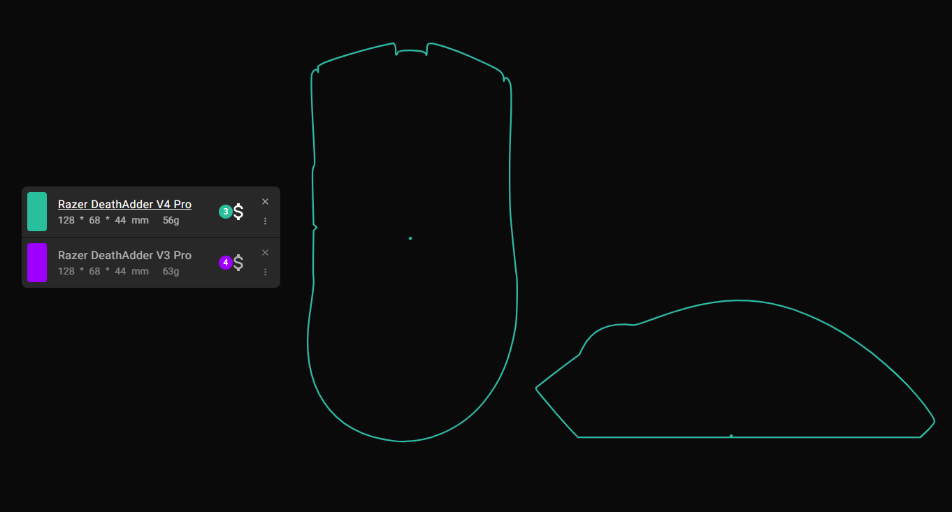 Форма в целом остается вопросом личных вкусов и привычек. Это большая мышь, заполняющая руку, она идеальна для хвата palm или claw, но может ограничивать микродвижения для игр с интенсивным прицеливанием. А может и не ограничивать, потому что здесь субъективность решает все — такие мыши или любят, или ищут что-то компактнее. В любом случае, «безопасная» форма теперь статистически подходит большему количеству людей, чем проприетарное переосмысление эргономики у ранних DeathAdder. На то она и «безопасная». Скриншот с eloshapes.com напоминает, что профиль V4 Pro абсолютно идентичен V3 Pro: