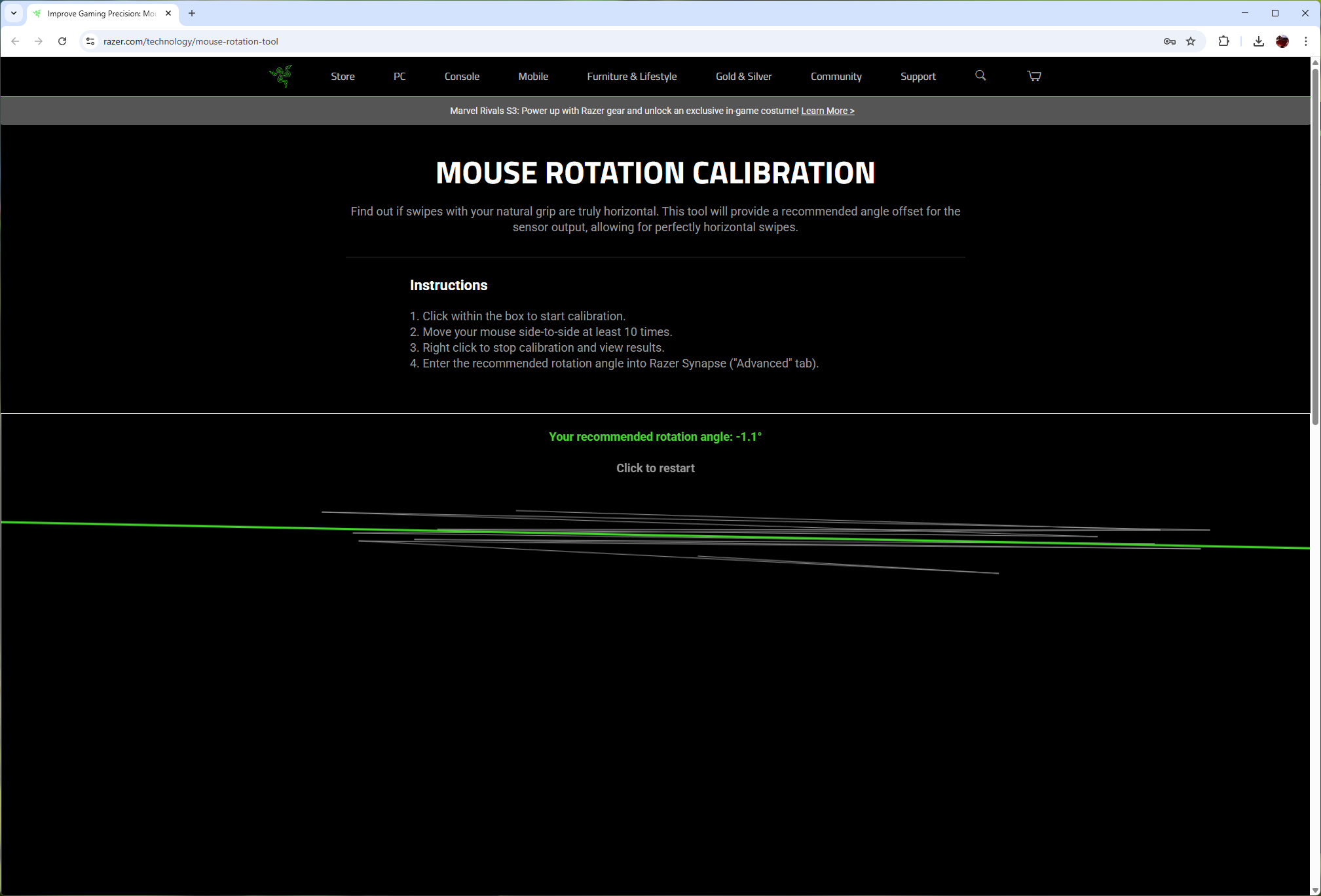 Что касается программных настроек сенсора Focus Pro 45K Gen‑2, то функция Dynamic Sensitivity поначалу дезориентирует, но после адаптации может дать уникальную гибкость. Rotation Tool — настоящая находка для тех, кто держит мышь не идеально горизонтально. Razer предлагает отдельный веб-инструмент для тестирования. Возможно, пользователь даже не осознает собственные отклонения при движении, пока калибровка не исправит их. В случае автора обзора, инструмент показал отклонение около 1 градуса от вертикали, так что ничего существенного лично ощутить не удалось, но по отзывам других игроков иногда эта настройка творит чудеса.
