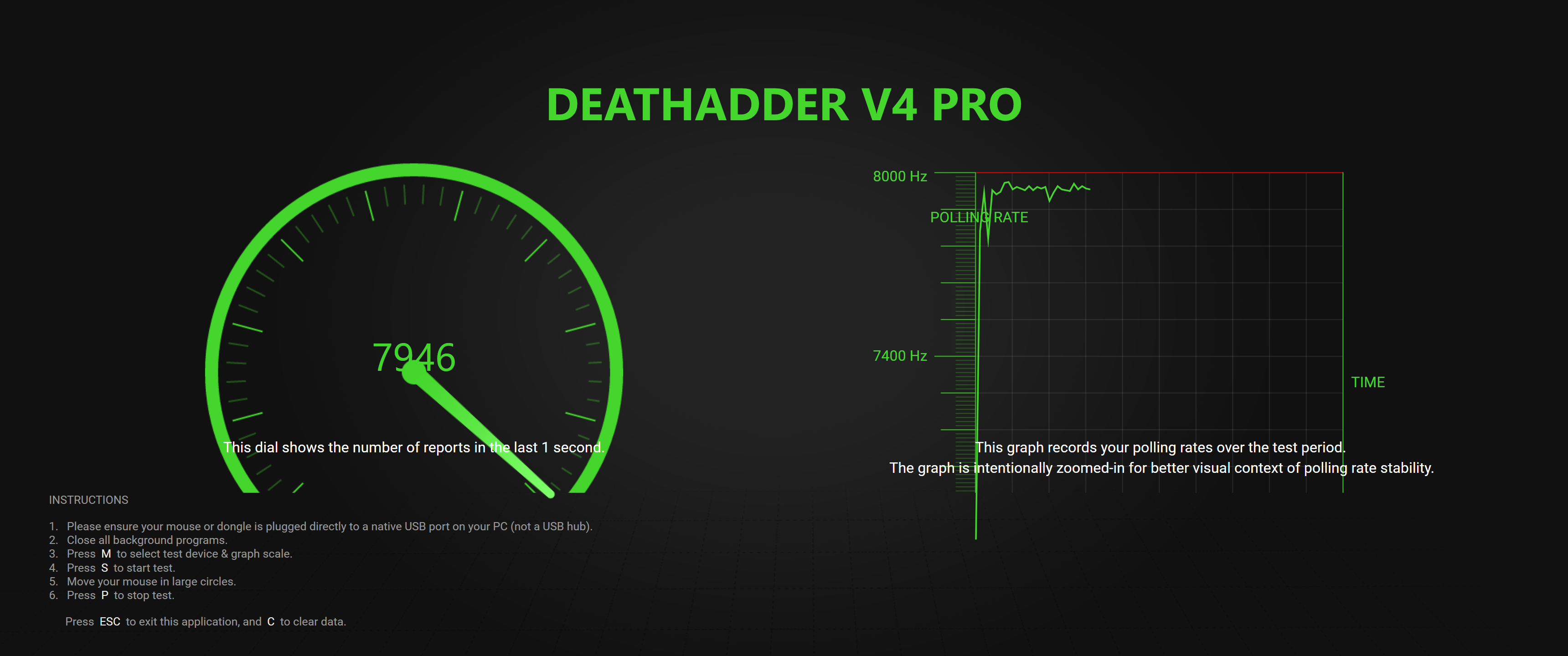 Как всегда, 8000 Гц выглядят футуристично на бумаге, но практическая разница мизерная. На 360 Гц мониторе едва заметное улучшение плавности курсора не стоит 7‑кратного падения автономности со 150 до 22 часов. Для большинства незаметная разница между 1000 и 8000 Гц не стоит ежедневной зарядки. С точки зрения фактической скорости, замеры подтверждают характеристики: