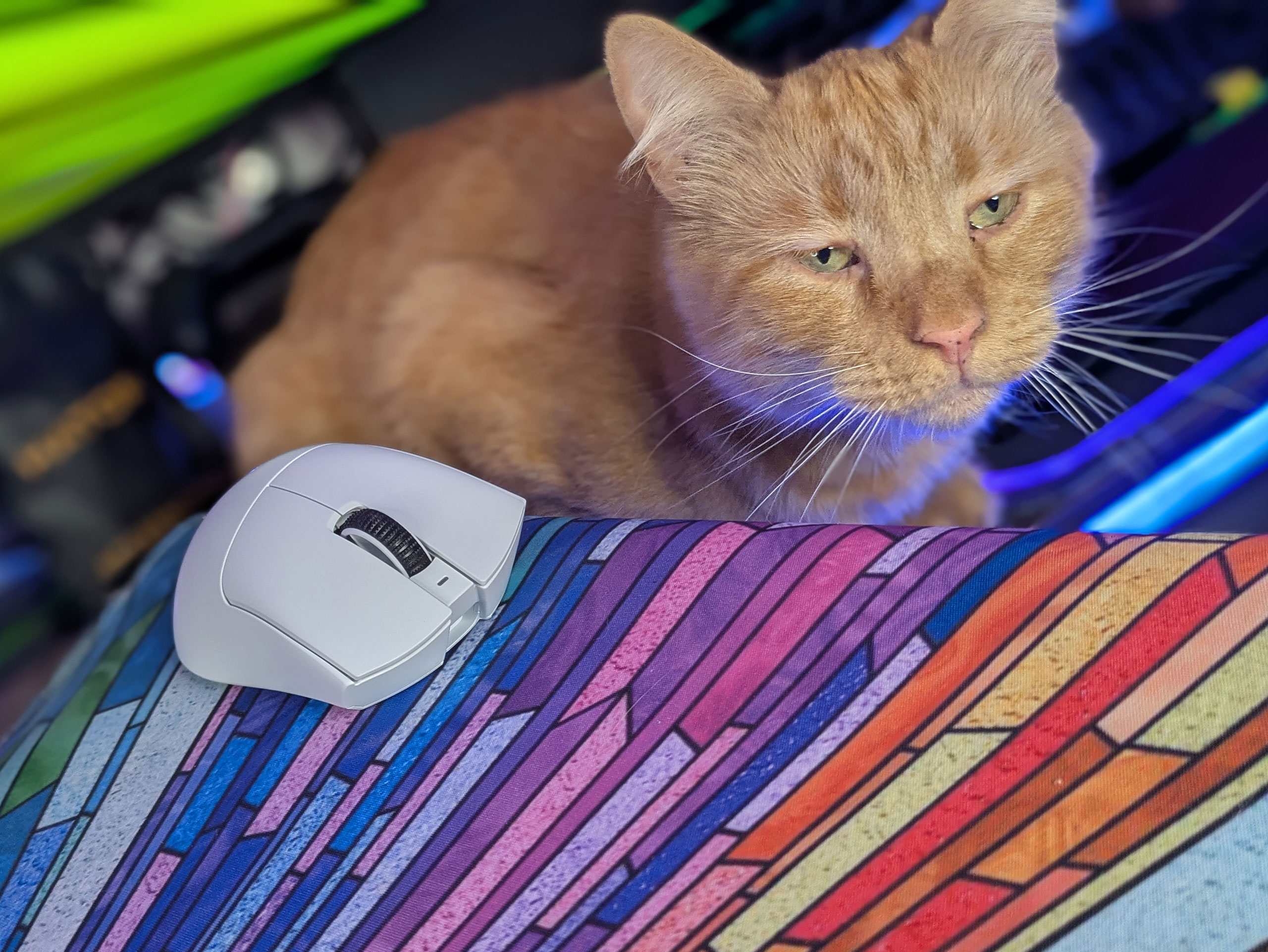 V4 Pro на 7 граммов легче V3 (56−57 г против 63 г) и эта разница ощутима, если уже есть привычка к ультралегким мышам. Заметно драматическое улучшение качества сборки. Никаких скрипов, прогибов, шатаний — корпус монолитный. Новое покрытие поначалу кажется скользким, но на самом деле обеспечивает уверенный контроль. Тем, кому этого не хватает, можно воспользоваться «грипсами» из комплекта.