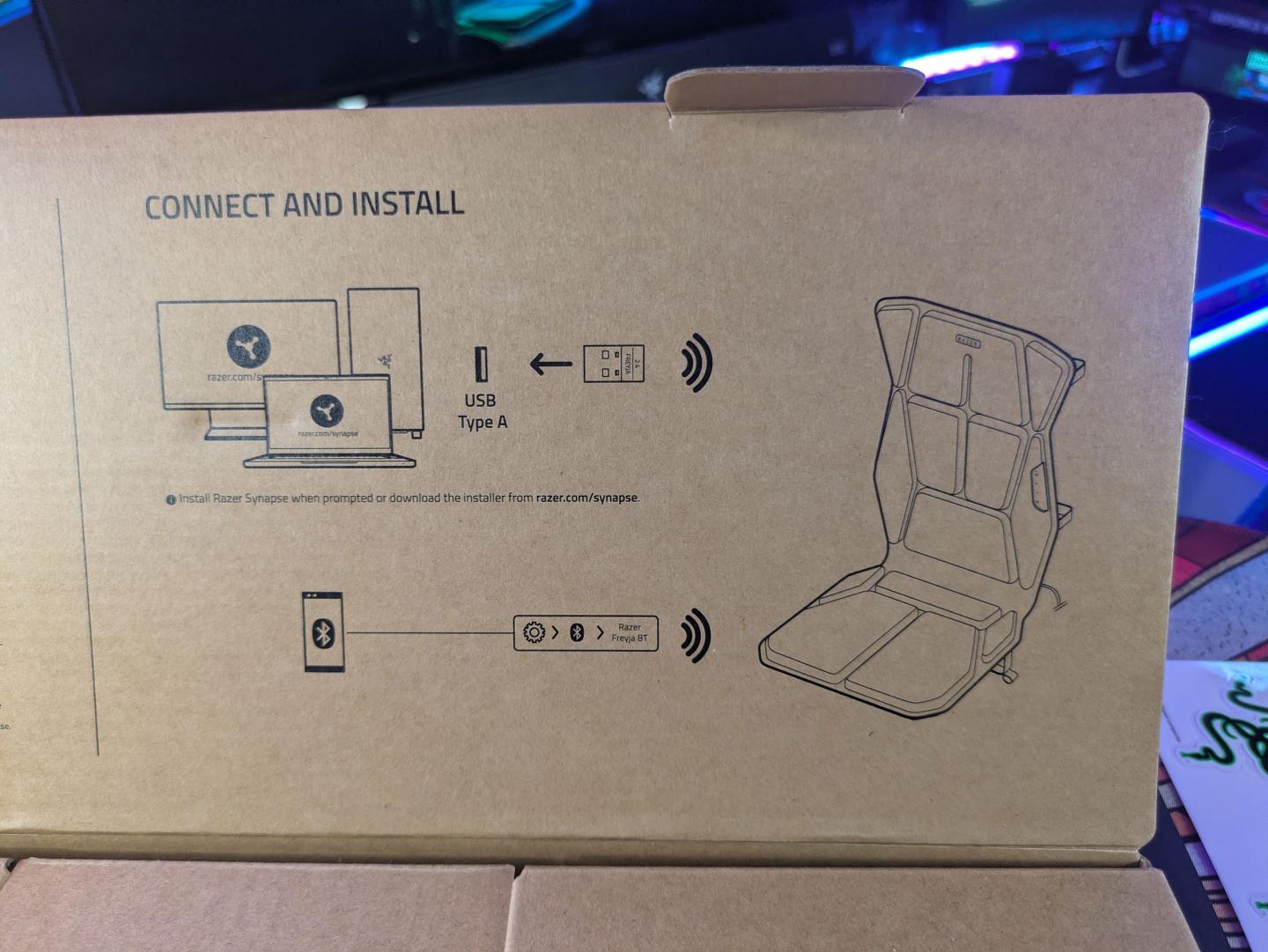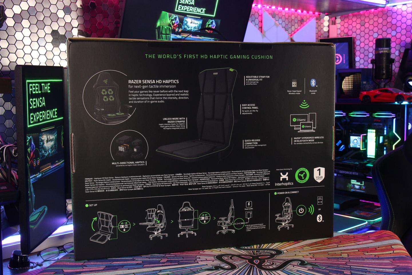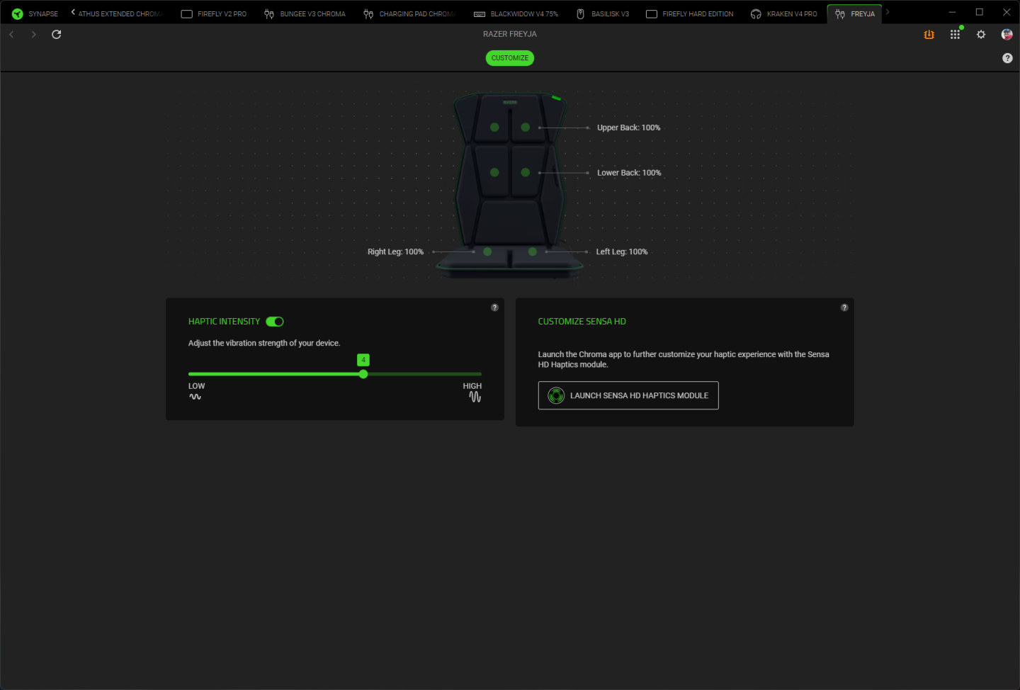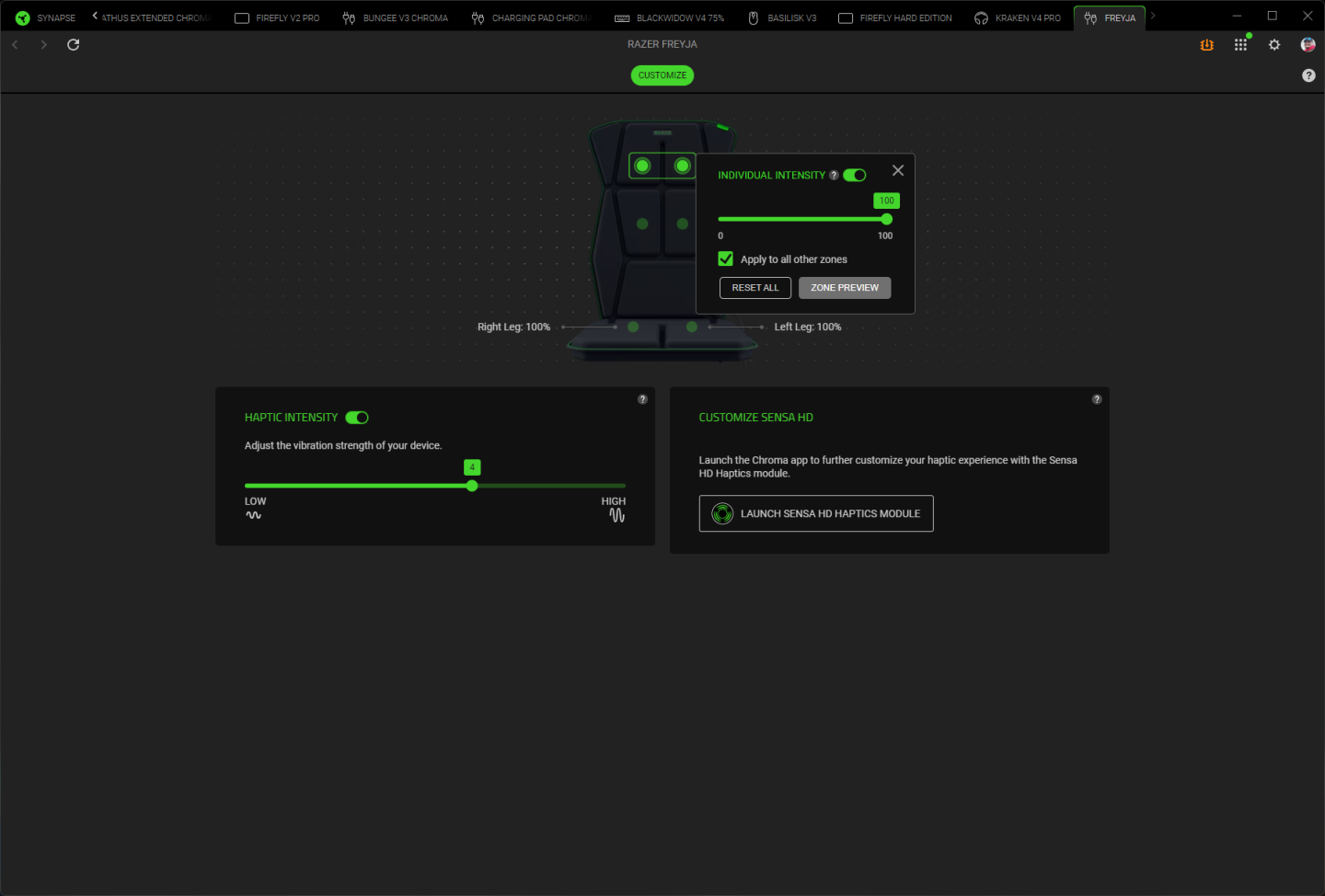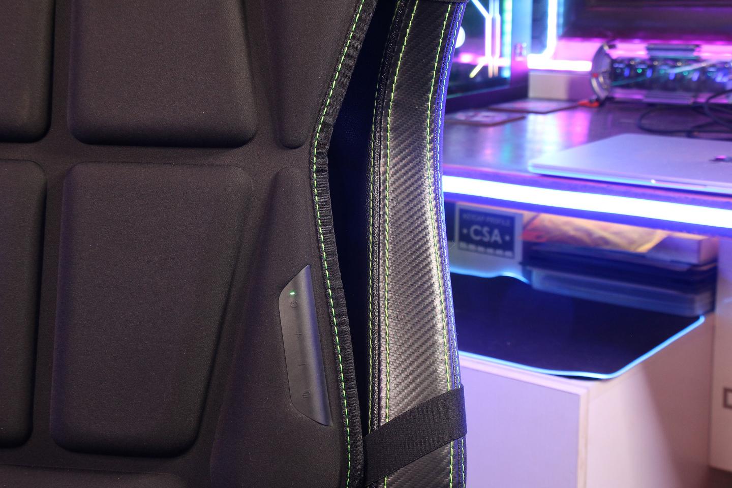 Панель управления расположена на левой стороне подушки. Она позволяет включать/выключать устройство, переключать режимы (HyperSpeed/Bluetooth) и регулировать интенсивность в семи уровнях. Более детальная настройка доступна через Razer Synapse 4, где можно регулировать интенсивность каждого актуатора отдельно от 0 до 100%. Переключение на Bluetooth нужно для того, чтобы работать с Android-смартфонами: для них существует геймпад Razer Kishi Ultra, который также поддерживает Sensa HD и поэтому вместе с Freyja мобильные геймеры также могут получить набор гаптического фидбека. Впрочем, в отсутствие второго устройства тестирование в Bluetooth-режиме не проводилось.