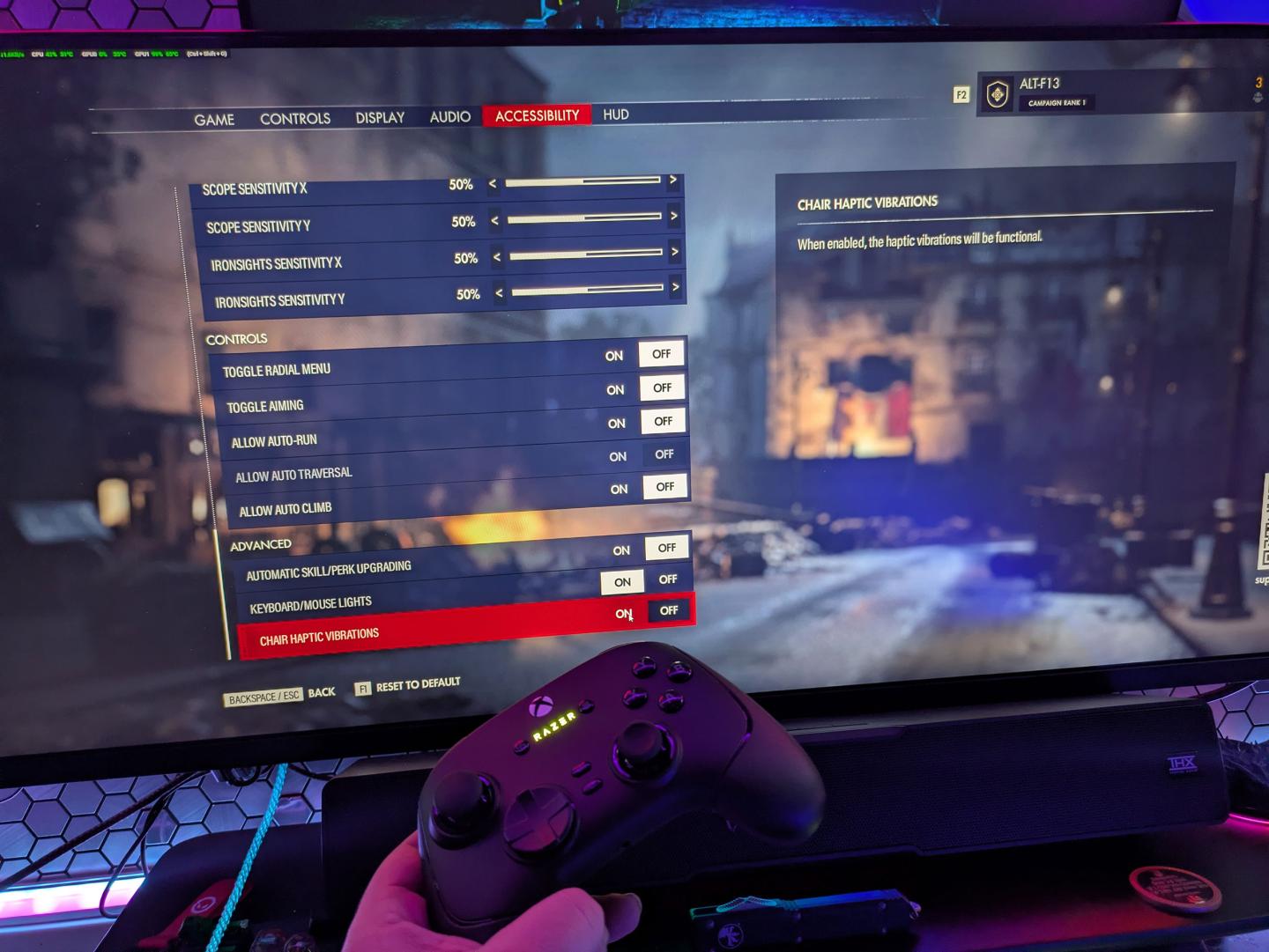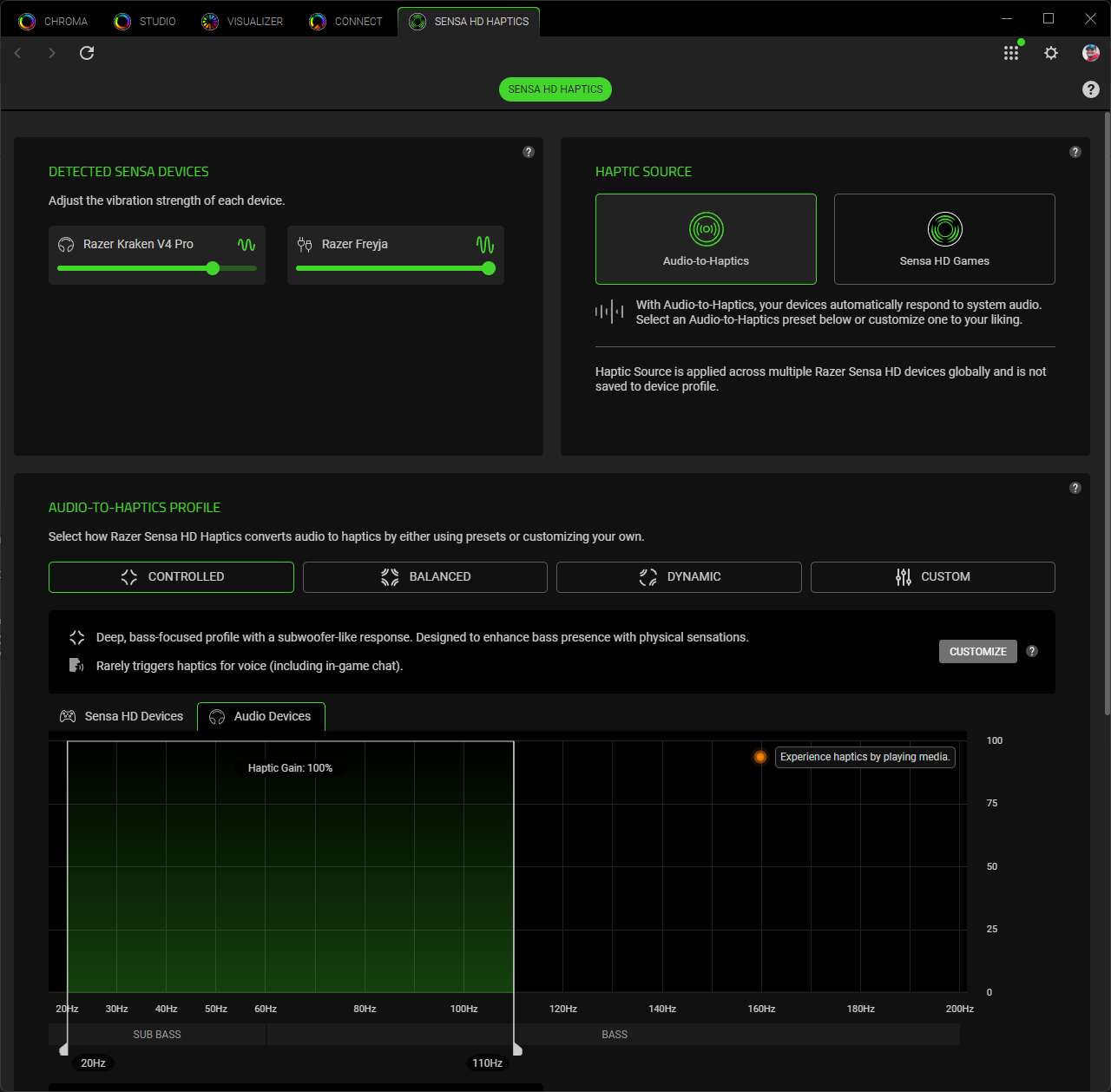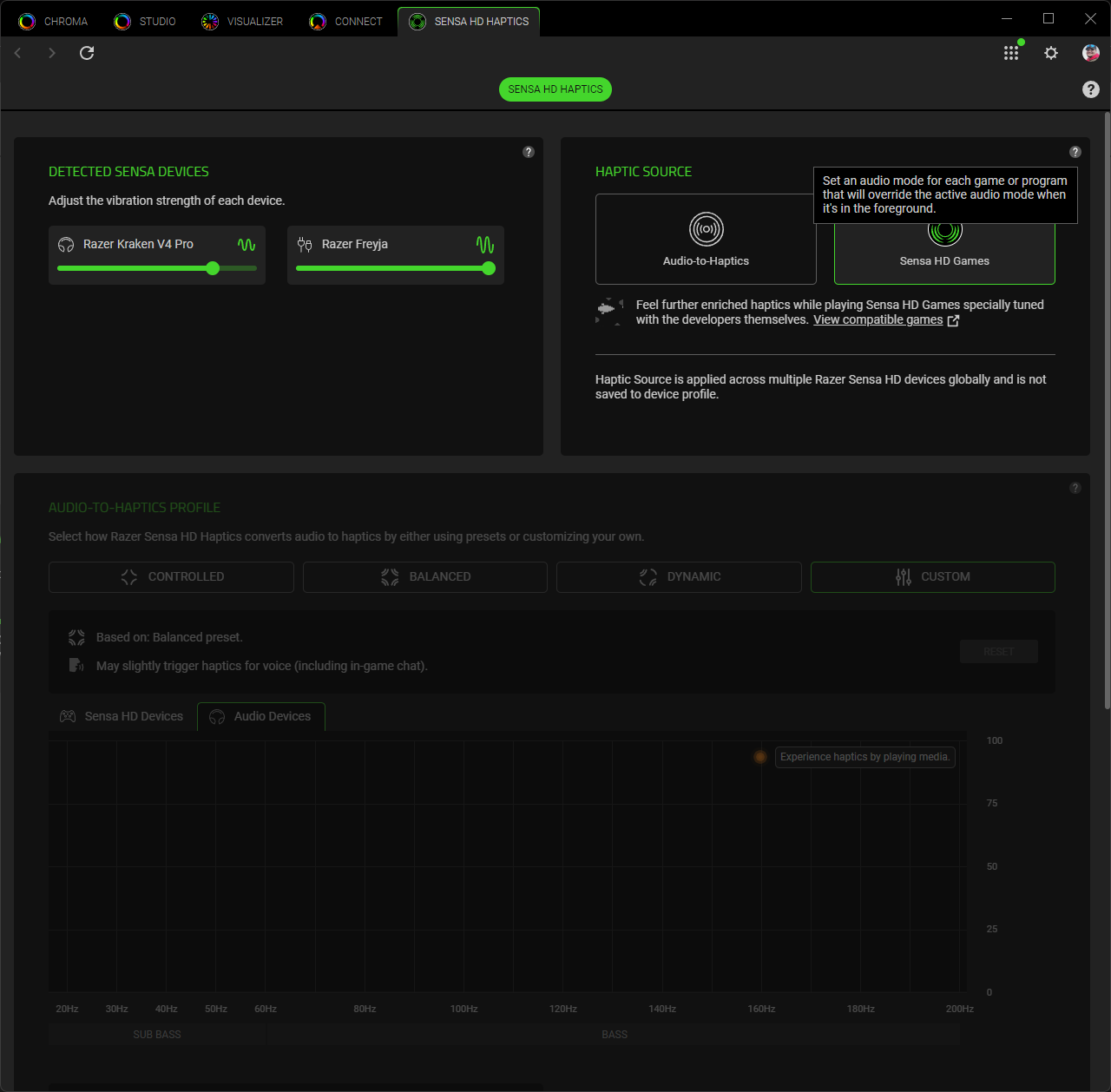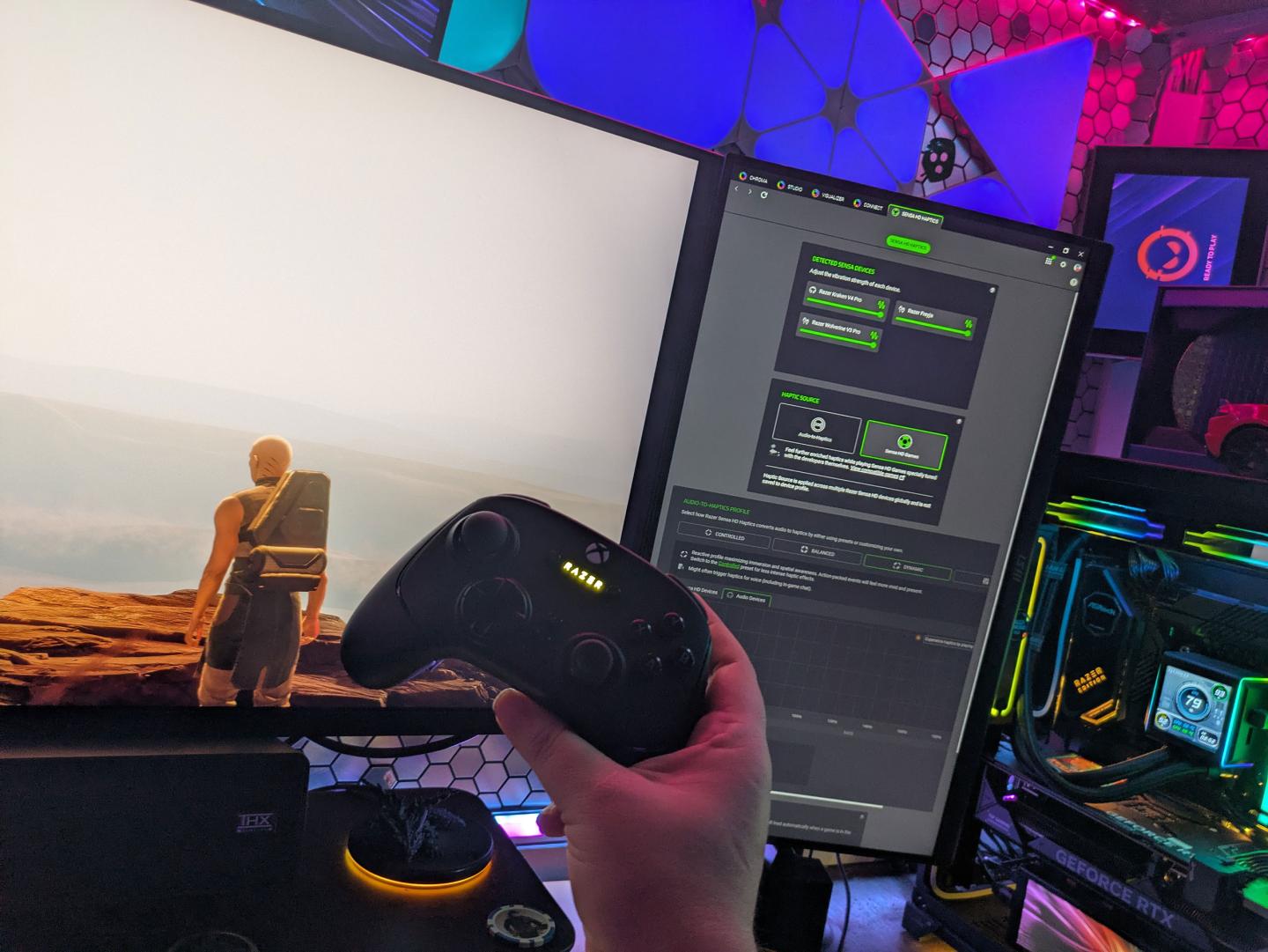 Как уже понятно, тестирование Sensa HD проводилось с комбинацией Razer Freyja на кресле Razer Iskur, геймпада Razer Wolverine V3 Pro и гарнитуры Razer Kraken V4 Pro, что обеспечивает максимальные на сегодня десять точек вибрационного контакта с телом. Для того чтобы Sensa HD заработала, необходимо иметь работающее на заднем фоне приложение Razer Synapse 4 и разрешение на работу Chroma Apps.