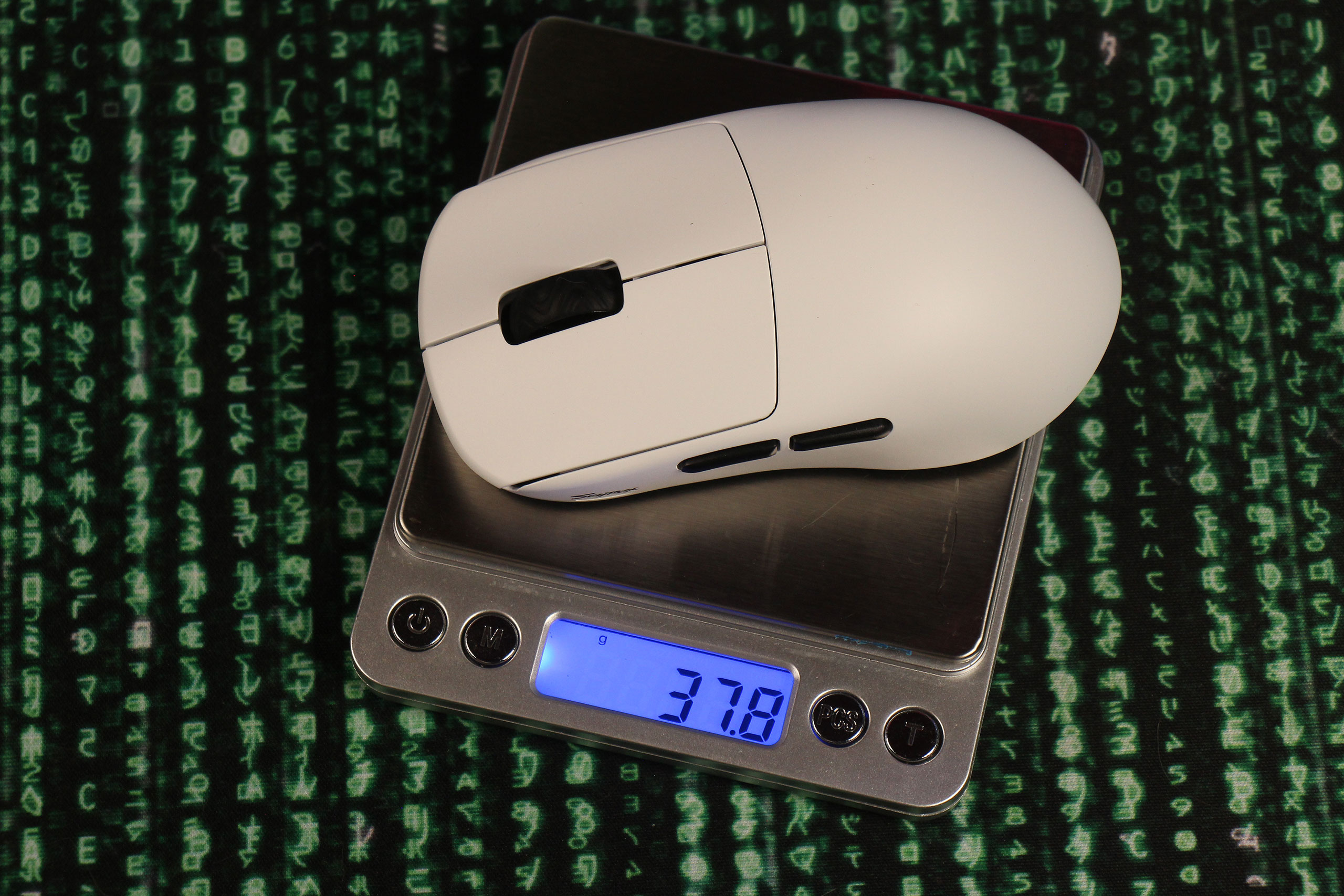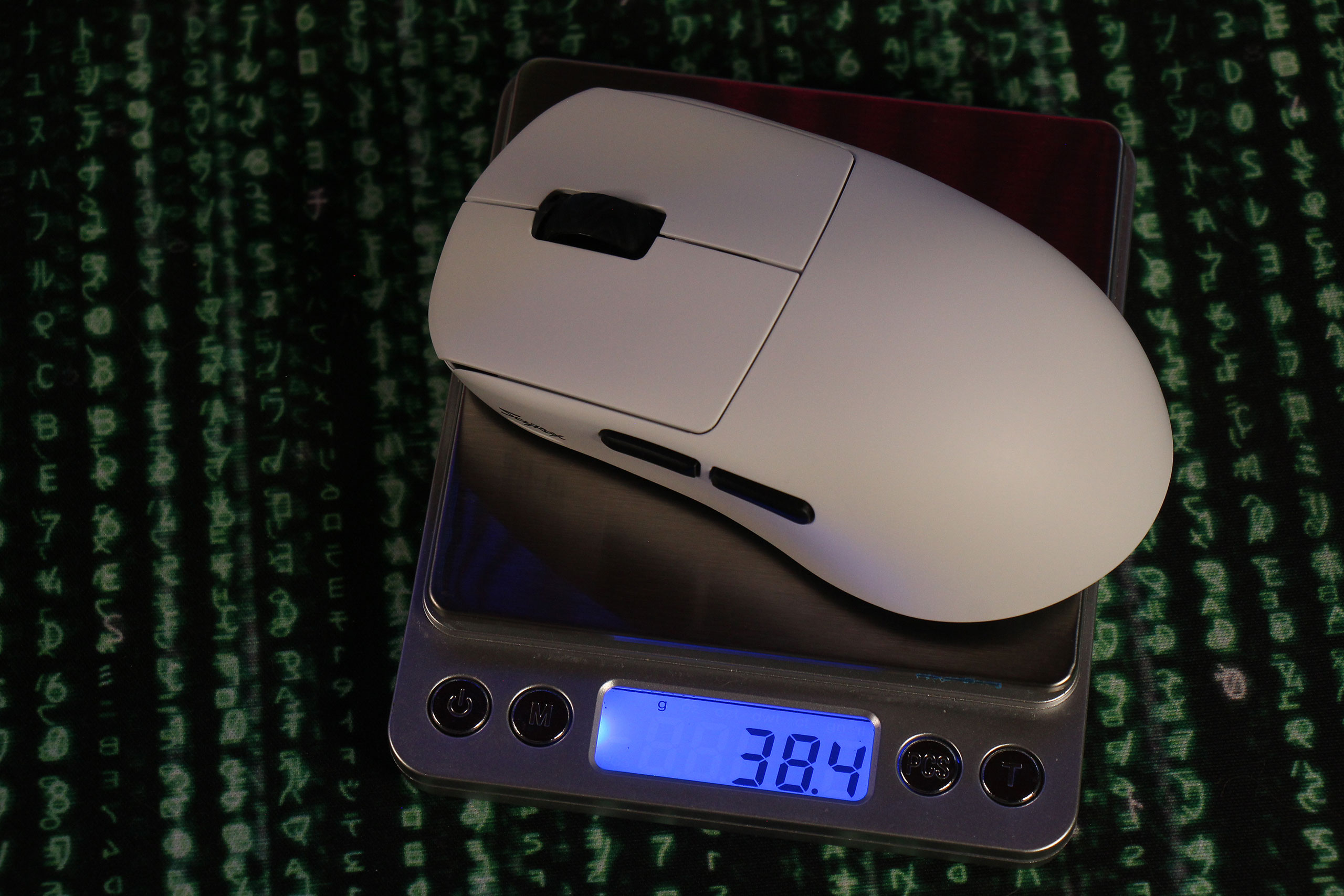 Первое, что поражает при знакомстве со Scyrox V8, это ее невероятная легкость. Заявленный диапазон 36±3 грамма является очень широким и с маркетинговой точки зрения 33–39 грамм выглядят не так привлекательно. Особенно интересно было бы узнать, вследствие чего именно производитель видит возможность получить «минус три»… Ибо фактически в том виде, как V8 достается из коробки, вес нашего экземпляра составлял 37,8 грамма. В рабочем виде мышь все еще укладывается в характеристики и замеренные 38,4 грамма с установленными «меньшими» ножками все еще ощущаются почти как воздух в руке. Ну, возможно это преувеличение, но мышь действительно очень легкая. При этом производитель добился такого веса без использования перфорации корпуса, сохранив сплошную конструкцию.