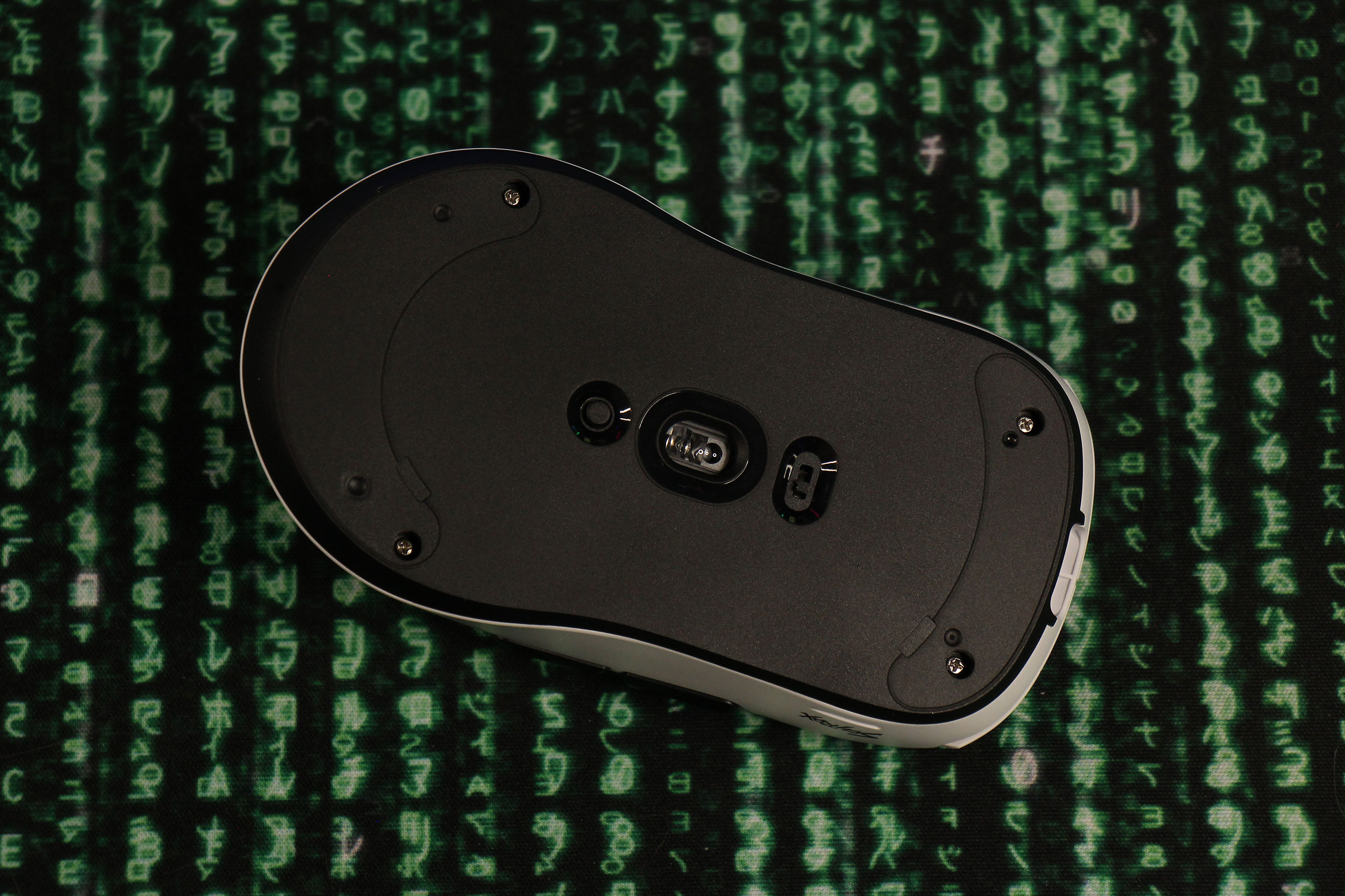 Нижняя часть содержит переключатель режимов и кнопку для переключения профилей. Оба элемента самые примитивные и это хорошо, потому что они одновременно и самые легкие! Также видны четыре винтика, которые держат мышь в собранном состоянии. И заметно их потому, что ножки поставляются отдельно от мыши.
