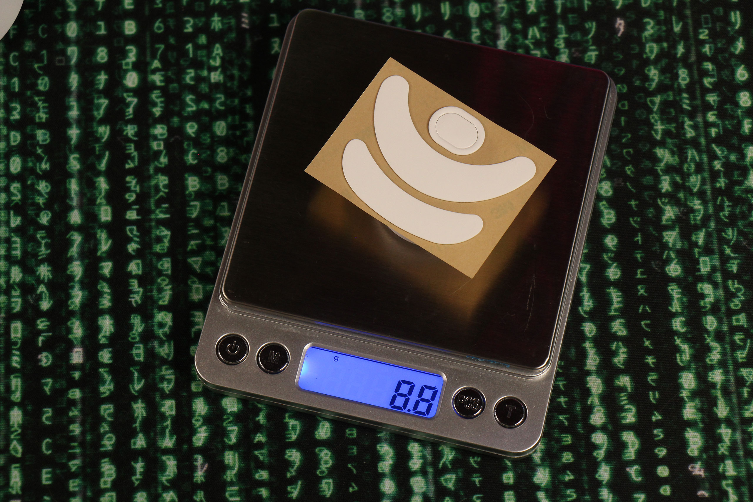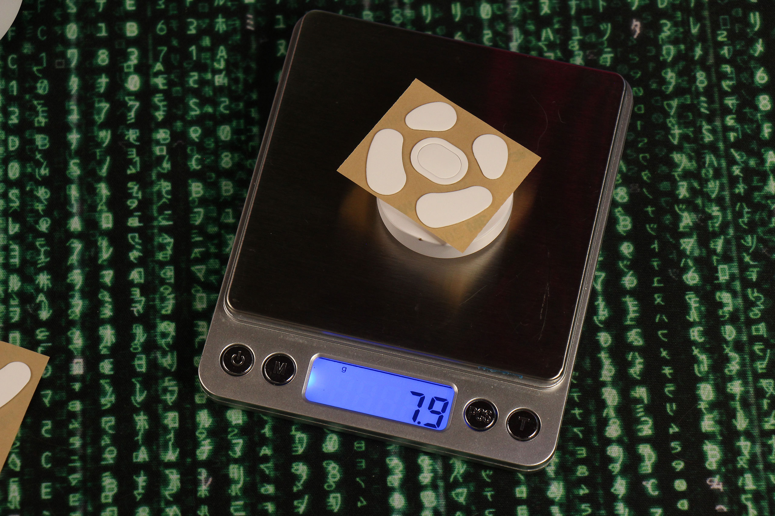 Два комплекта PTFE-ножек в коробке (большие и малые) позволяют экспериментировать с ощущениями скольжения. Большие ножки обеспечивают более плавное скольжение с меньшим сопротивлением, малые дают больше контроля. А еще весят на грамм меньше. Поэтому вполне логично, что пользователю дают возможность выбрать желаемую комбинацию, или воспользоваться другими глайдами по собственному желанию. На фотографиях ниже 6,7 грамма из веса весит донгл и еще несколько добавляет бумажку и лишний кусок центрального глайда, поэтому реально набор меньших ножек в установленном виде весит 0,6 грамма, а больших — 1,5 грамма.