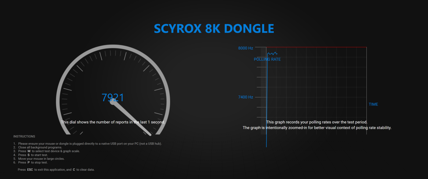 Сенсор PAW3950 ожидаемо демонстрирует флагманский уровень точности. Отслеживание идеальное на всех протестированных поверхностях, от тканевых ковриков до стекла. Технология MotionSync обеспечивает плавность движения без добавления заметной задержки и замечательно, что Scyrox позволяет регулировать эту настройку пользователям и не ограничивает его работу по частоте опроса — не все бренды достигают такого уровня совместимости сенсора и чипсета на практике.