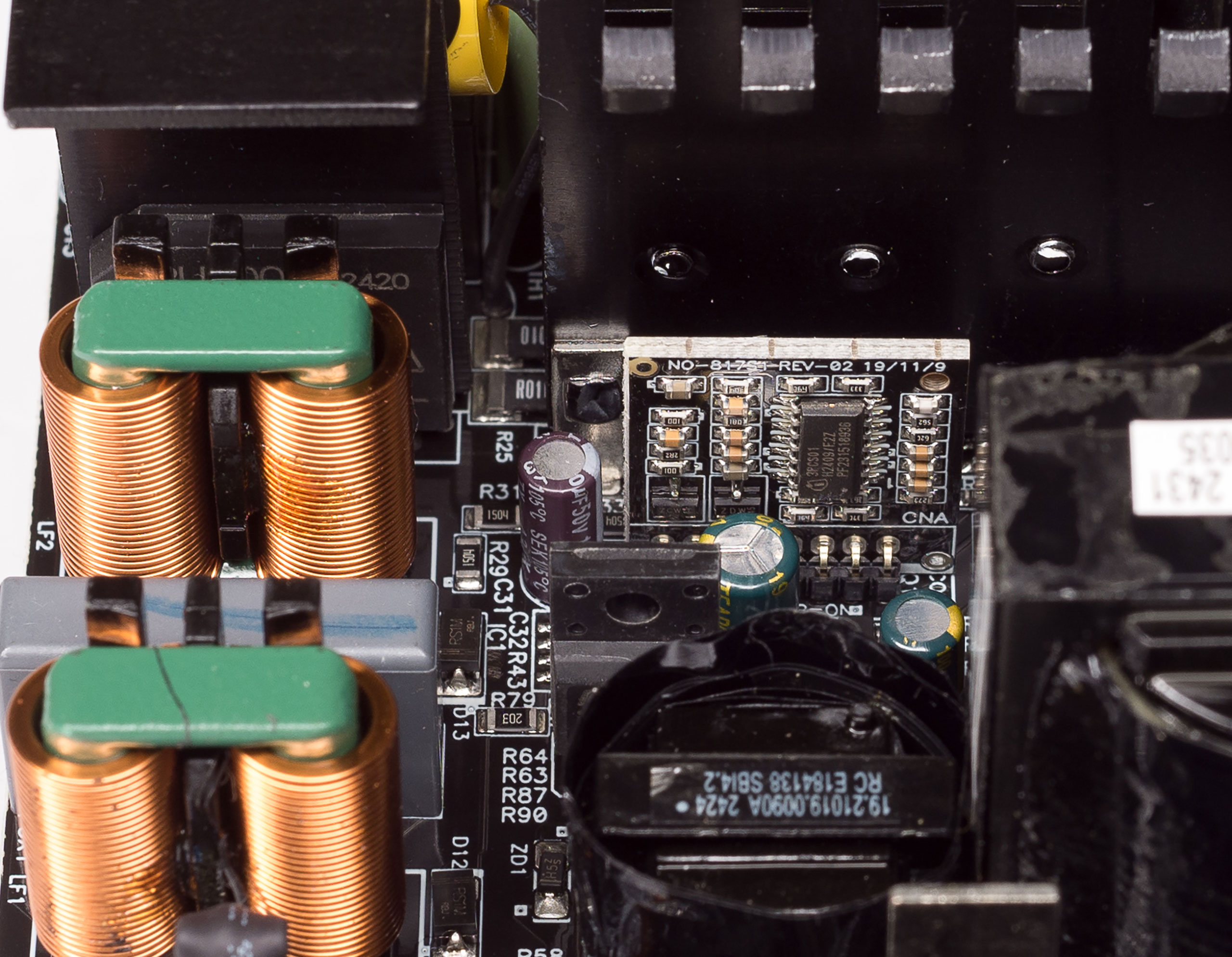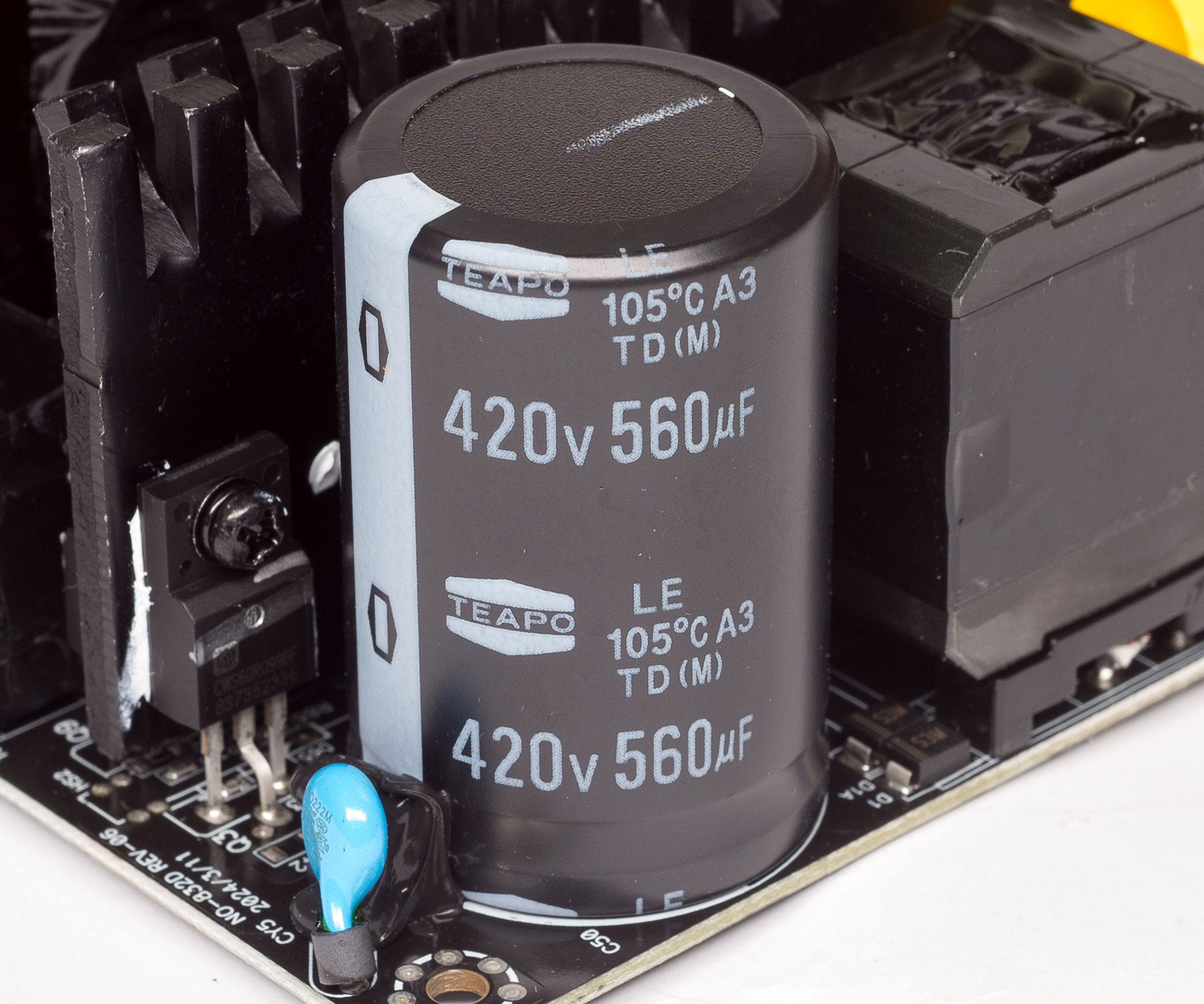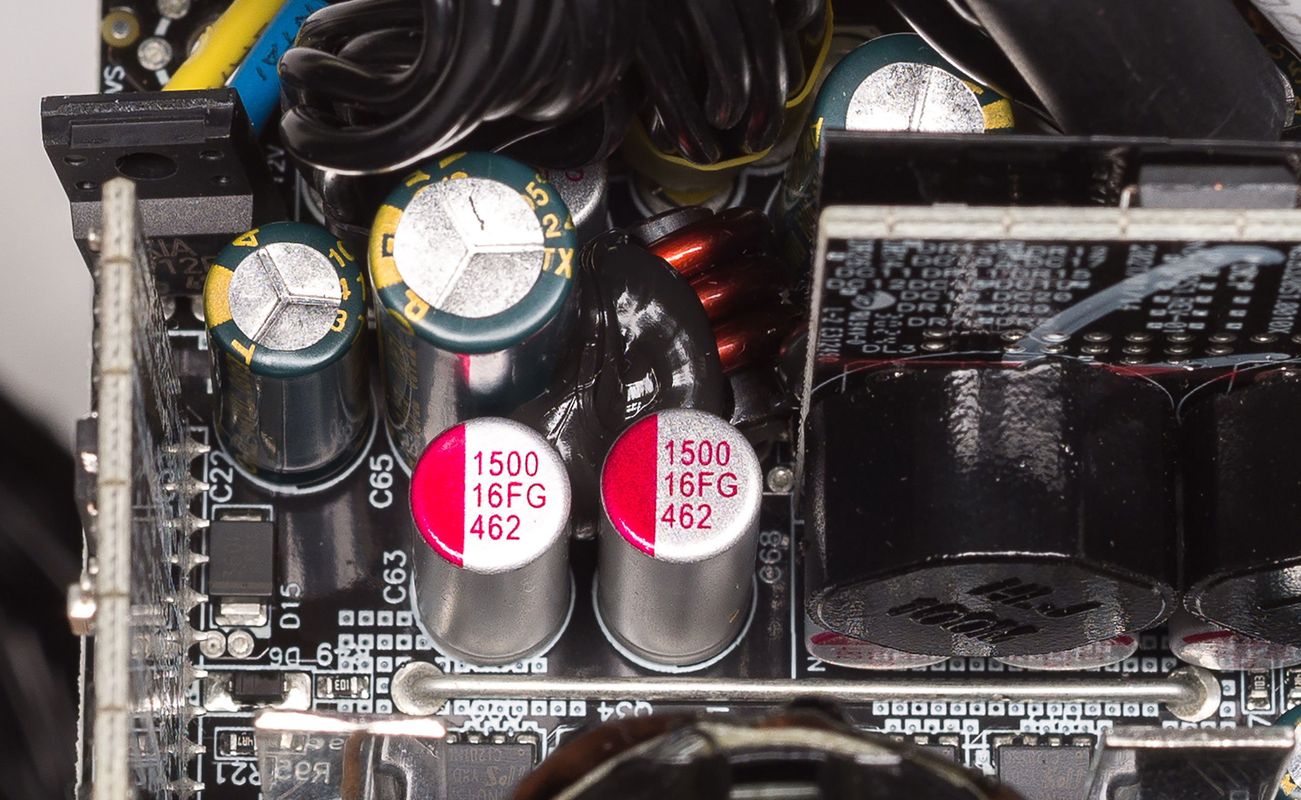 Выходное напряжение по линии +12 В фильтрует два электролитических конденсатора емкостью 3300 мкФ і рабочим напряжением 16 В (105 °C) производства TEAPO, а также полимерные конденсаторы: два емкостью 1500 мкФ с напряжением 16 В и один емкостью 820 мкФ с напряжением 16 В.