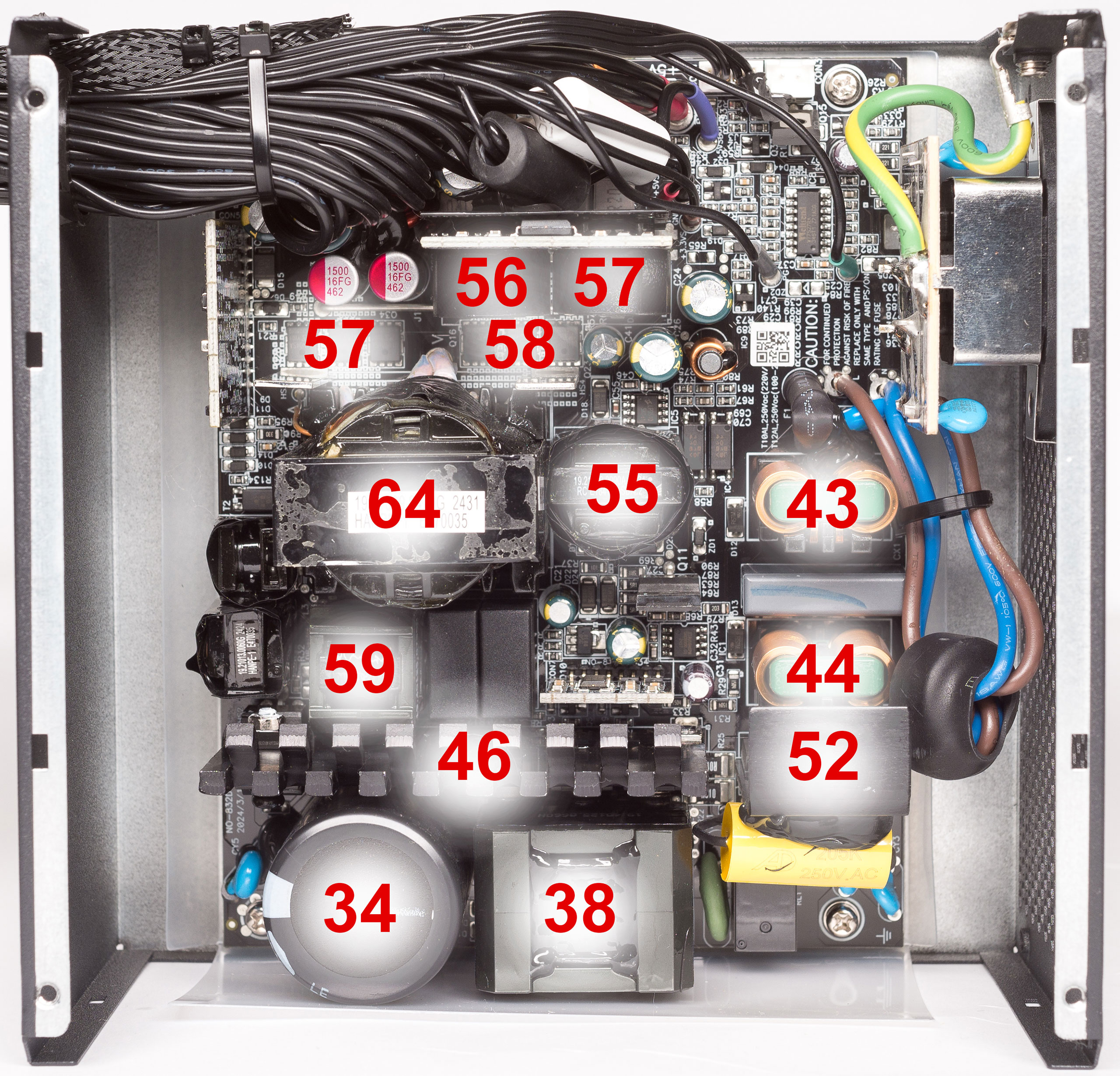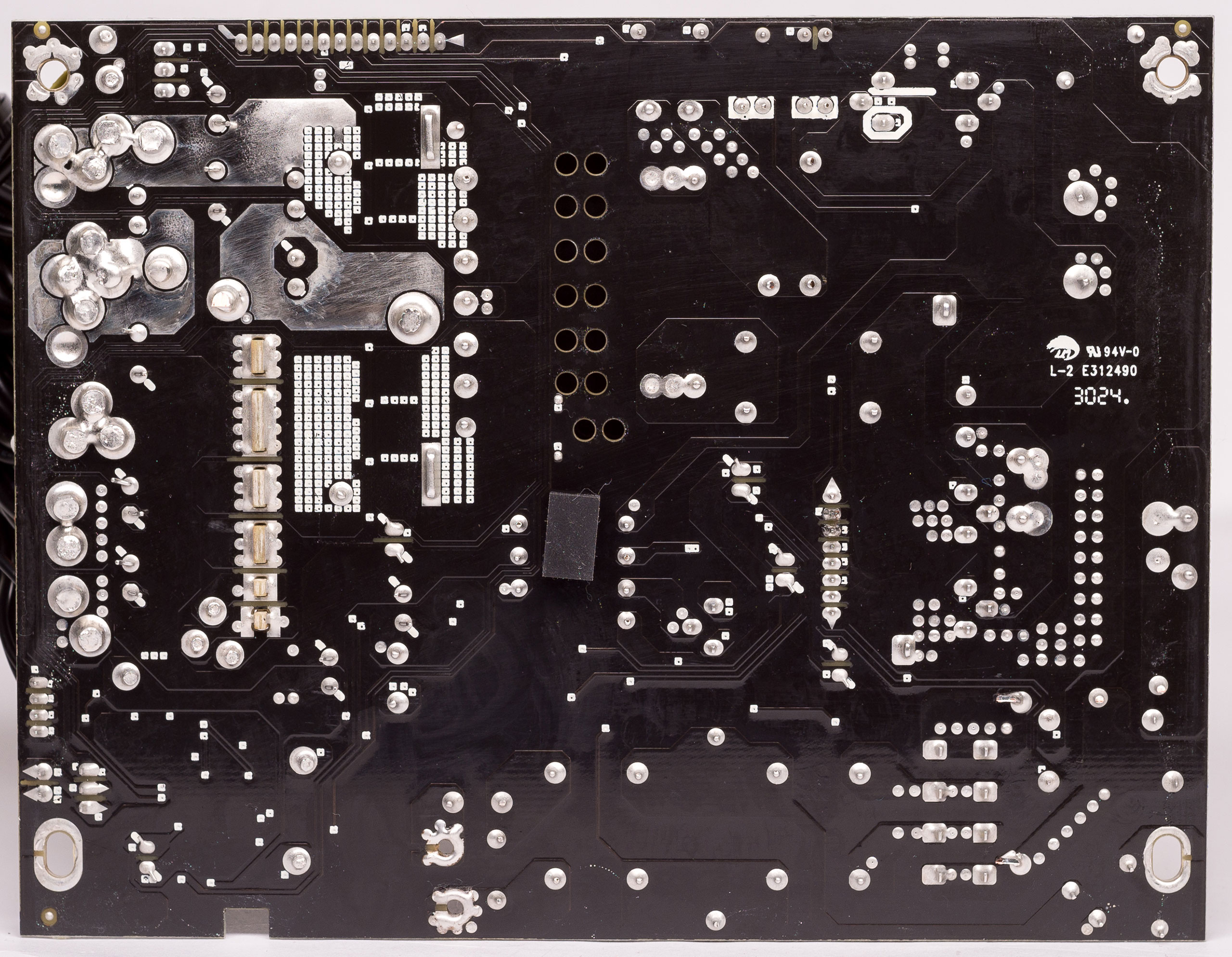 Блок с активным корректором коэффициента мощности (APFC) и с широким диапазоном входного напряжения (100–240 В). Силовой преобразователь на +12 В выполнен на резонансном полу-мостовом LLC-преобразователе с синхронным выпрямителем, линии +3,3 В и +5 В формируют DC/DC-преобразователи из +12 В.