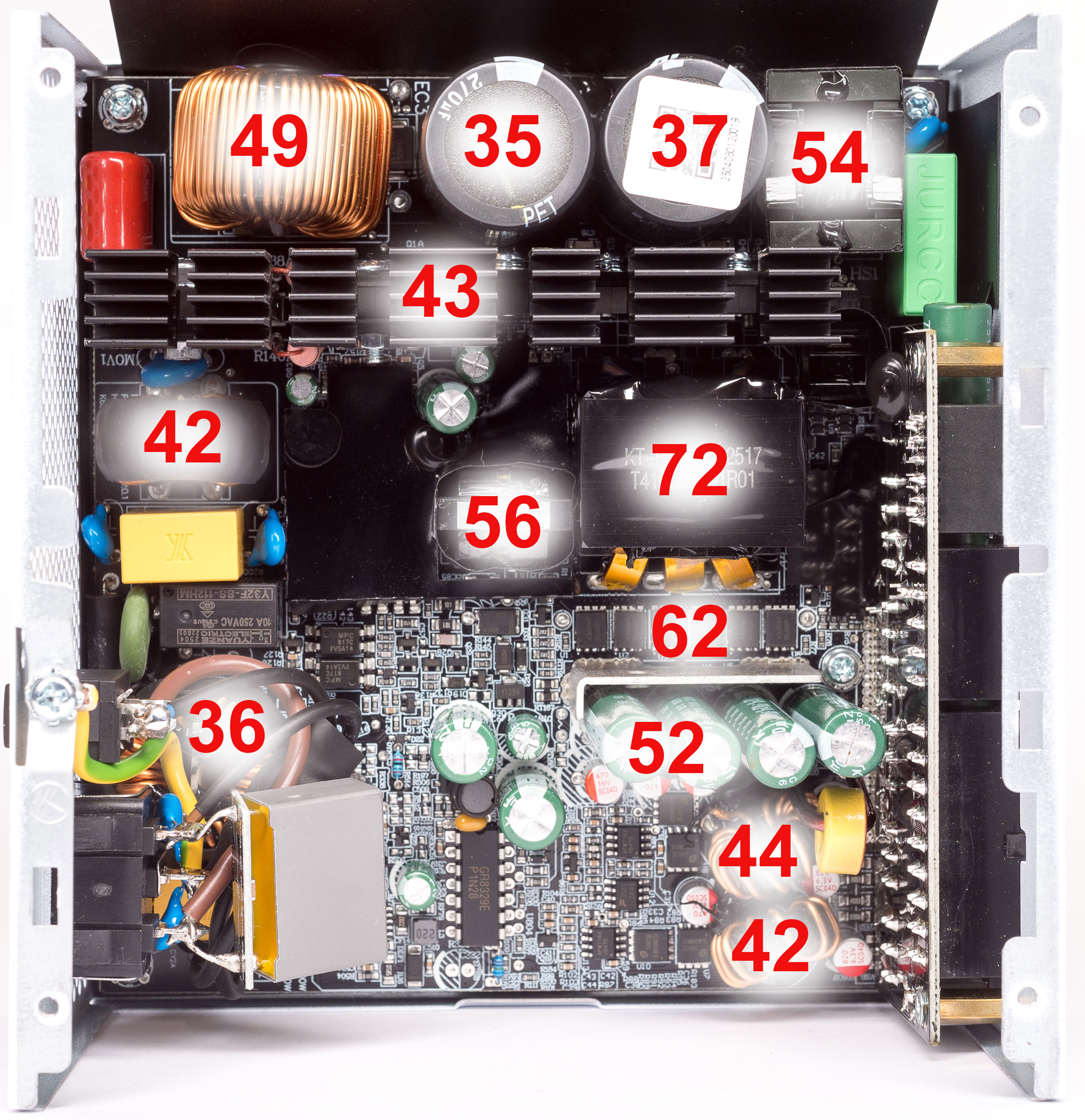 Тест на нагрев компонентов блока проводился при температуре воздуха в помещении 19 °С. Термодатчик устанавливался на силовом трансформаторе, блок нагружался на максимальную мощность и работал пока температура трансформатора не стабилизировались. В конце теста блок выключался, быстро снималась крышка и проводились замеры температур остальных компонентов с помощью пирометра. Результаты теста указаны на следующем фото: