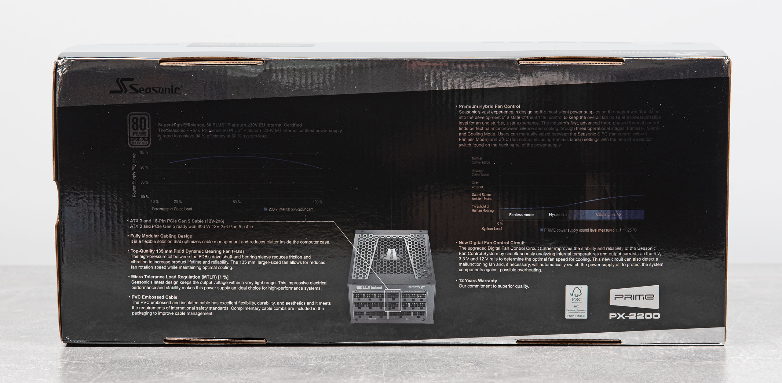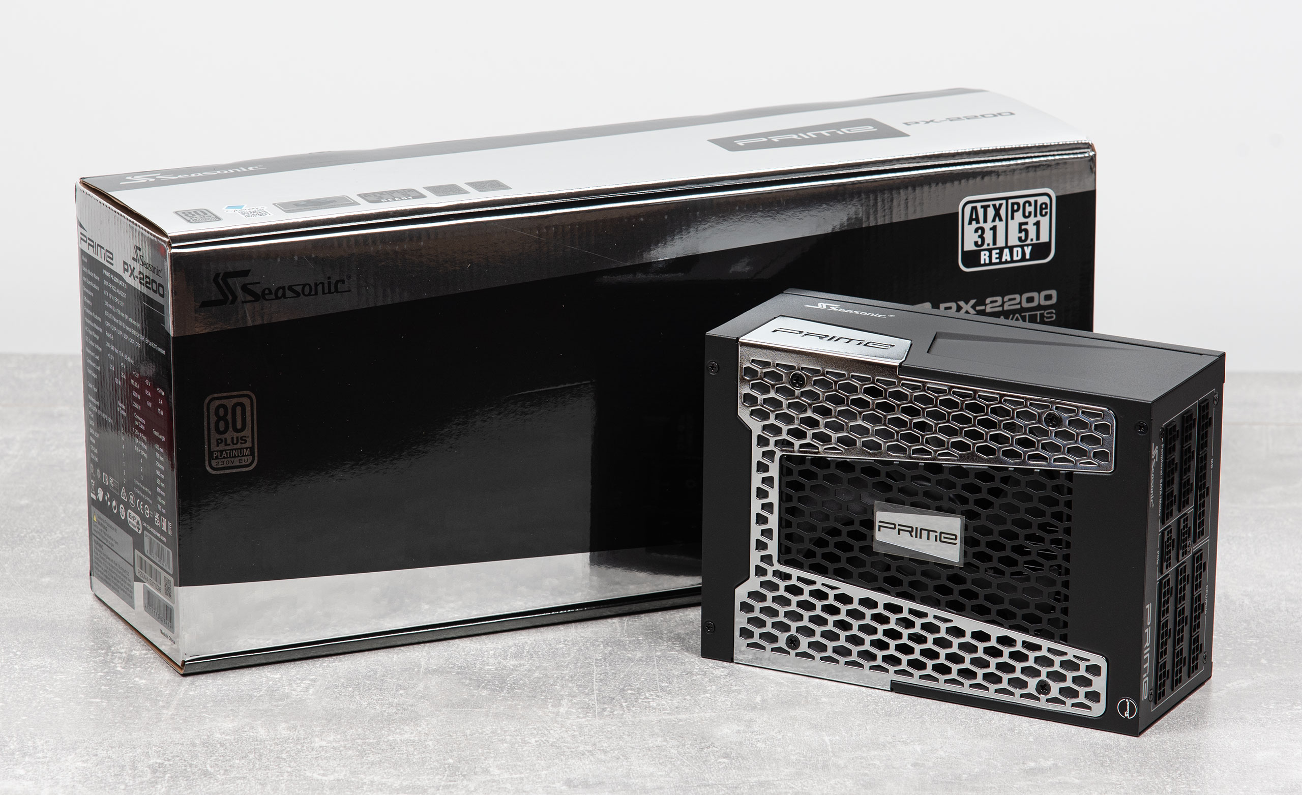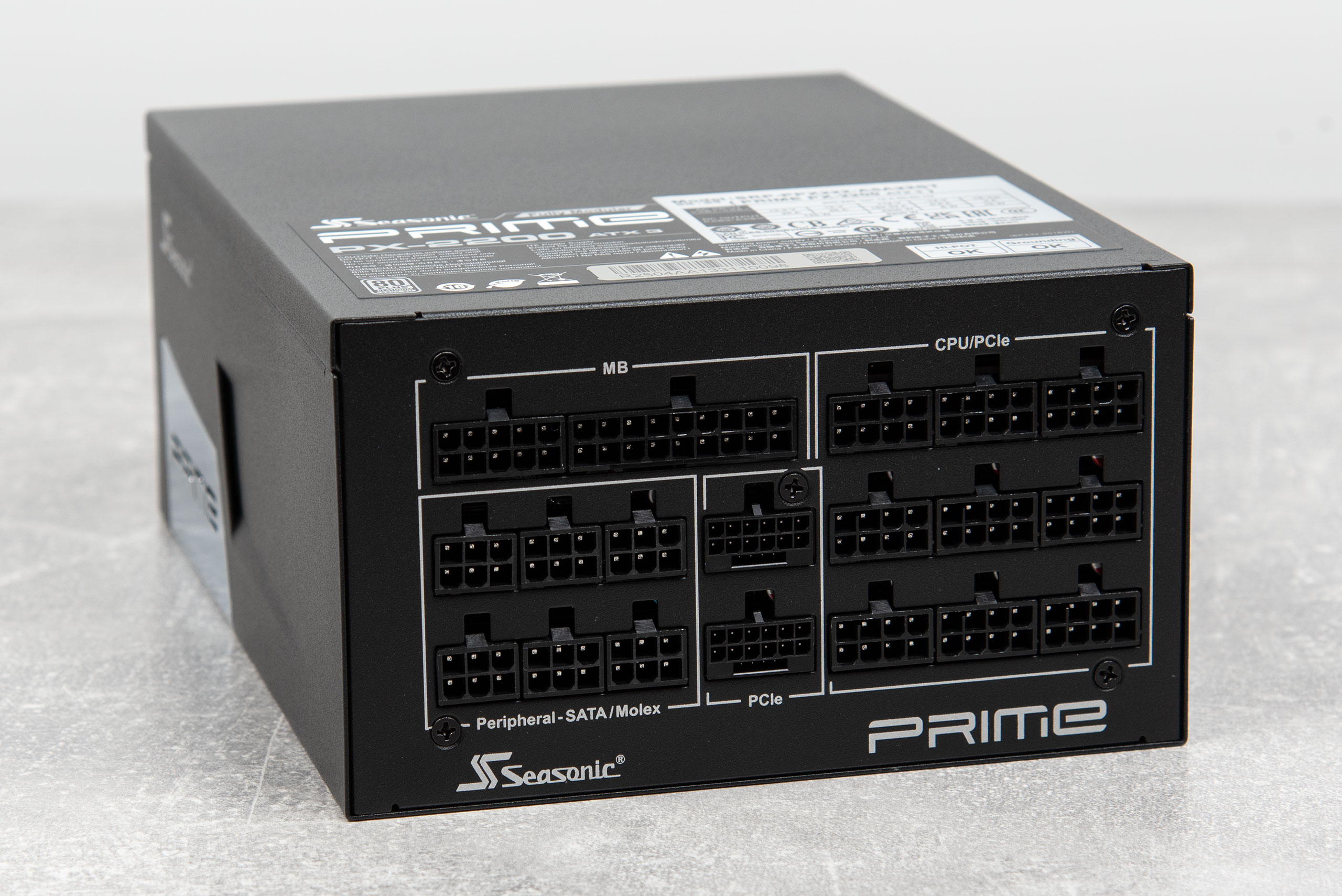 В этот раз в центре внимания блок питания Seasonic PRIME PX-2200 ATX 3 с сертификатом 80 PLUS Platinum. Также он поддерживает стандарты ATX 3.1 и PCI‑E 5.1 для современных видеокарт. Производитель заявляет низкий уровень шума, применение японских конденсаторов, высокую стабильность напряжения благодаря технологии MTLR (Micro Tolerance Load Regulation) и дает гарантию на устройство 12 лет.