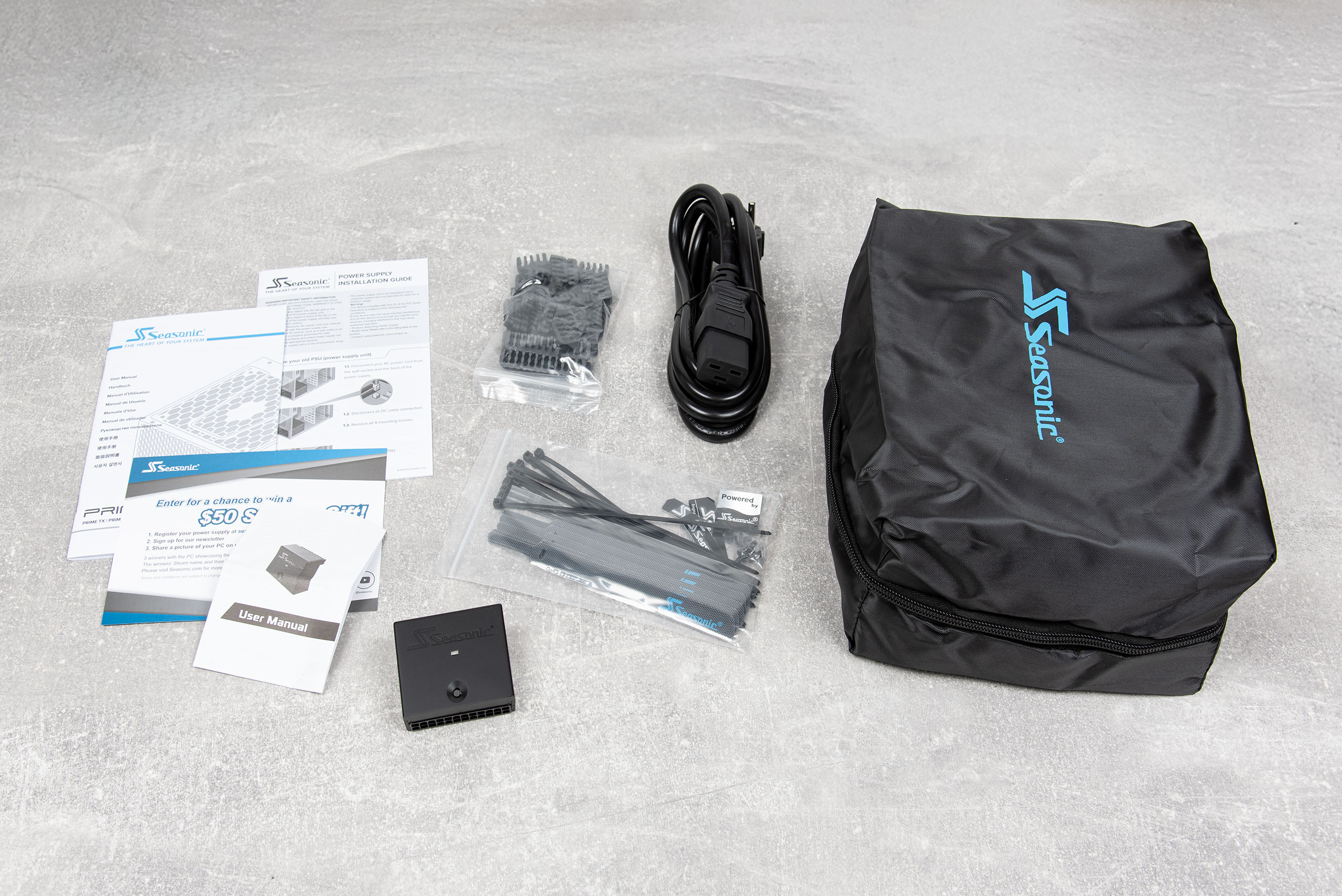 В комплект поставки входит сетевой кабель, набор модульных кабелей в чехле, пакетик с крепежом, два комплекта кабельных стяжек, угловой переходник для питания материнской платы, набор гребенок для кабелей и инструкция.