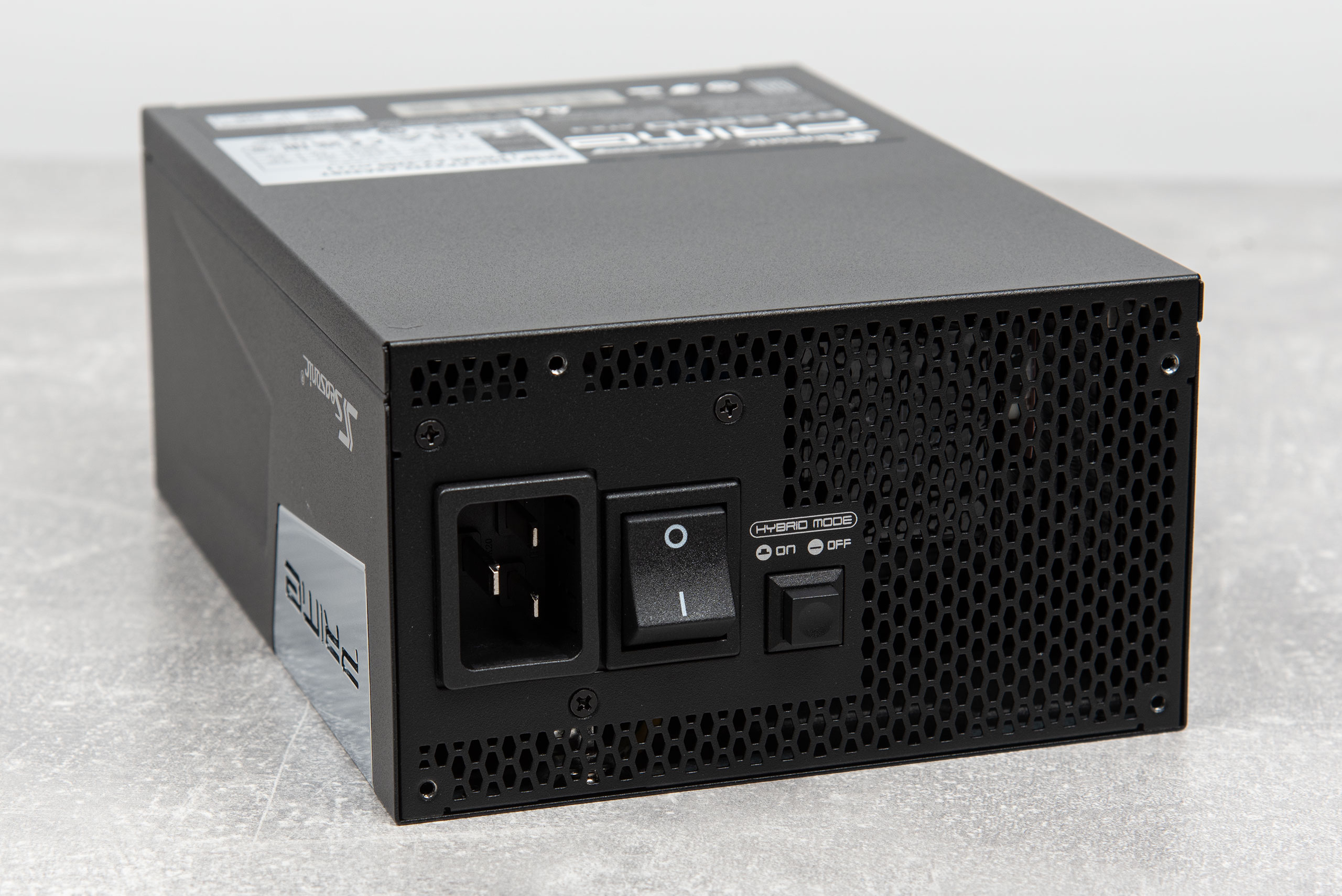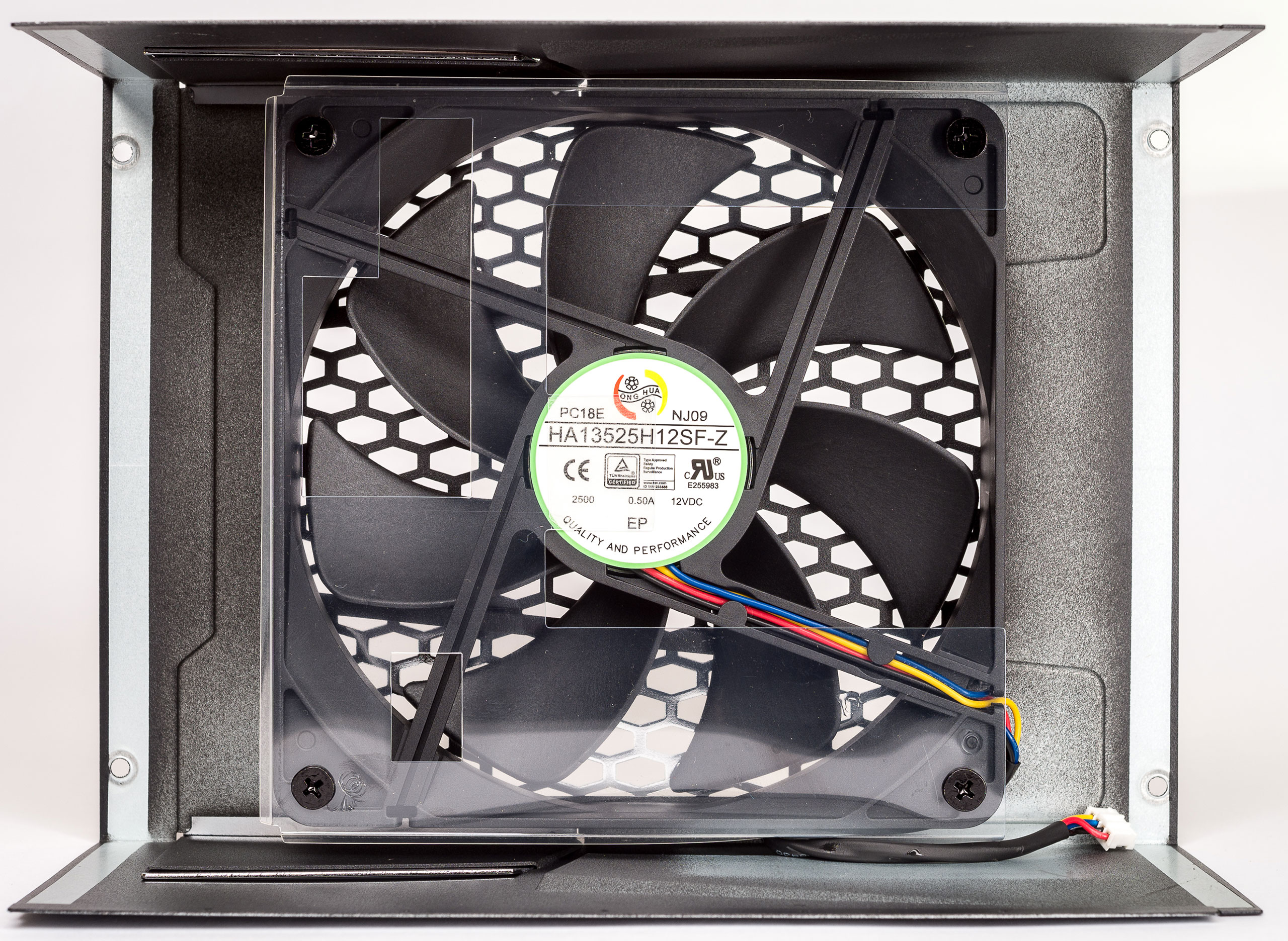 В блоке установлен вентилятор размером 135х135х25 мм с маркировкой HA13525H12SF‑Z (12 В 0,5 A), четырех контактным подключением и гидродинамическим подшипником. Система охлаждения имеет полупассивный режим работы, с цифровым управлением вентилятора на контролере M031FB0AE от Nuvoton, режим работы которого переключается кнопкой «Hybrid mode».