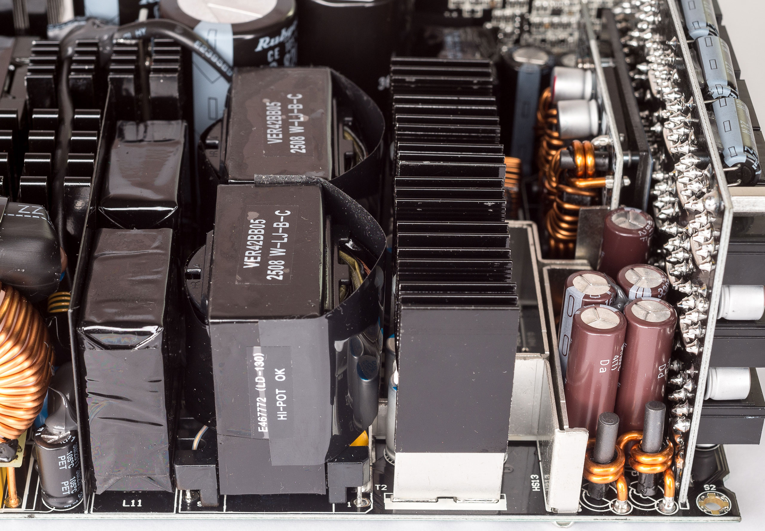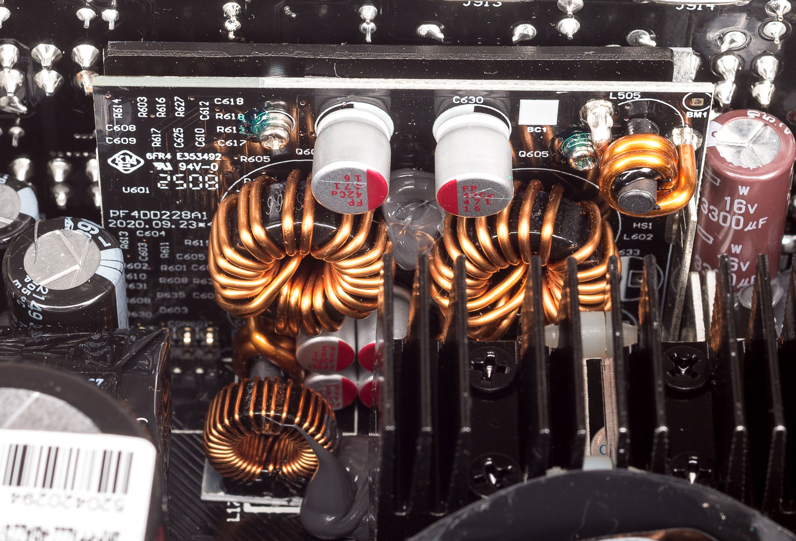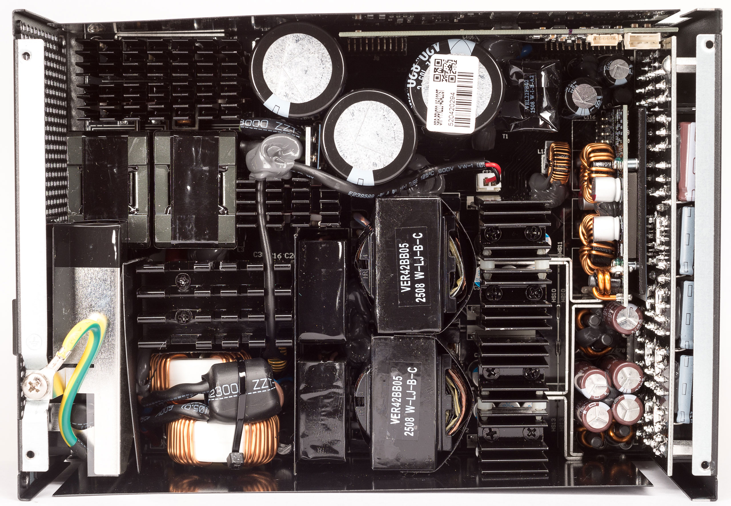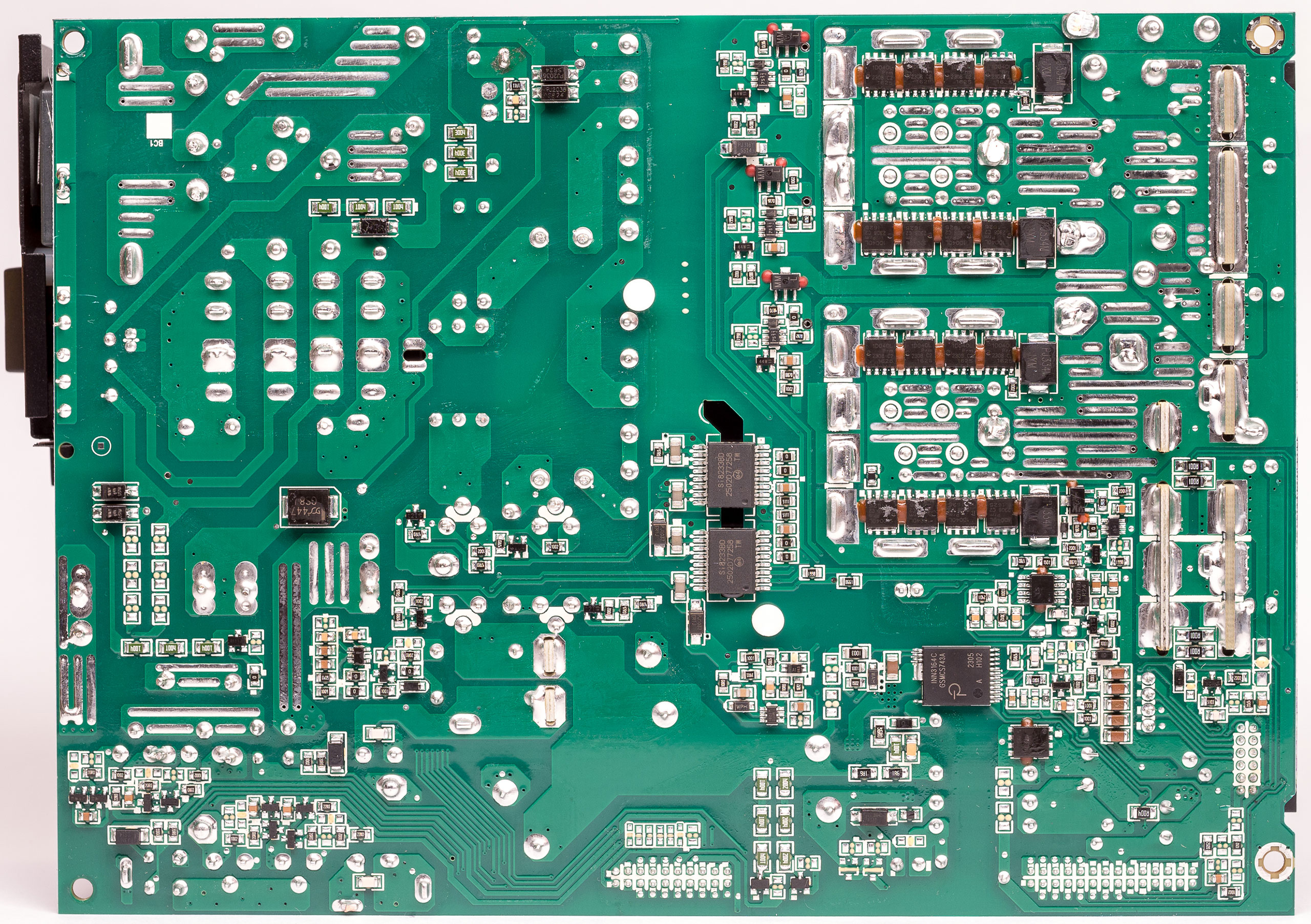 Блок построен по современной топологии, с активным корректором коэффициента мощности (APFC) и диапазоном входного напряжения 200–240 В. Силовой резонансный LLC-преобразователь по линии +12 В выполнен с синхронным выпрямителем, есть DC/DC-преобразователи для линий +5 В и +3,3 В.