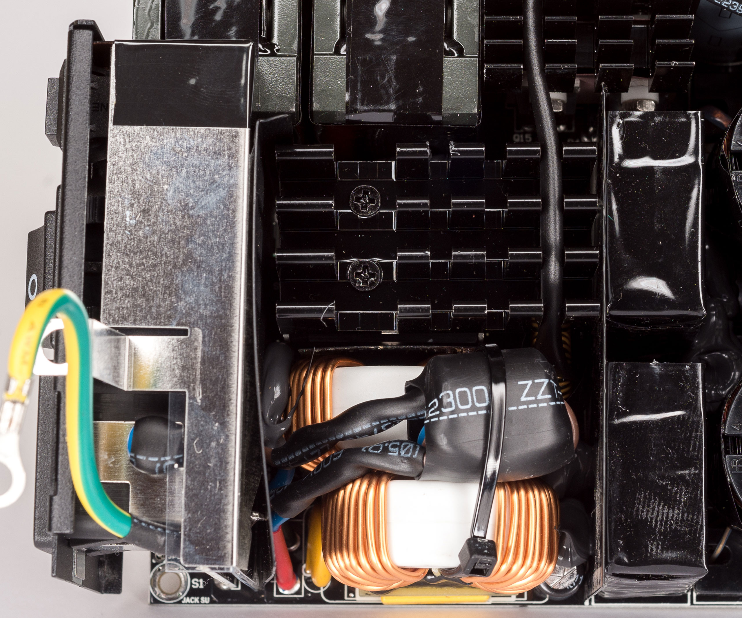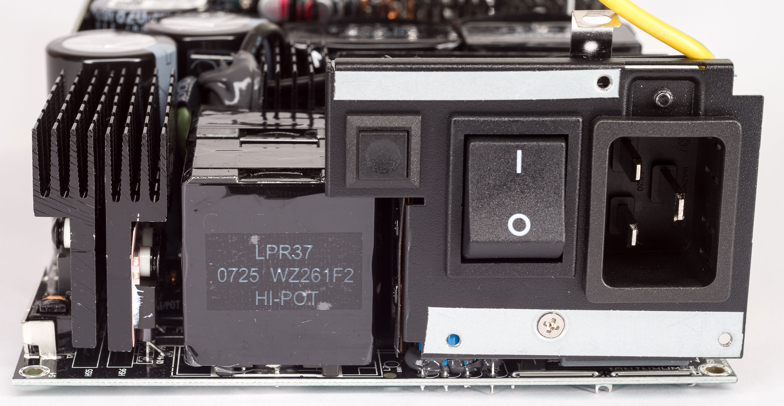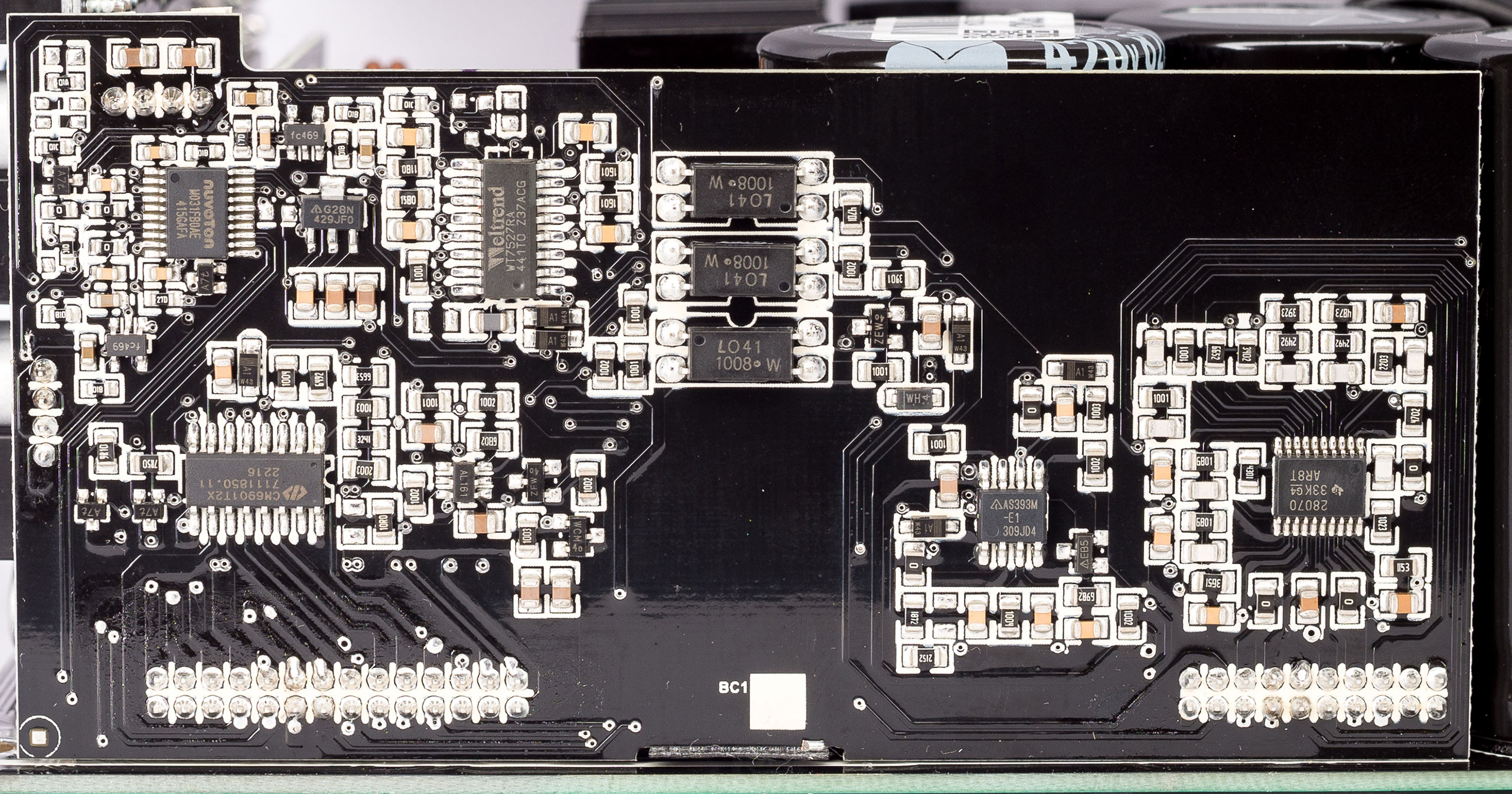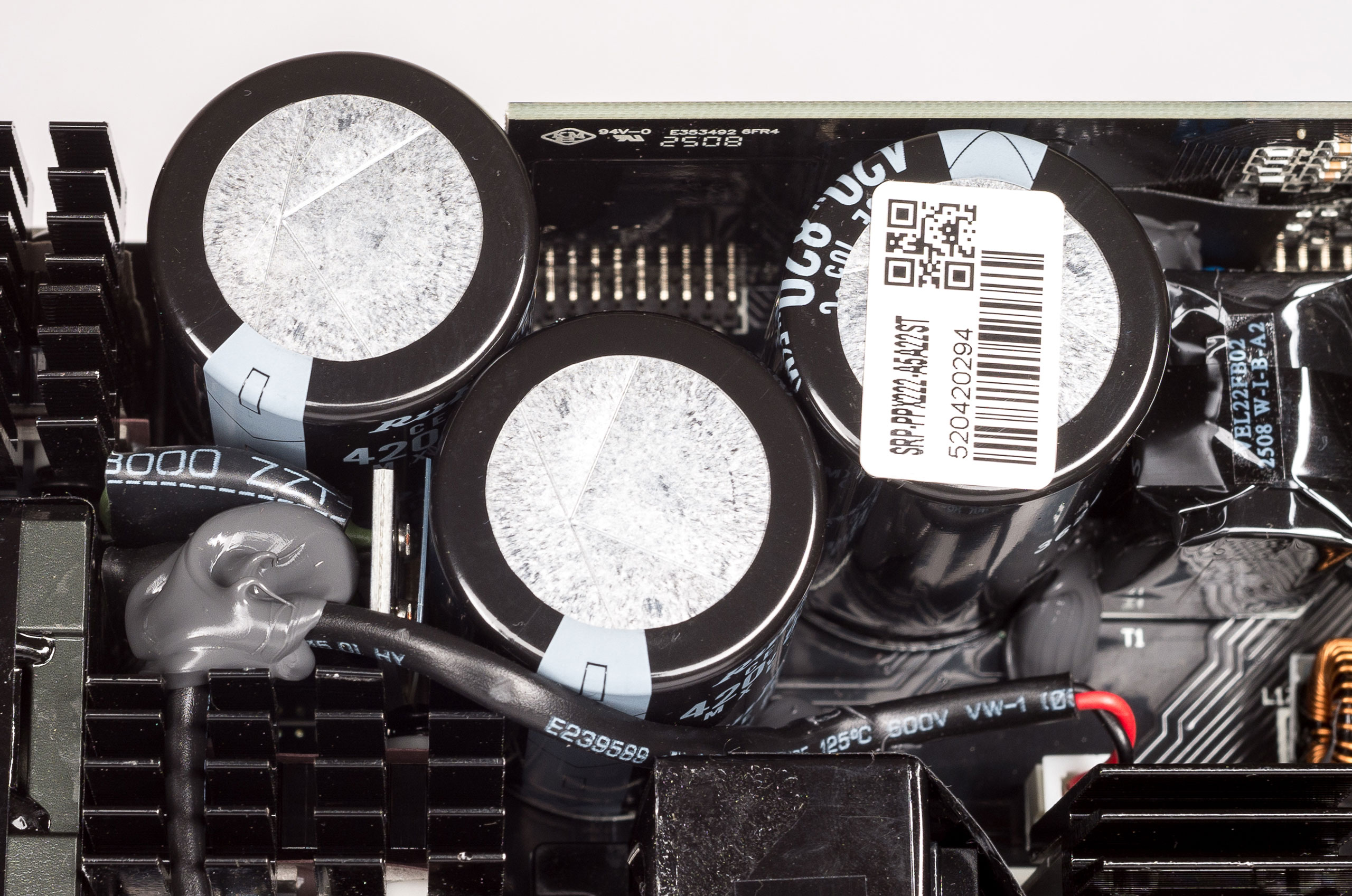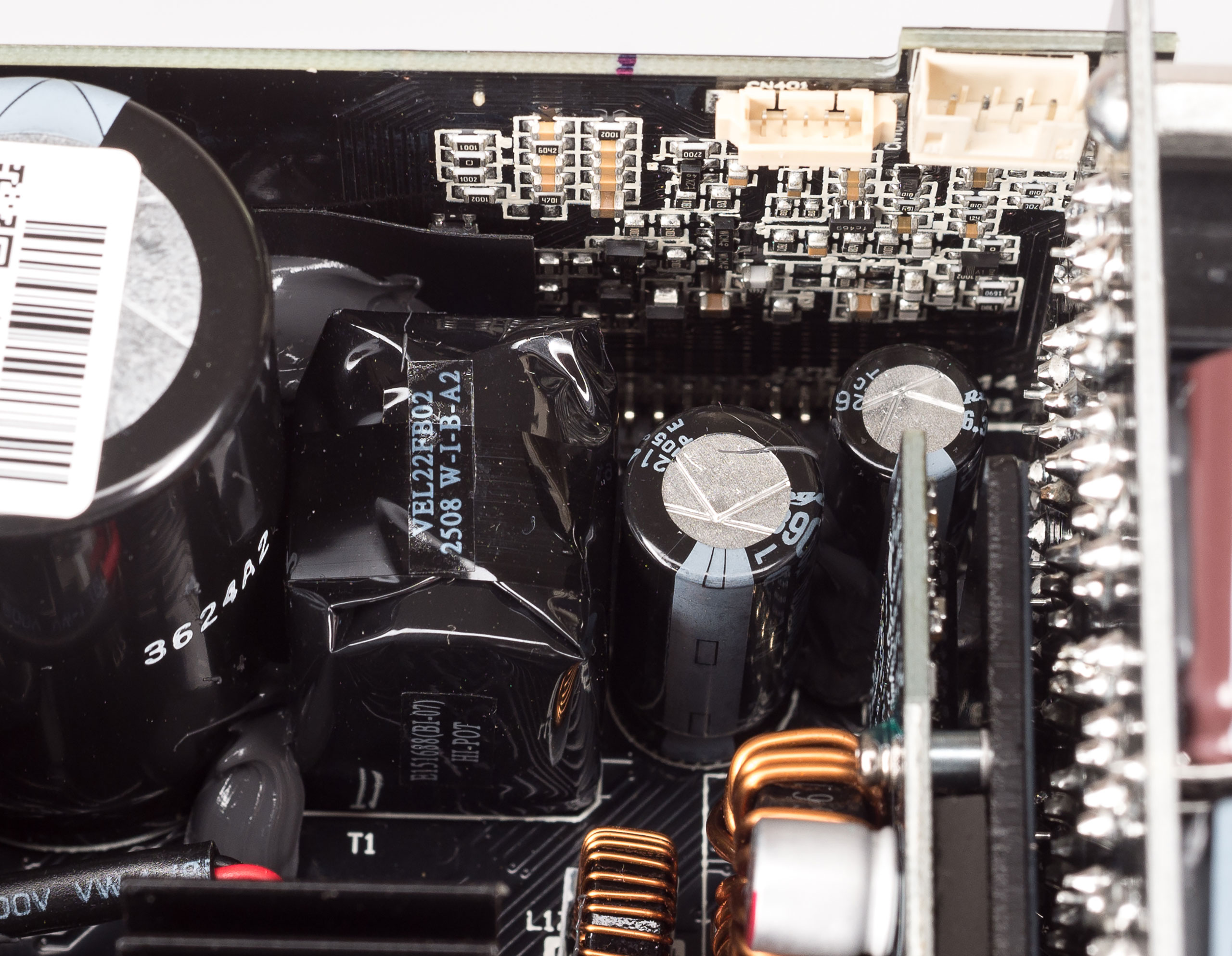 Блок построен по современной топологии, с активным корректором коэффициента мощности (APFC) и диапазоном входного напряжения 200–240 В. Силовой резонансный LLC-преобразователь по линии +12 В выполнен с синхронным выпрямителем, есть DC/DC-преобразователи для линий +5 В и +3,3 В.