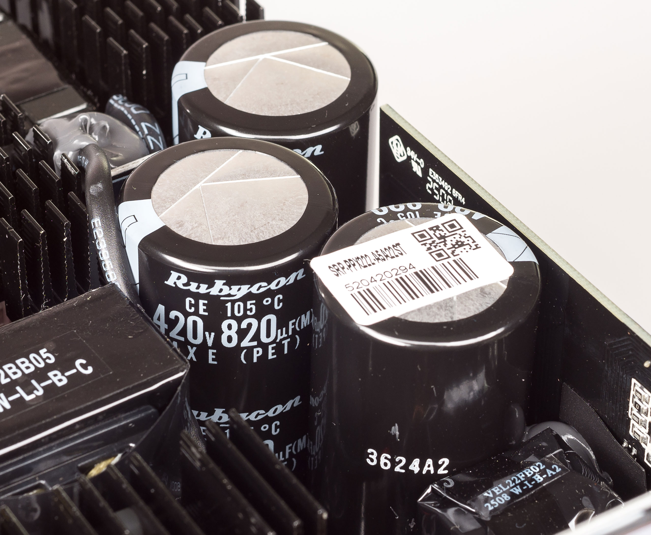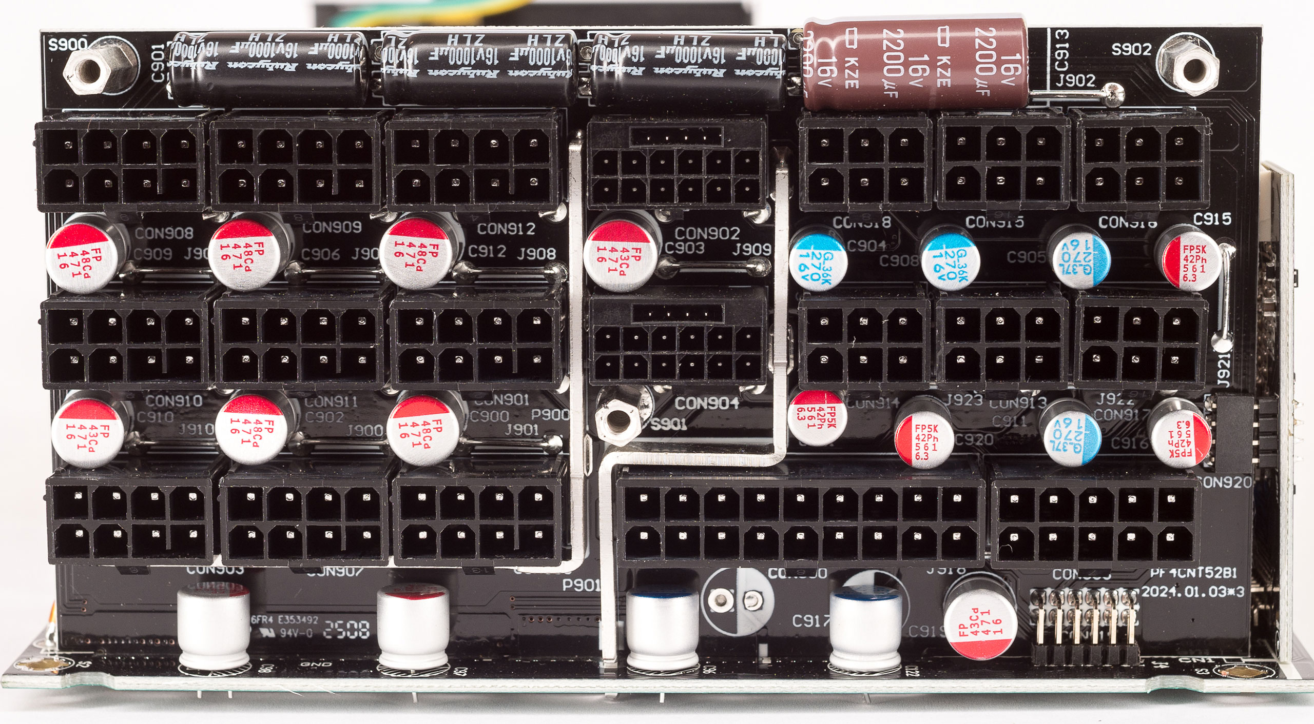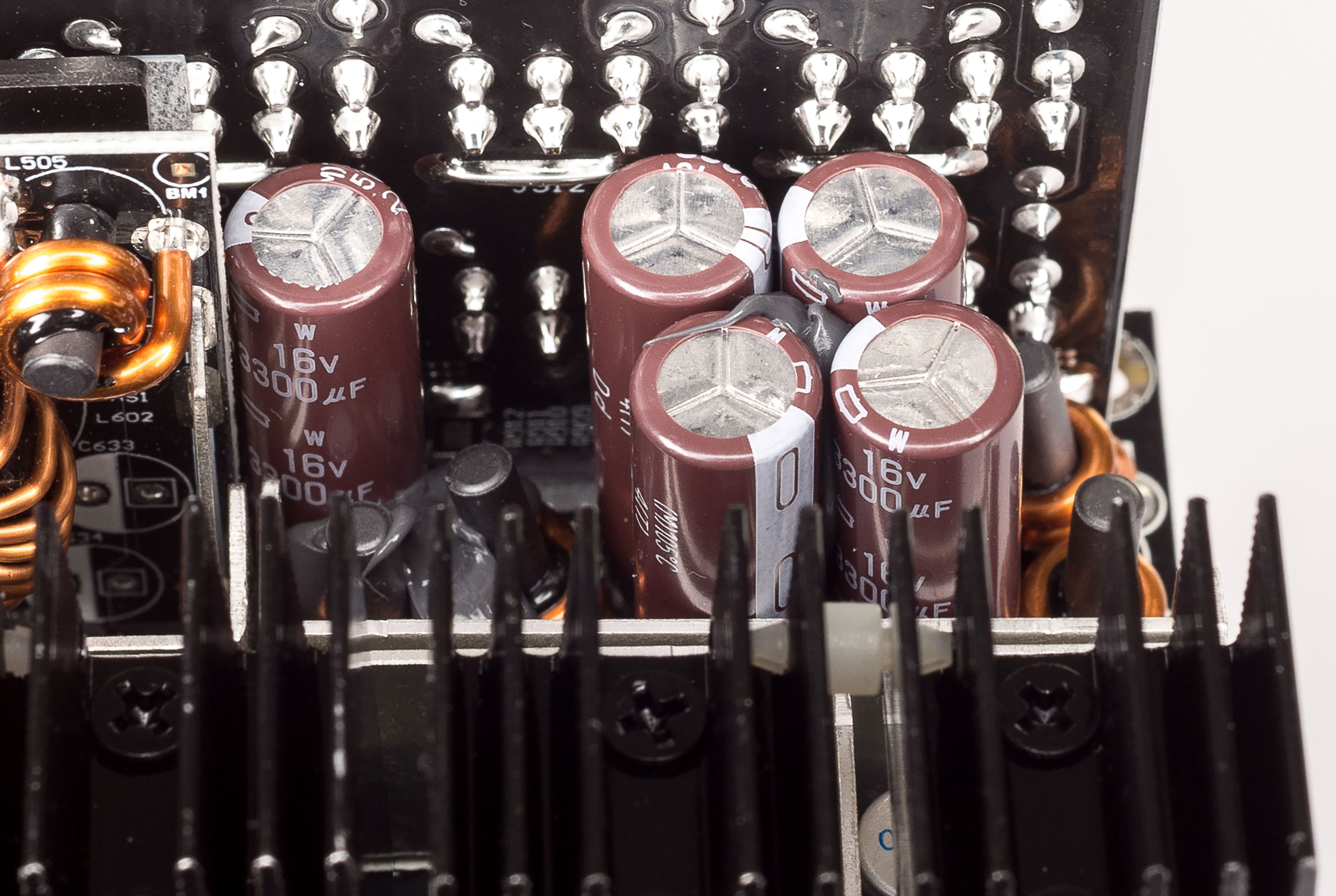 Выходное напряжение +12 В фильтруют двенадцать полимерных конденсатора емкостью 1000 мкФ на 16 В и четыре электролитических конденсатора емкостью 3300 мкФ с напряжением 16 В на 105 °C производства Nippon Chemi-Con. Для дополнительной фильтрации на плате с модульными разъемами установлена гирлянда полимерных и электролитических конденсаторов.