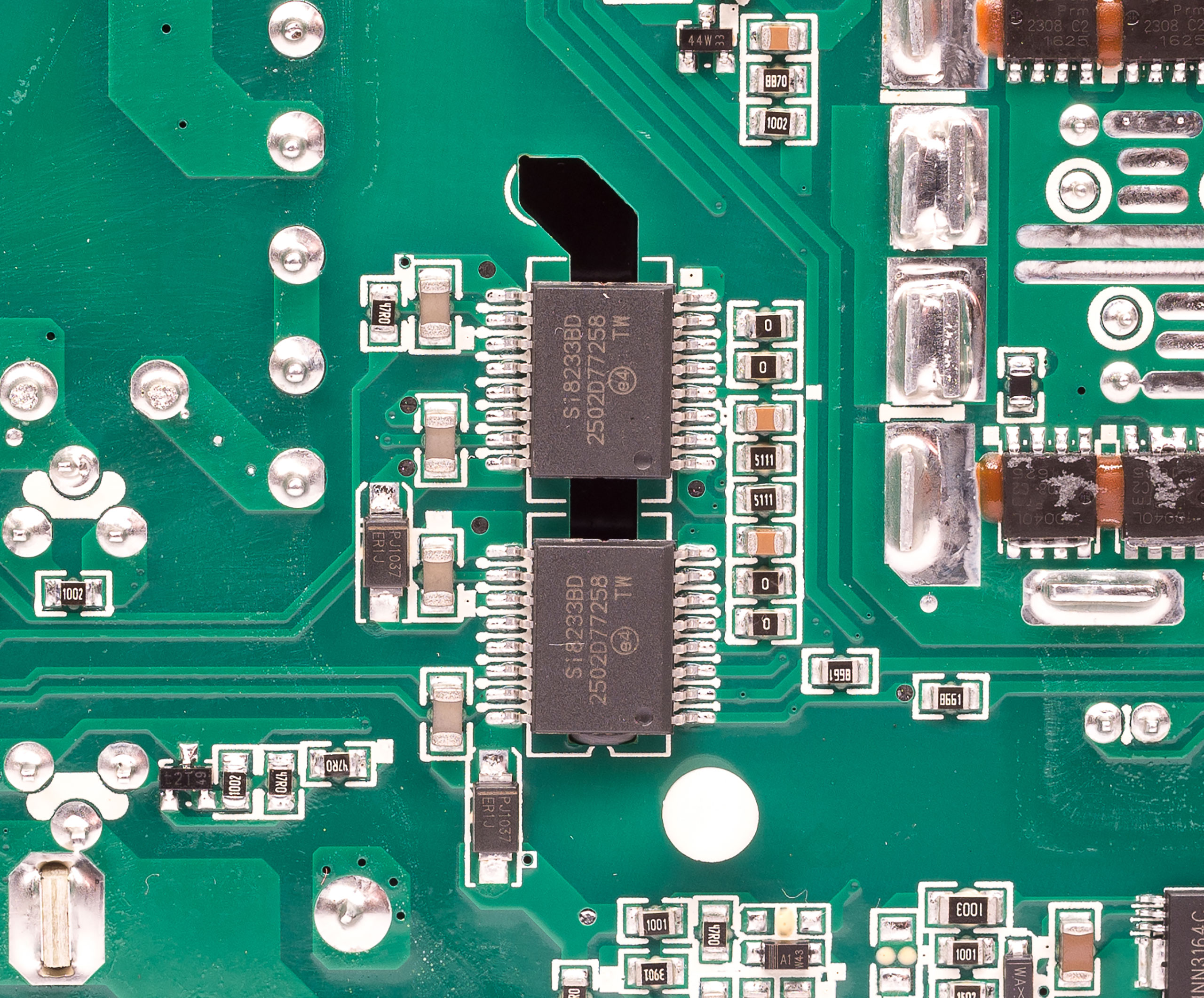 Силовой резонансный LLC-преобразователь построен по мостовой схеме на четырех транзисторах, установленных на отдельном небольшом радиаторе, их тип рассмотреть не удалось. Управляет преобразователем контролер CM6901T2X через два изолированных драйвера Si8233BD.