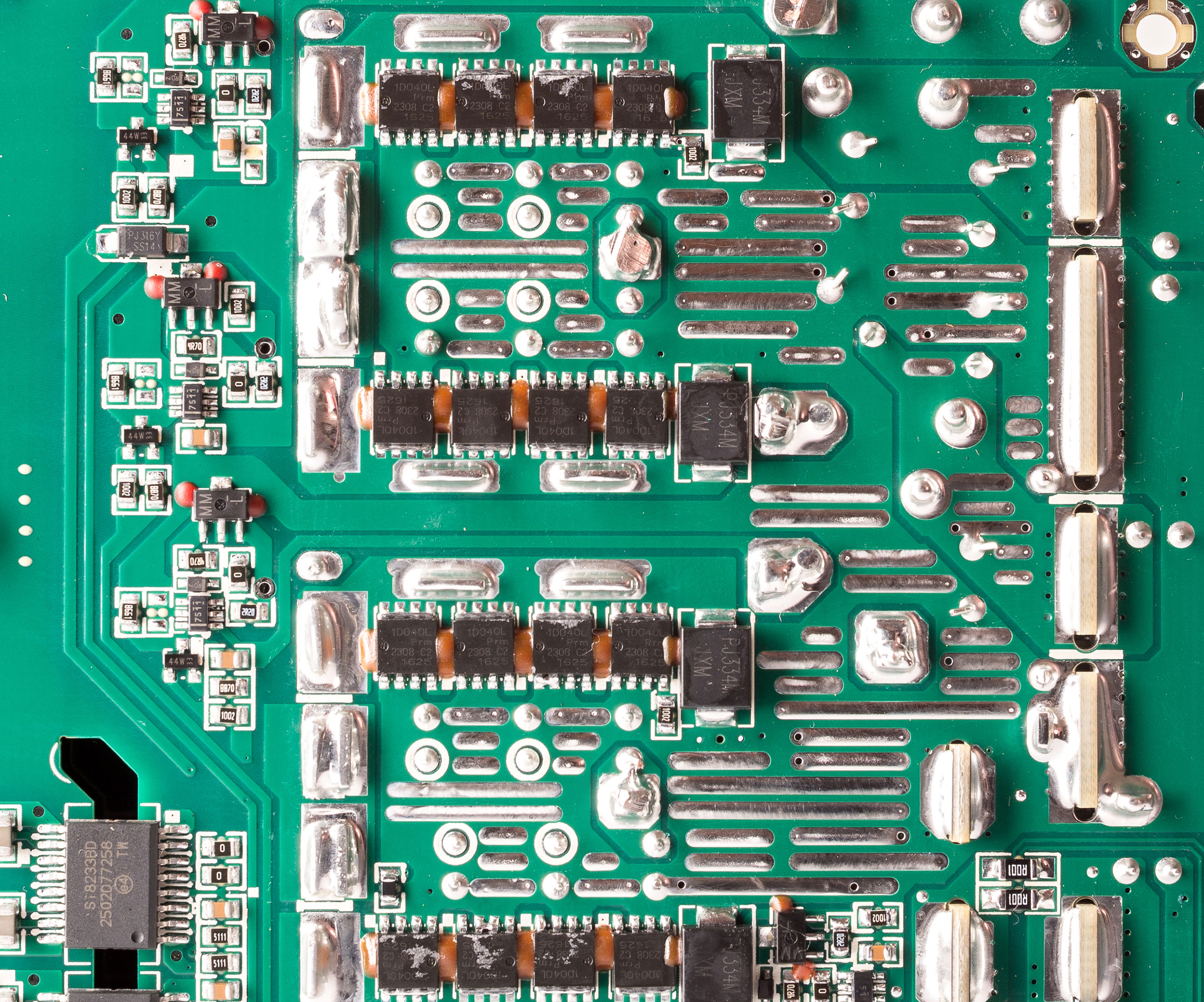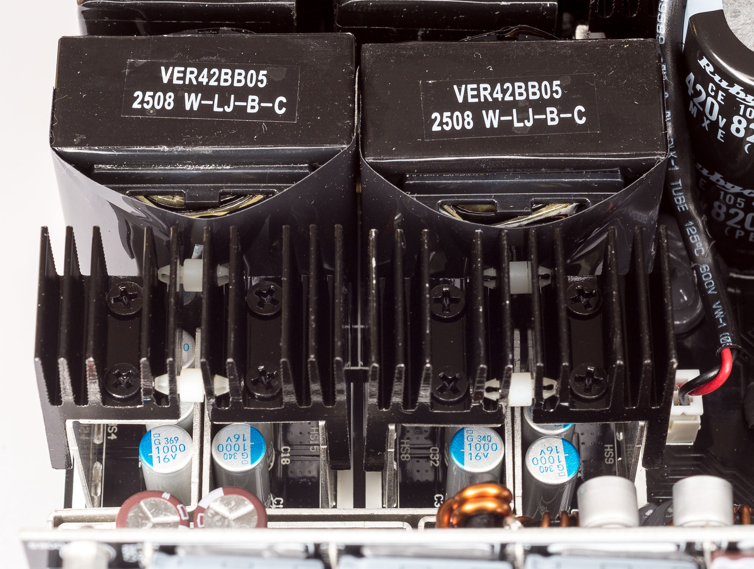 Силовой преобразователь нагружен на два силовых трансформатора с двумя резонансными дросселями. На выходе каждого трансформатора установлены отдельные синхронные выпрямители, которые работают параллельно на общую линию +12 В. В синхронных выпрямителях установлено шестнадцать транзисторов PSMN1R0-40YLD (280 A, 40 В, 1,1 мОм), которые распаяны на основной плате. Рядом с ними впаяны радиаторы, а также часть тепла от транзисторов отводится на корпус блока через термопрокладку.