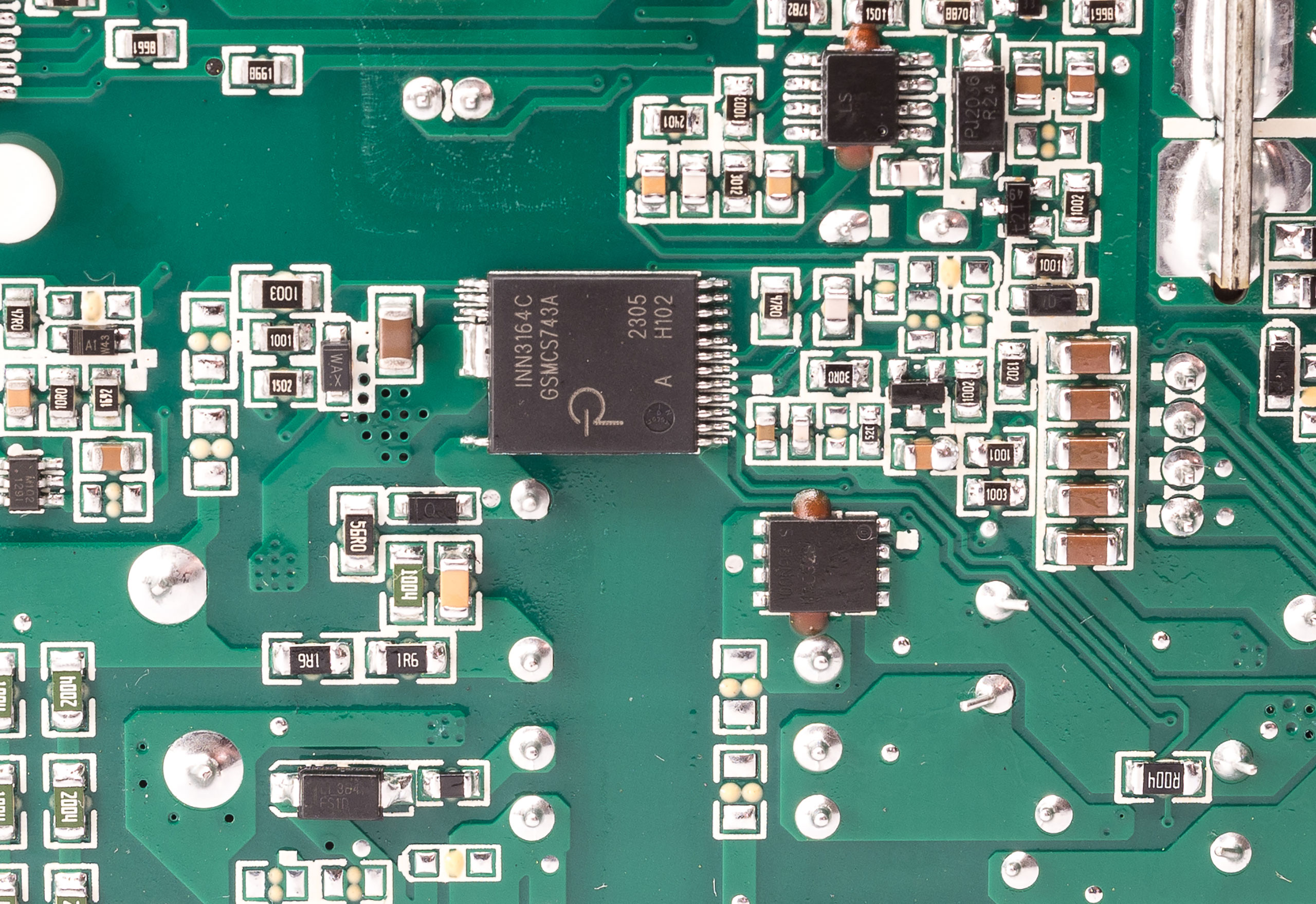 Преобразователь дежурного питания построен на контролере INN3164C с синхронным выпрямителем на транзисторе BSC100N06LS3 (55 A, 60 В). На выходе установлен конденсатор емкостью 6800 мкФ с напряжением 16 В на 105 °C производства Rubycon.