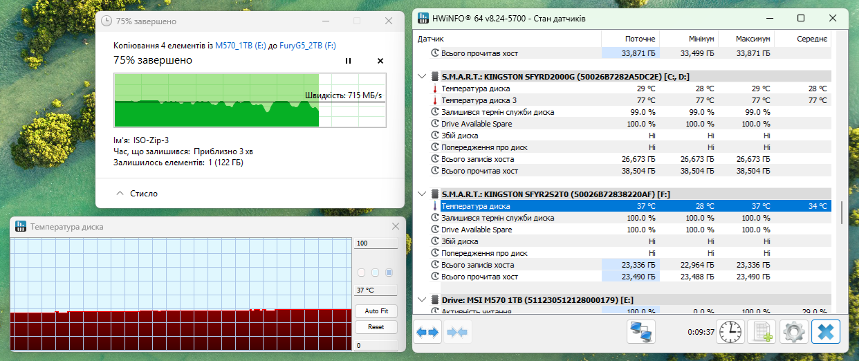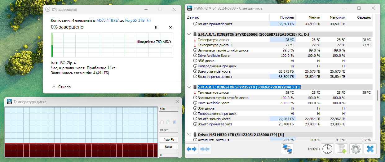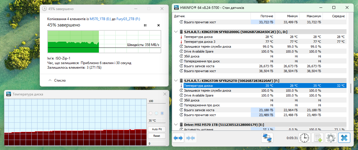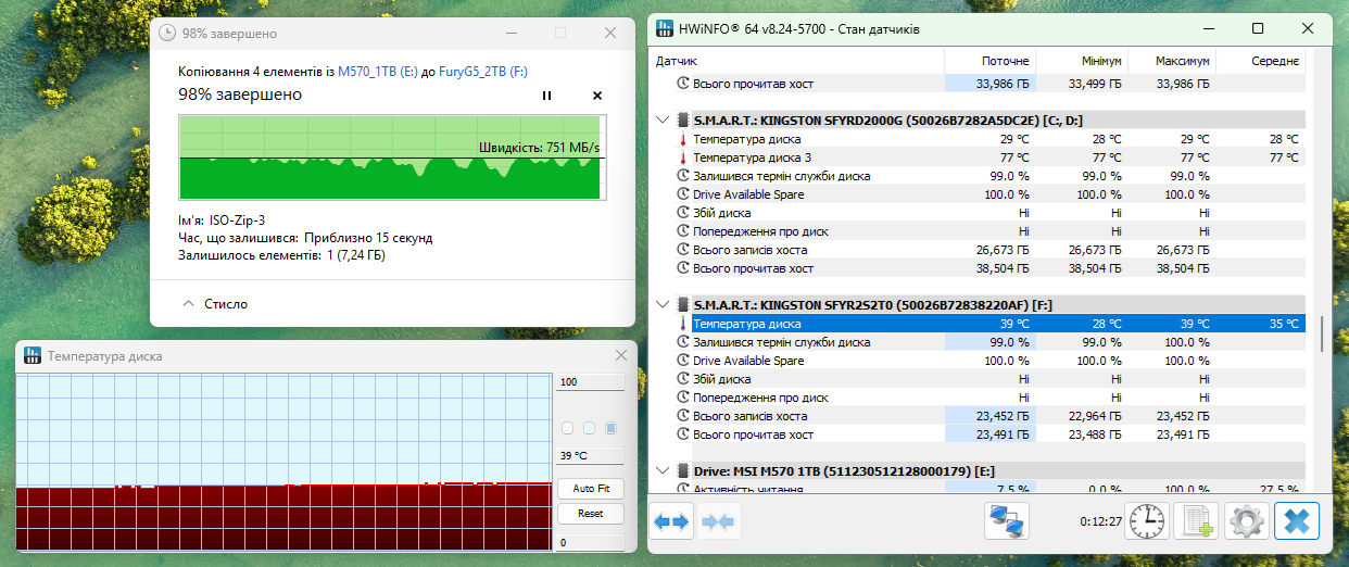 Проверим, как нагревается накопитель внутри этого контейнера, для чего проведем непрерывную запись нескольких больших файлов общим объемом 496 Гбайт.