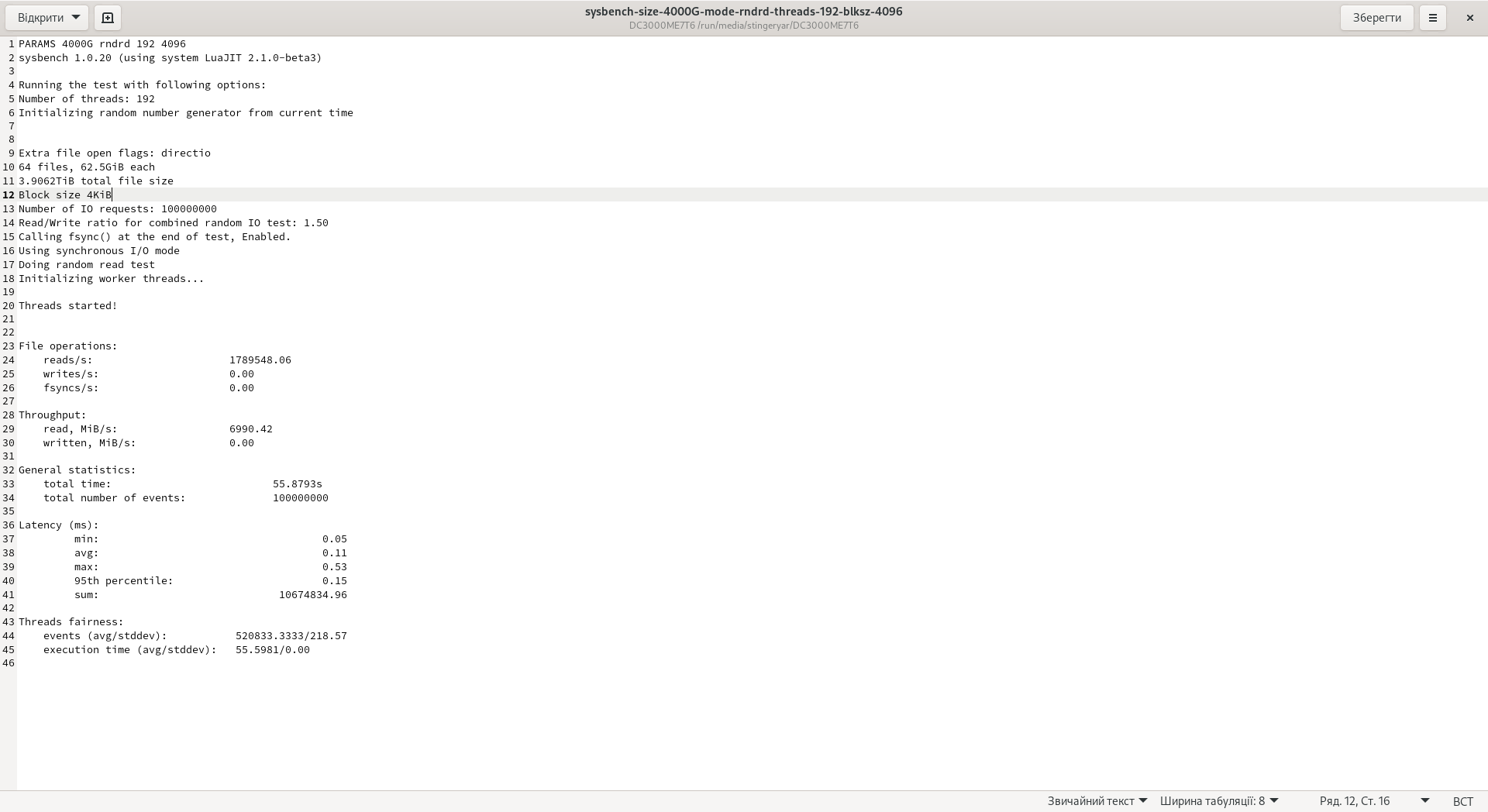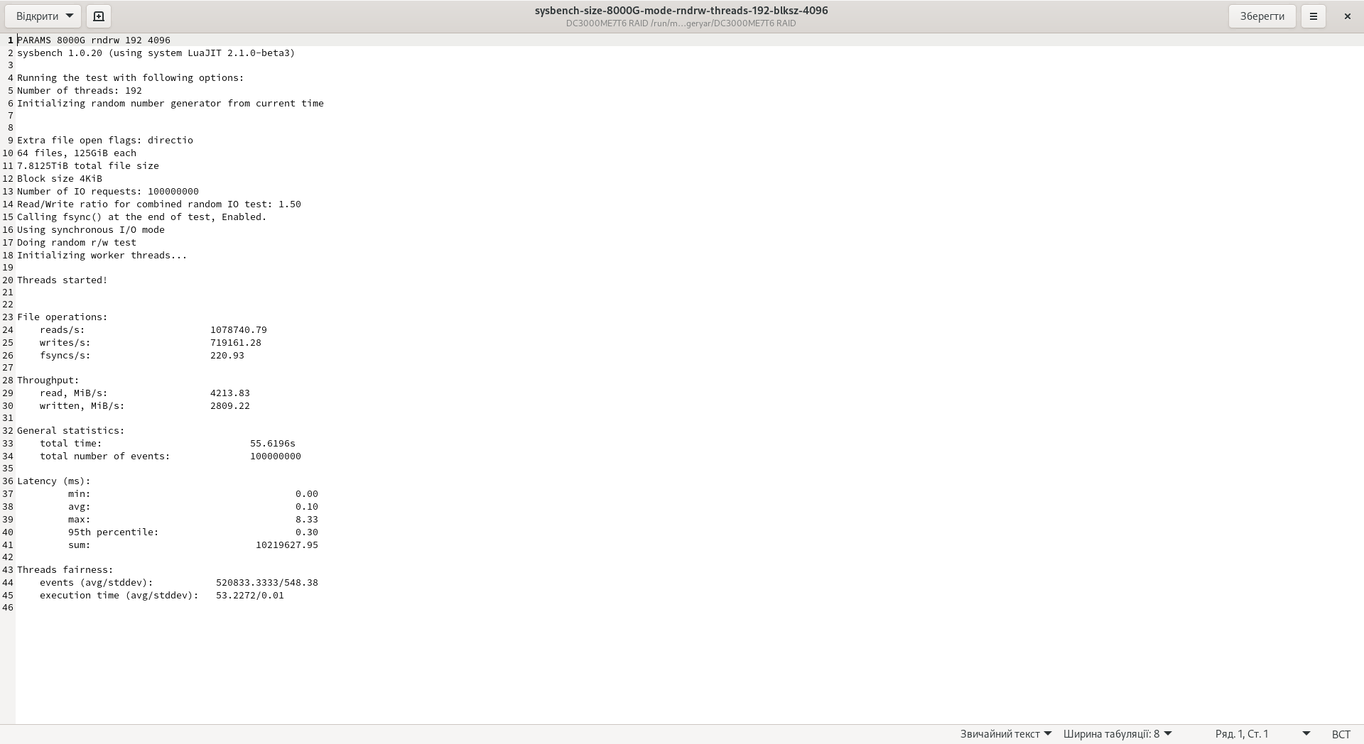 Этот раздел уже не является типичным и требует детального объяснения каждого отдельного аспекта. Далее происходит тестирование в Sysbench. Этот алгоритм использовался на нашем ресурсе уже неоднократно. Тест проводится в режиме случайного чтения (rndrd), случайной записи (rndwr) и гибридной нагрузки чтения и записи одновременно (rndwr). Это происходит в 192 потоках, чтобы эмулировать работу накопителя не только со множеством данных, но и с одновременно активными фоновыми процессами. Для RAID 0 объем создаваемых файлов был удвоен (8 ТБ вместо 4 ТБ). Всего на накопителе будет 64 файла идентичного объема записанных блоками 4K. Скрипт бенчмарка: