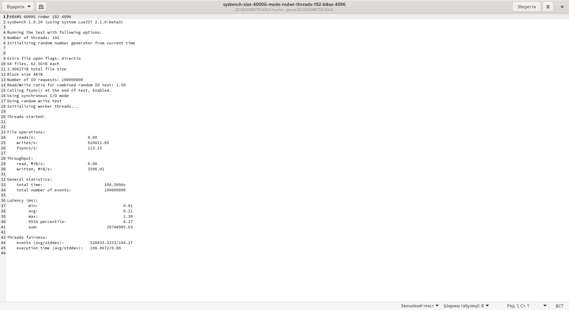 Для случайной записи было достигнуто 3600 МиБ/с, а также 921843 IOPS.