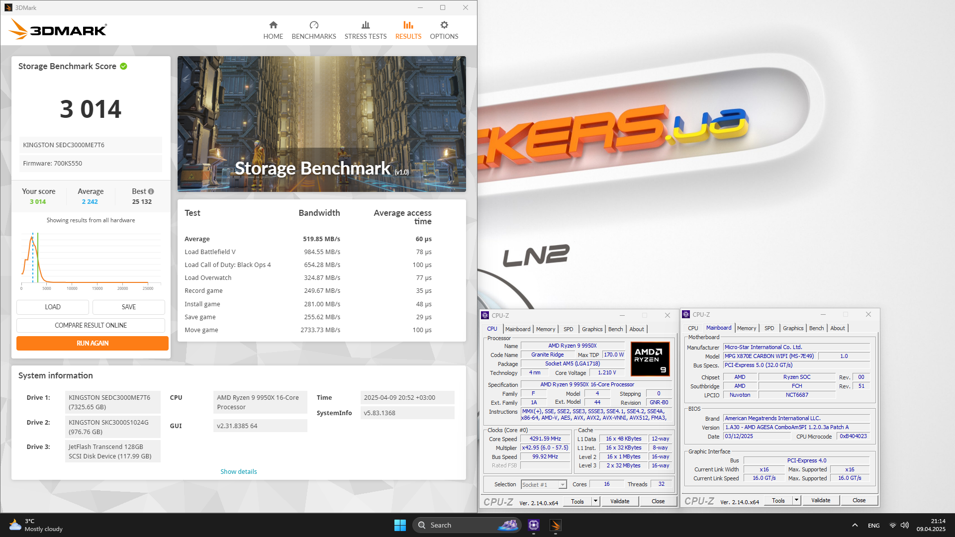 Накопители были подключены к интерфейсу PCIe 5.0 с помощью переходника PCIe > U.2 (JEYI U2-PC5.0) и работали на линиях процессора.
