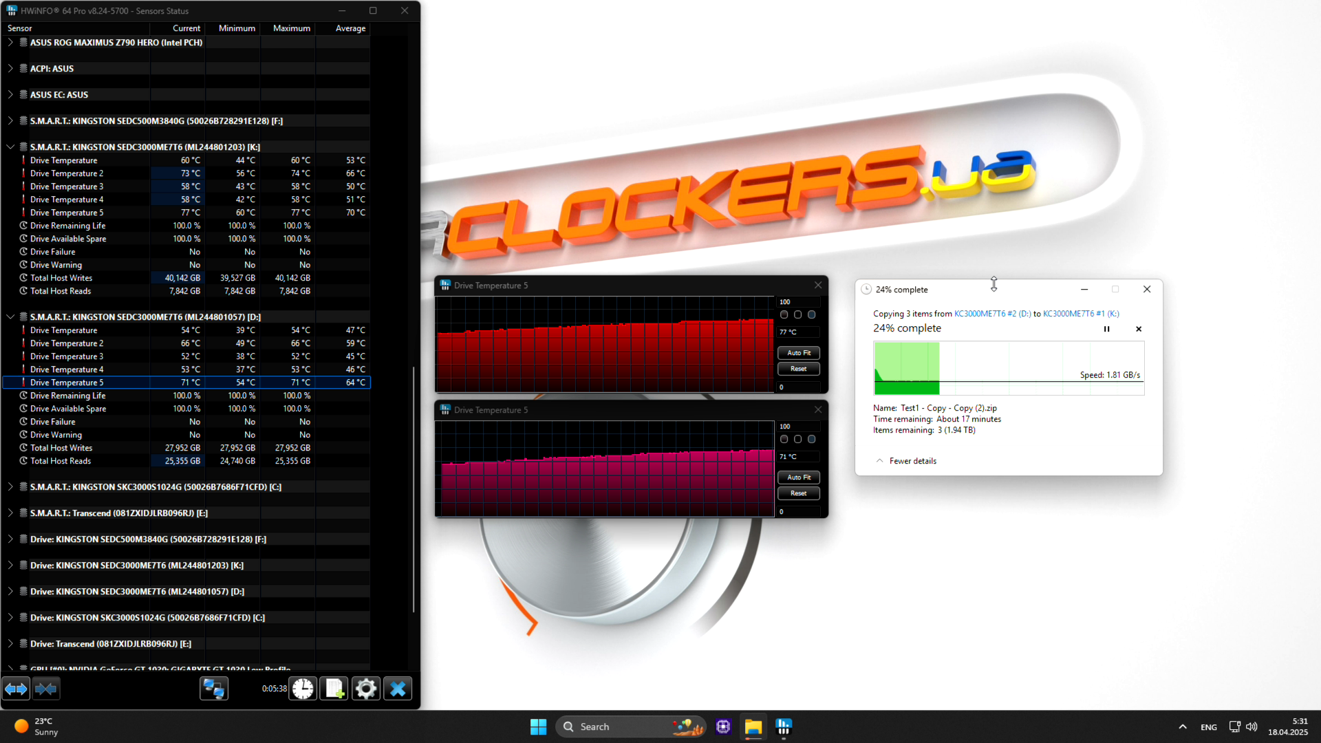 С такой температуры простоя при появлении нагрузки накопитель включил режим троттлинга уже после 40 секунд работы, и снизил скорости записи до 1,9 ГБ/с, а в момент окончания копирования была зафиксирована пиковая температура в 97 градусов. То есть несмотря на заявленную критическую температуру в 85 градусов накопитель продолжал запись без усиления эффекта троттлинга. Похоже Kingston DC3000ME имеет неформальный приоритет быстродействия даже в неадекватных условиях эксплуатации.