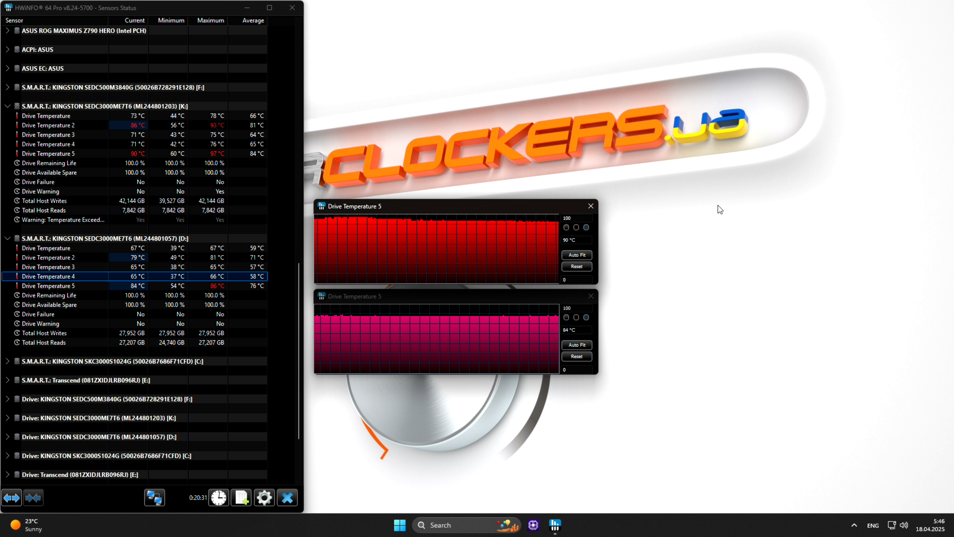 Начнем с температурного режима, сначала с условий, где не будет сквозного продува. Следует заметить, что без ASPM накопитель довольно горячий в режиме простоя, тепловая камера зафиксировала температуру корпуса в 64 градуса по Цельсию, а сам накопитель рапортовал о 67 градусах. HWINFO не смог распознать четкие названия/соответствие датчиков и представлял лишь «Drive Temperature #», поэтому не понятно, какой и к чему относился, а брался наибольший.