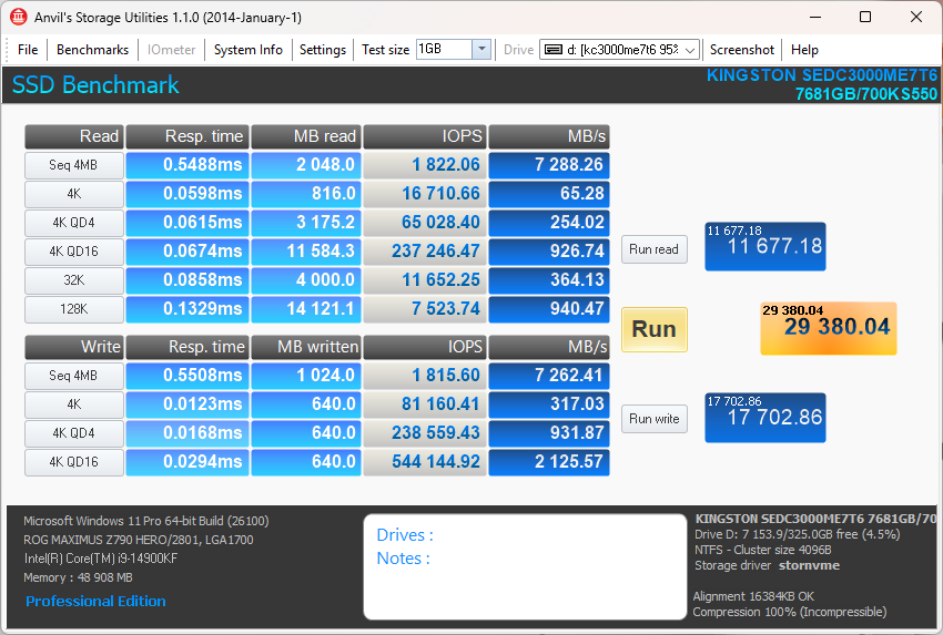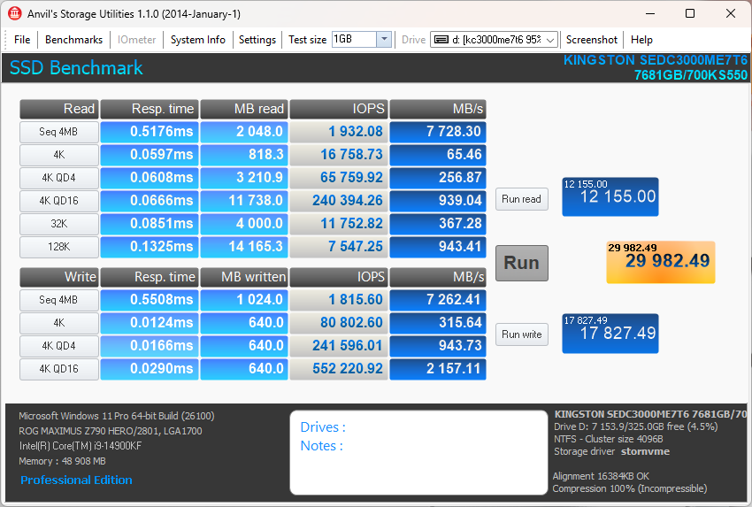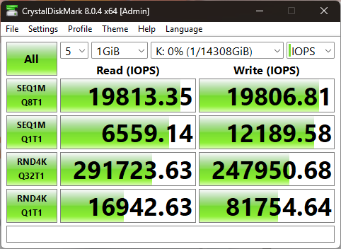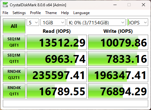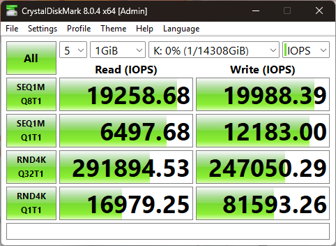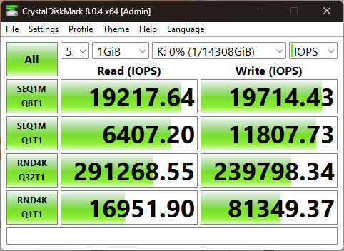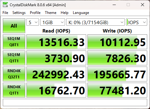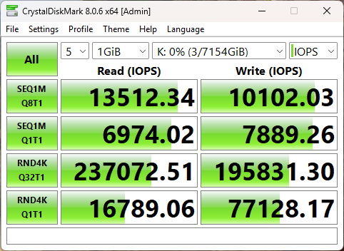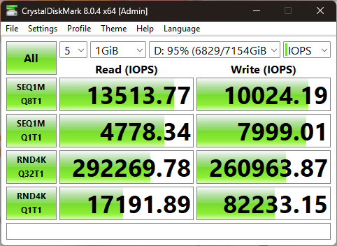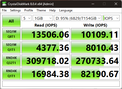 В результате случайного чтения накопитель выдал 6992 МиБ/с (не забывайте, что телеметрия этого теста измеряется в Мебибайтах, а не Мегабайтах), а также 1790000 IOPS.