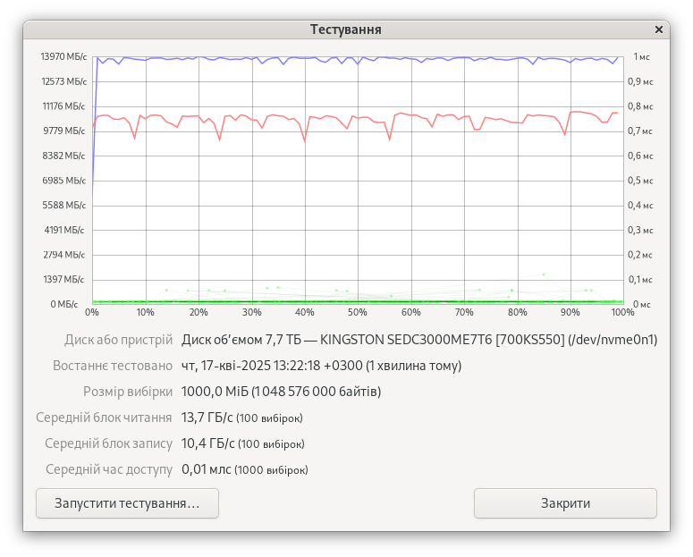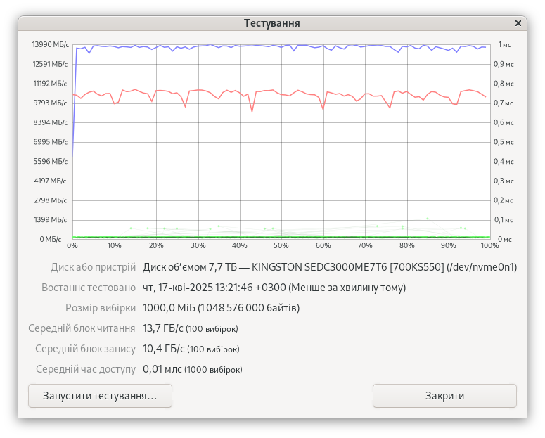 - системный накопитель во время тестирования одного диска: Kingston DC3000ME 7.68TB (SEDC3000ME/7T6);