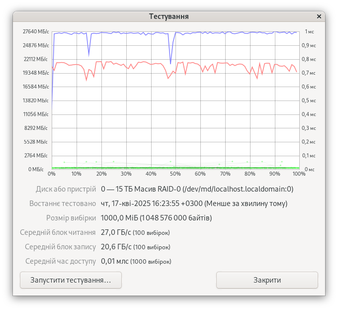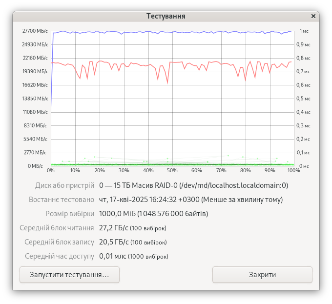 RAID увеличил показатели до 4218 МиБ/с при чтении, а также 2812 МиБ/с при записи. IOPS равнялись 1079810 и 719871 соответственно.