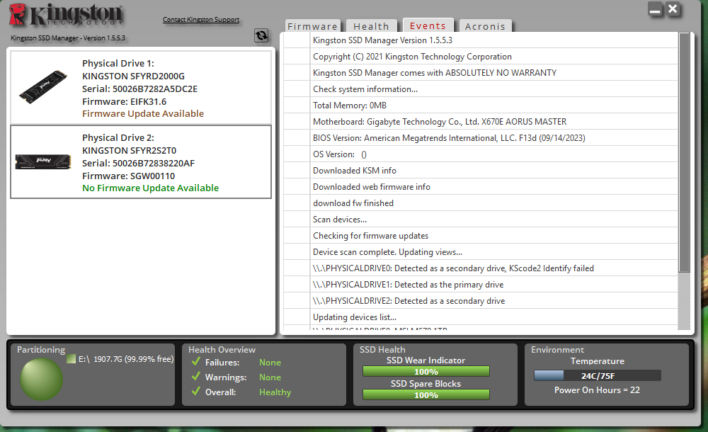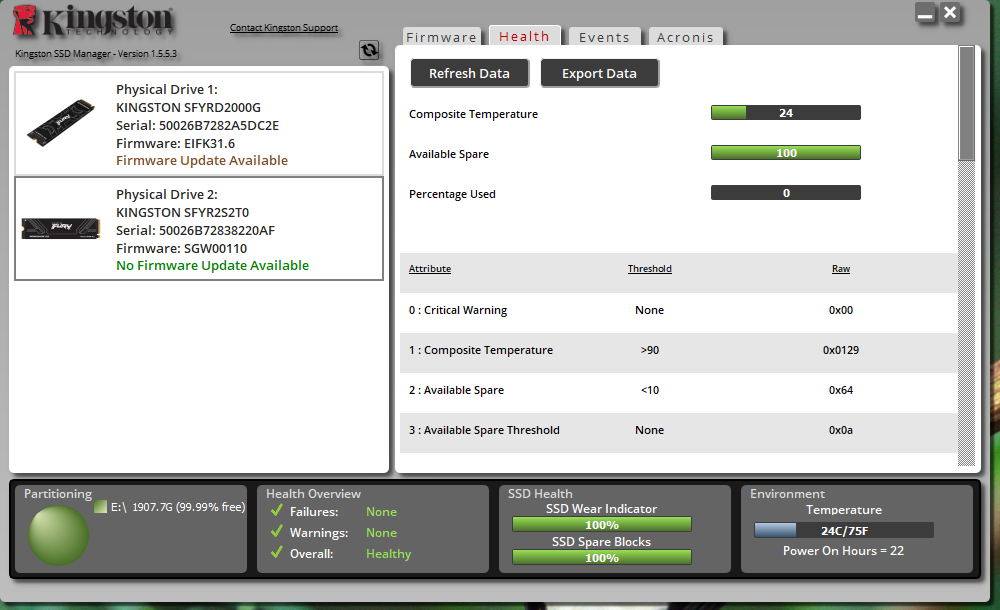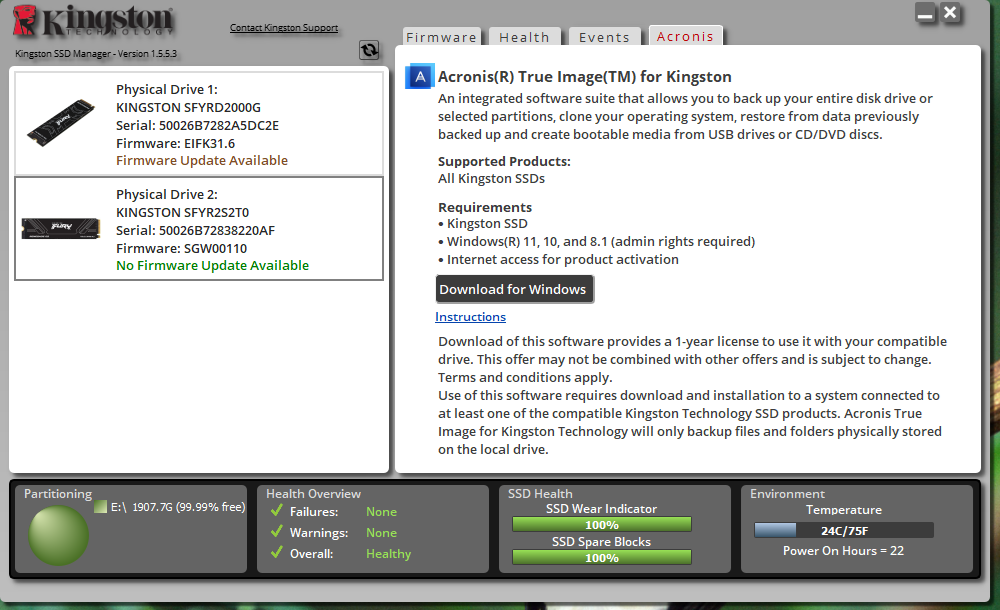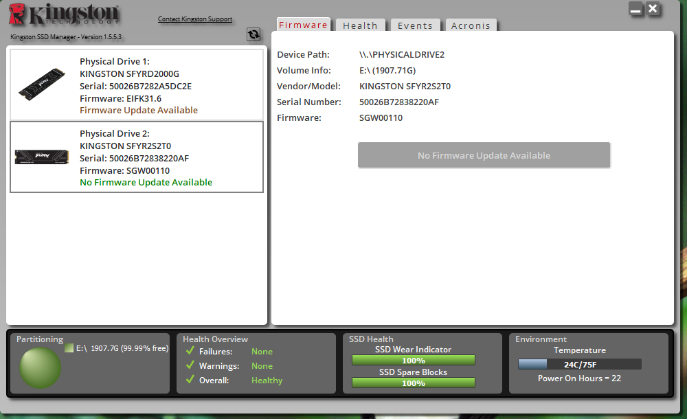 Для мониторинга накопителя производитель предлагает загрузить утилиту Kingston SSD Manager, в которой можно проверить наличие новой прошивки, износ диска, его температуру и просмотреть SMART. Интерфейс программы архаичный, поэтому современным пользователям он может показаться трудным для понимания.
