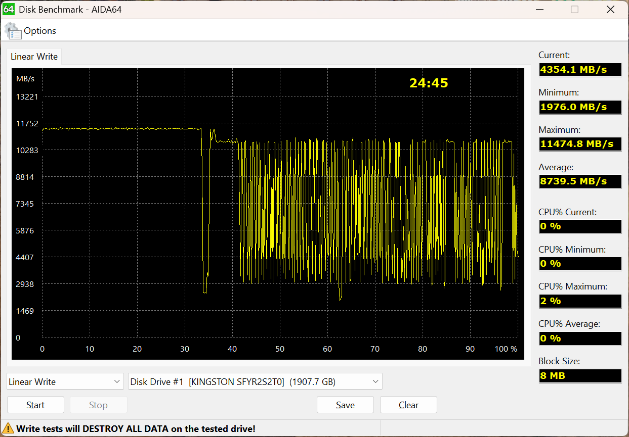 Что ж, запись не такая линейная, как в серверных накопителях, но первые 33% свободного объема запишутся на максимальной скорости в 11475 МБ/с без каких-либо эксцессов. После окончания SLC-кэша и небольшой «задержки» SSD начнет пытаться восстановить производительность, а после — этот процесс перейдет в циклический режим. Минимальная скорость находится на приличном уровне и не падает ниже 1976 МБ/с, хотя в среднем это показатель держится на уровне 3000 МБ/с.