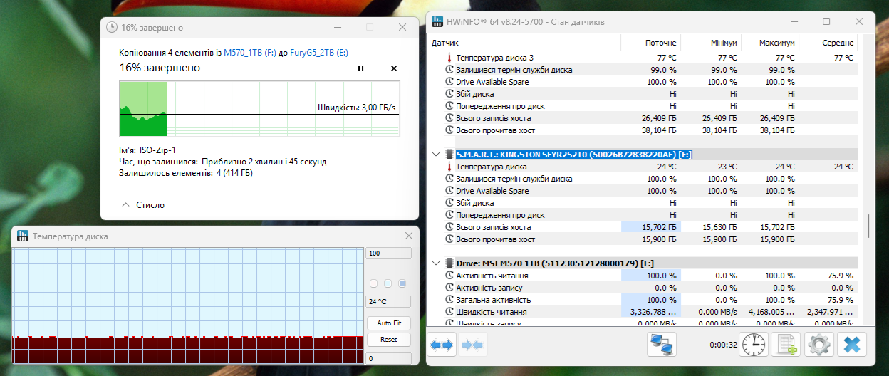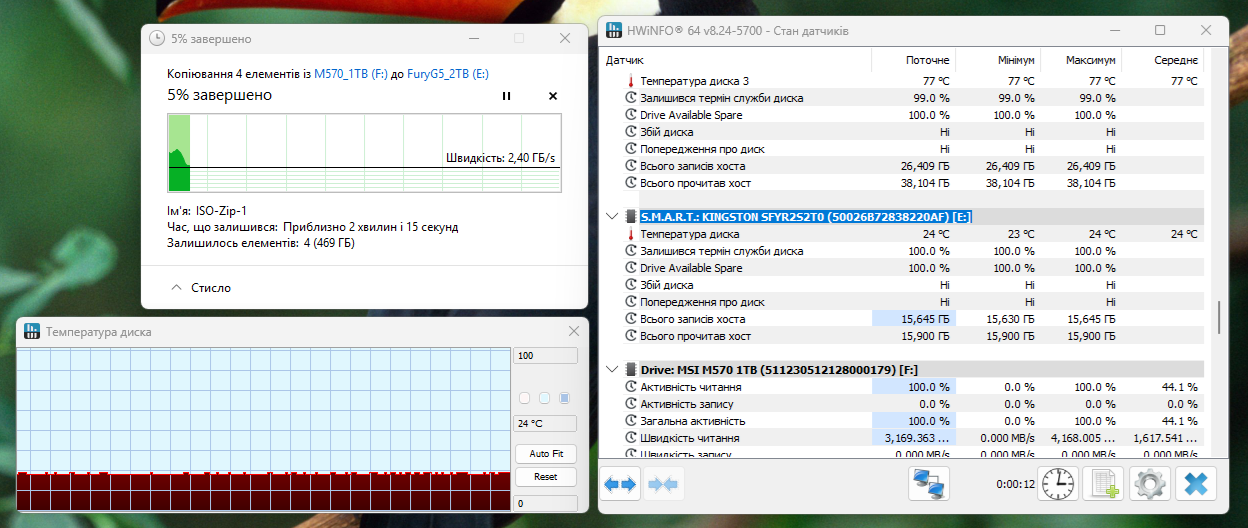 Посмотрим, как происходит запись в реальных условиях, для чего перенесем на Kingston Fury Renegade G5 несколько больших файлов общим объемом 496 ГБ с накопителя MSI Spatium M570, подключенного также к шине PCI Express 5.0.
