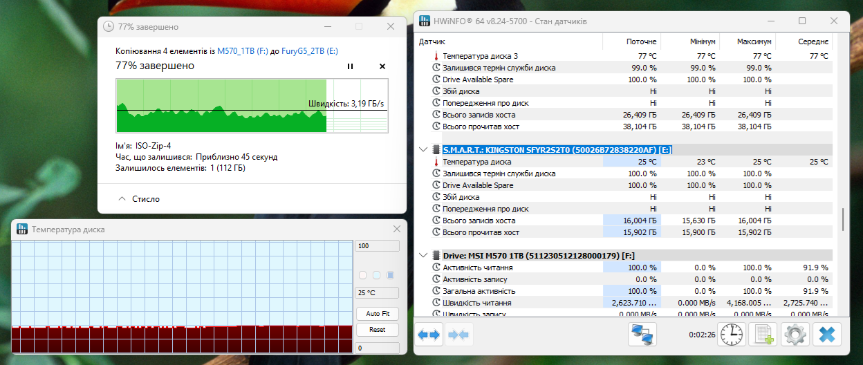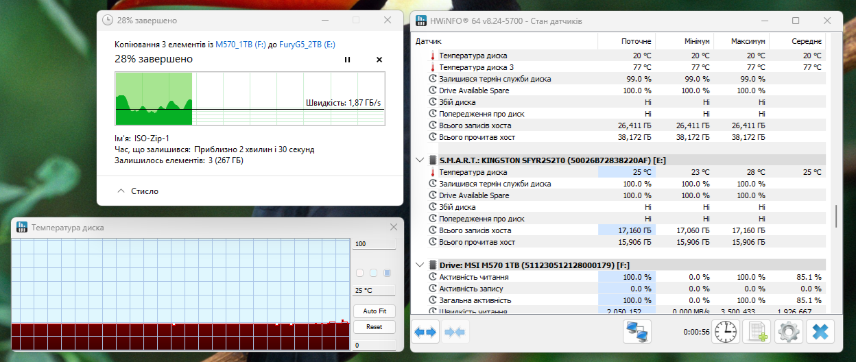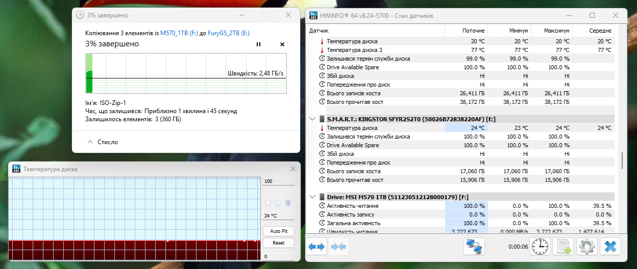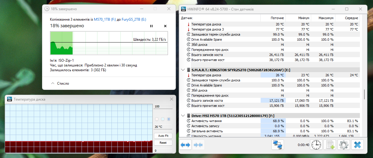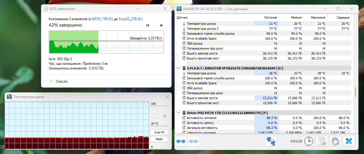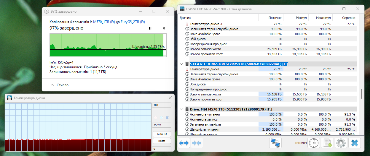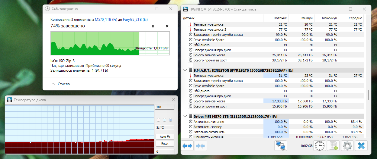 Опять никаких проблем, лишь иногда скорость падает до 1 ГБ/с, но сразу восстанавливается до 2–3 ГБ/с и более. На SSD с контроллером Phison PS5026-E26, которые были у нас на тестировании, такое вряд ли можно было увидеть. Также в отличие от них температура у Kingston Fury Renegade G5 была в два раза ниже под комплектным массивным радиатором для M.2 от материнской платы и дополнительным 92-мм вентилятором, тогда как со Spatium M580, например, наблюдался нагрев SSD до 56 градусов.
