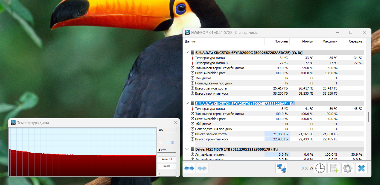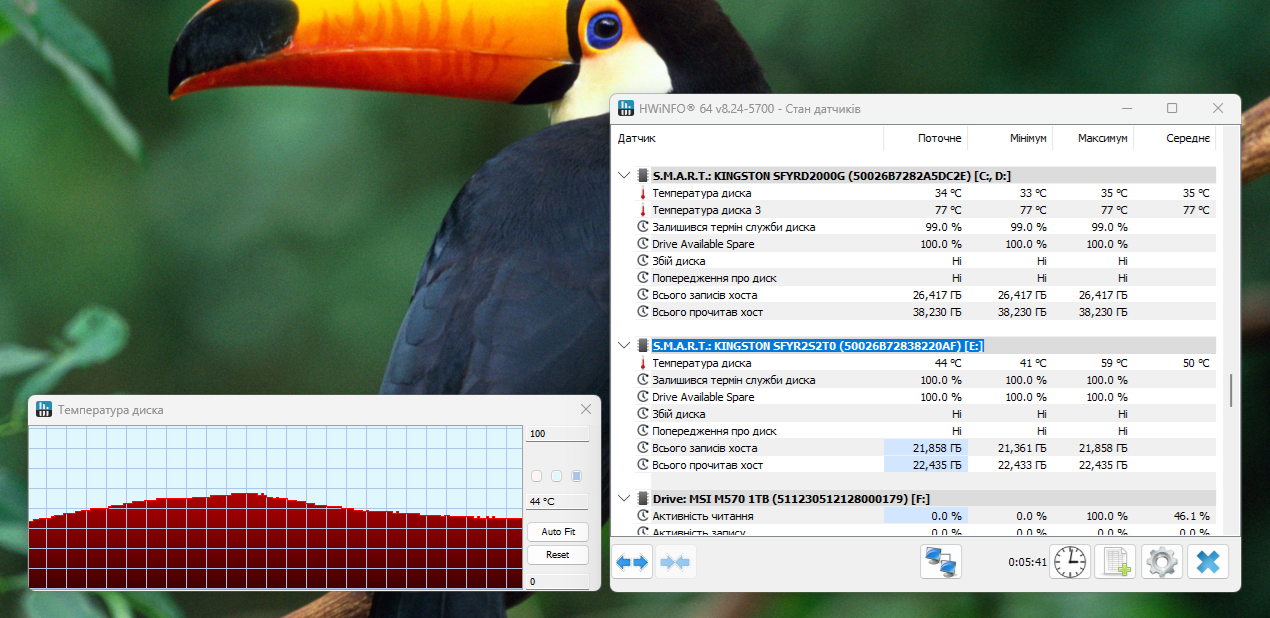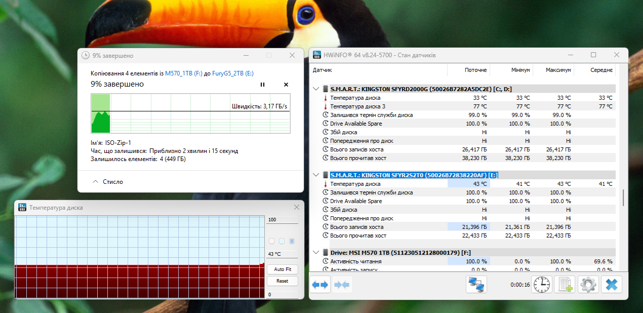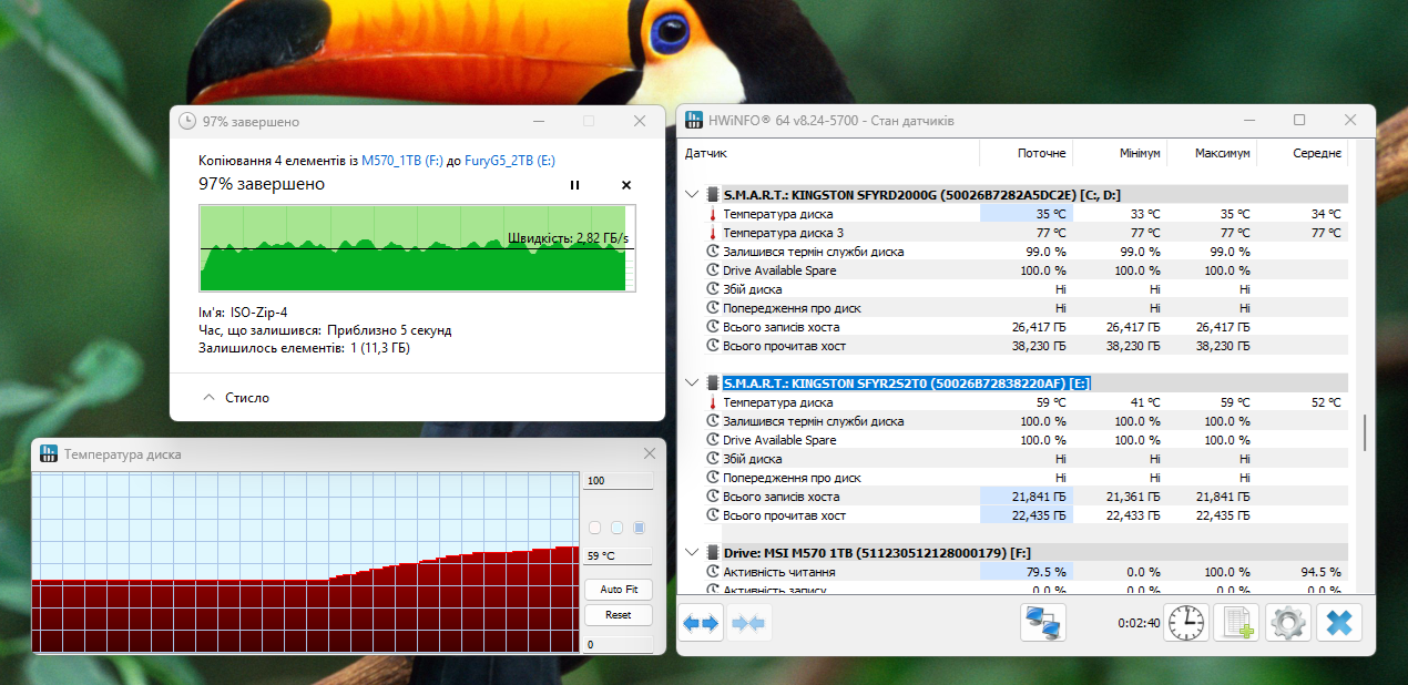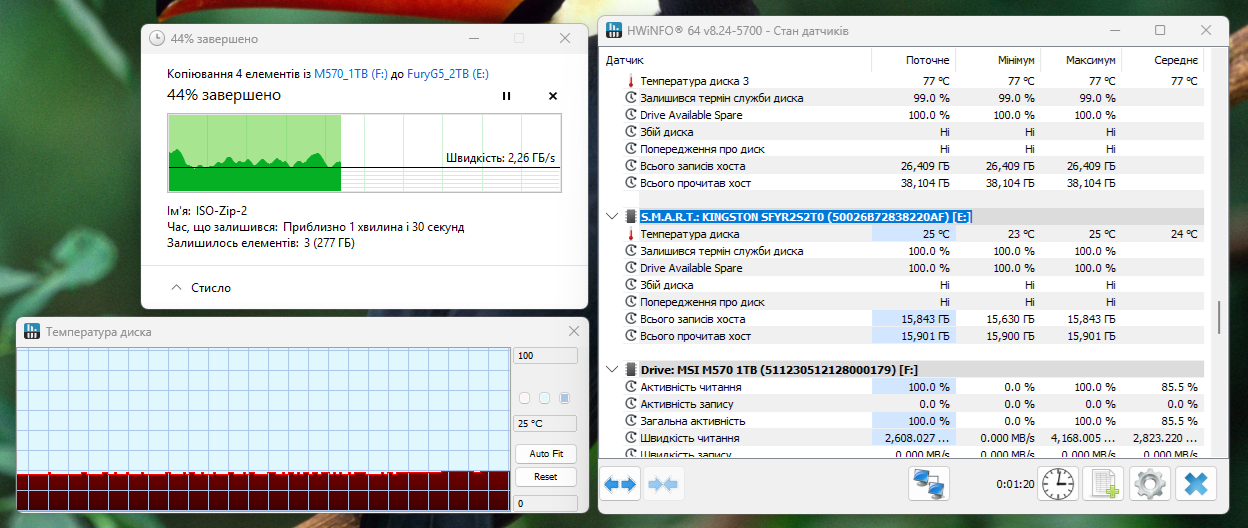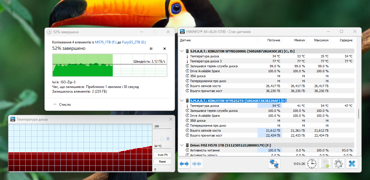 Опять никаких проблем, лишь иногда скорость падает до 1 ГБ/с, но сразу восстанавливается до 2–3 ГБ/с и более. На SSD с контроллером Phison PS5026-E26, которые были у нас на тестировании, такое вряд ли можно было увидеть. Также в отличие от них температура у Kingston Fury Renegade G5 была в два раза ниже под комплектным массивным радиатором для M.2 от материнской платы и дополнительным 92-мм вентилятором, тогда как со Spatium M580, например, наблюдался нагрев SSD до 56 градусов.