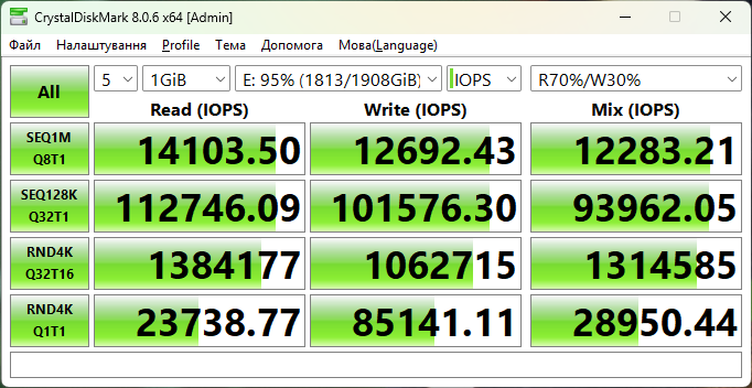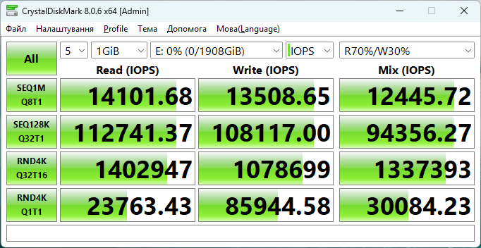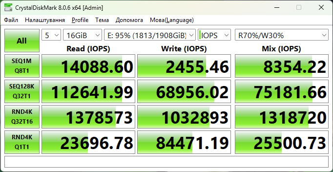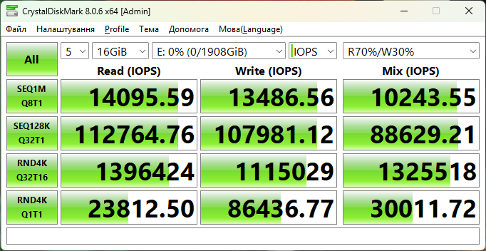 На тестируемом SSD штатными средствами MS Windows 11 64-bit был создан логический раздел с файловой системой NTFS и стандартными настройками кластера, занимающий все доступное дисковое пространство. Для измерения быстродействия использовались следующие программы: