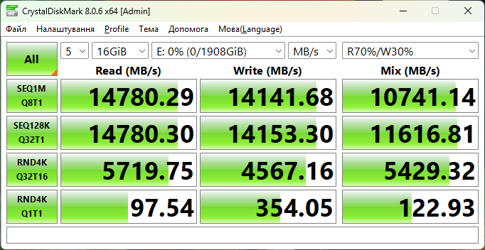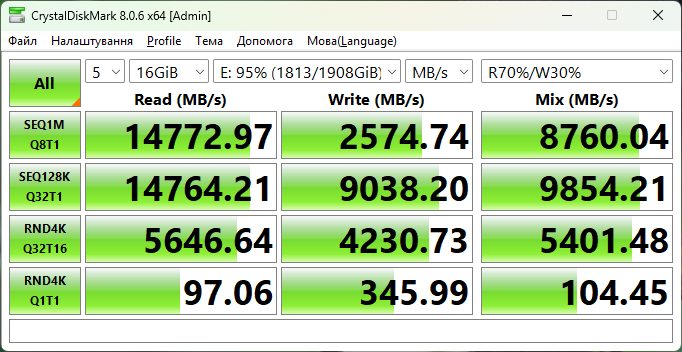 В старом синтетическом пакете скорость получаем немножко большую, чем на других SSD с интерфейсом PCI Express 5.0, которые у нас уже были.