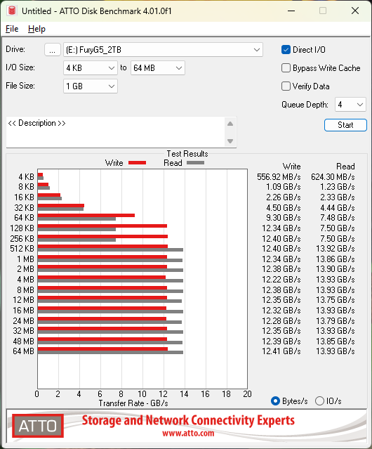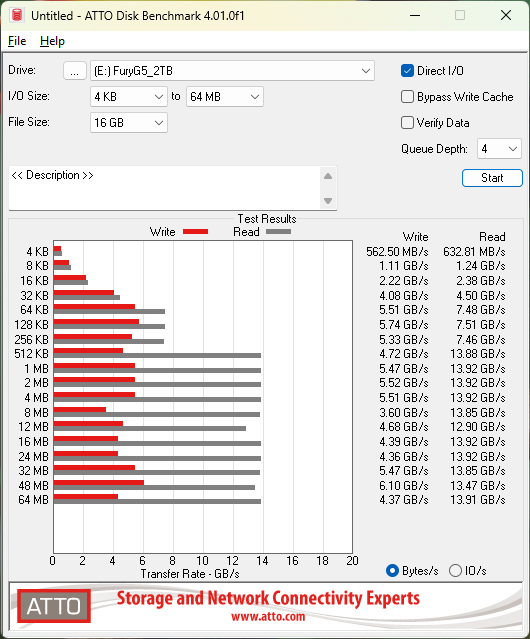 Самый максимальный результат, который мы только получали в этом бенчмарке, показал именно Kingston Fury Renegade G5. Заполнение диска почти никак не сказывается на производительности, лишь увеличение задачи до 16 ГБ немного влияет на быстродействие. Для накопителей на базе PS5026-E26 это было настоящее испытание.
