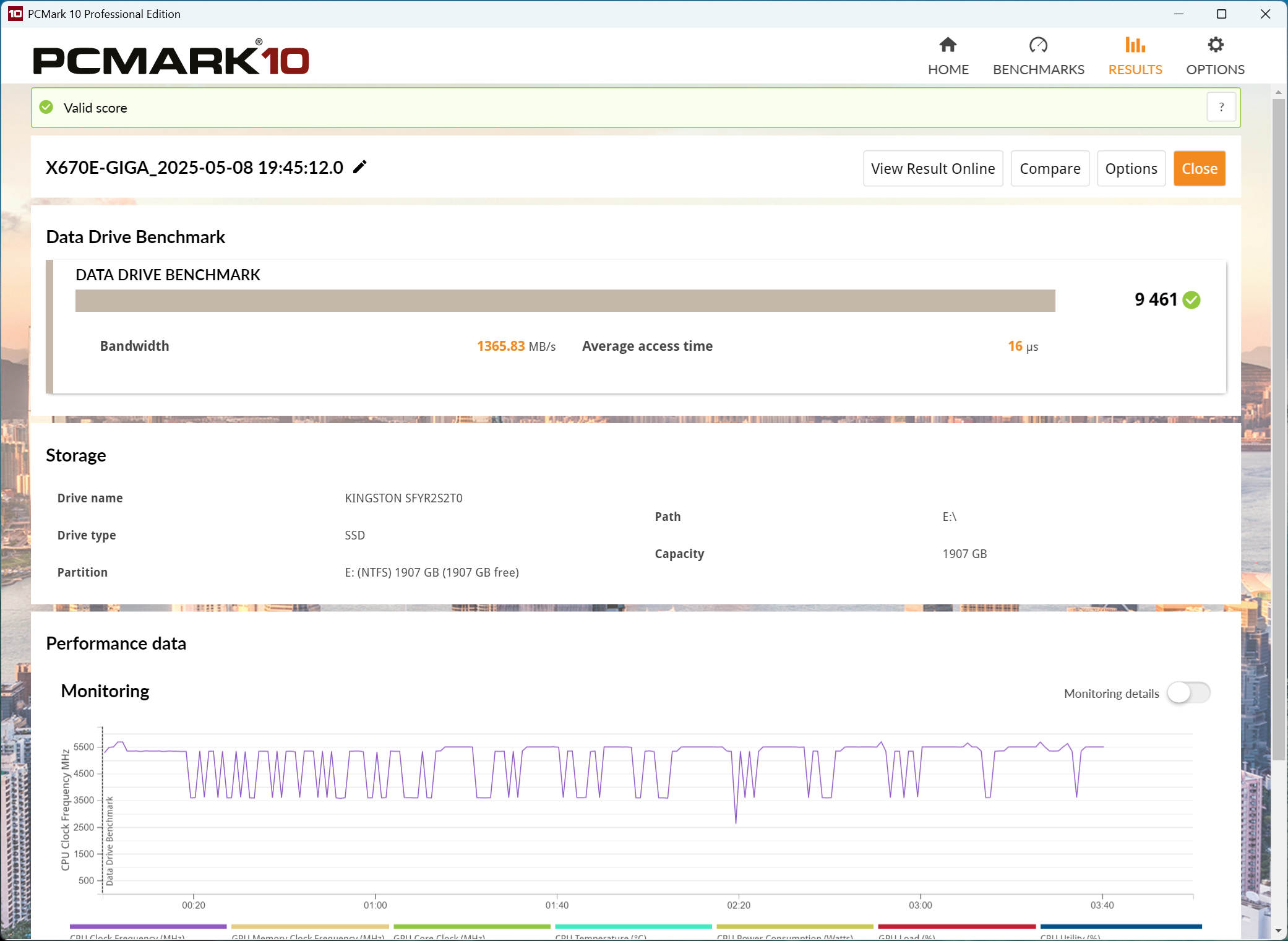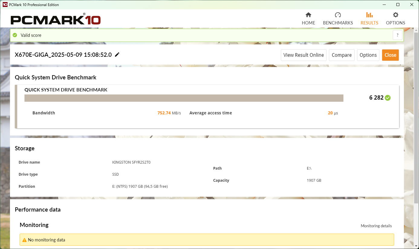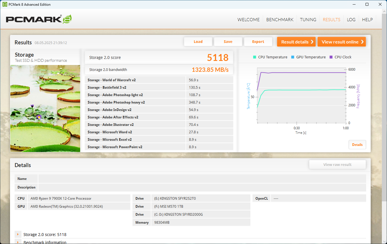 Что ж, результат просто замечательный, без единого радиатора при максимальной нагрузке накопитель нагрелся лишь до 59 °C при 20 градусах в помещении. На Phison PS5026-E26 такой результат был достижим лишь с большим радиатором на базе тепловых трубок.