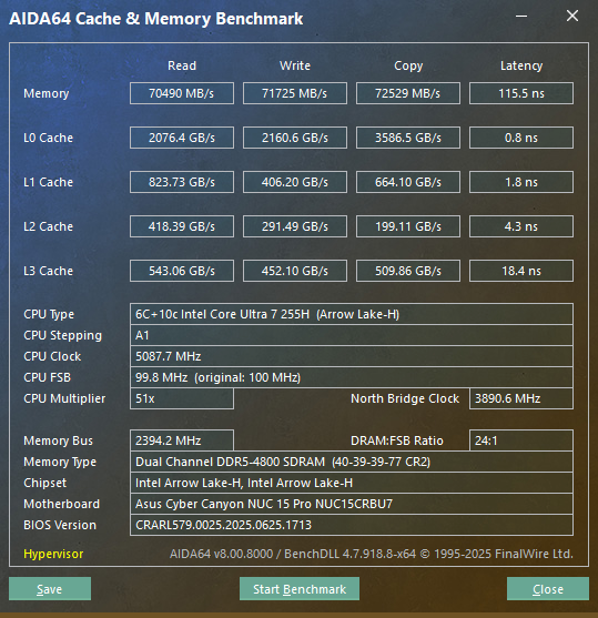 Для проведения тестирования ASUS NUC 15 Pro был укомплектован парой модулей DRAM SO-DIMM DDR5 Crucial CT32G52C42S5. Модули имеют объем 32 ГБ каждый и работают со скоростью до 5200 МТ/с включительно. В роли накопителя выступил SSD Goodram PX600 емкостью 1024 ГБ с интерфейсом PCIe Gen4x4. Модули памяти и твердотельный накопитель были любезно предоставлены компанией Artline. Тестирование проходило под управлением операционной системы Microsoft Windows 11 Pro 24H2 со всеми актуальными обновлениями.